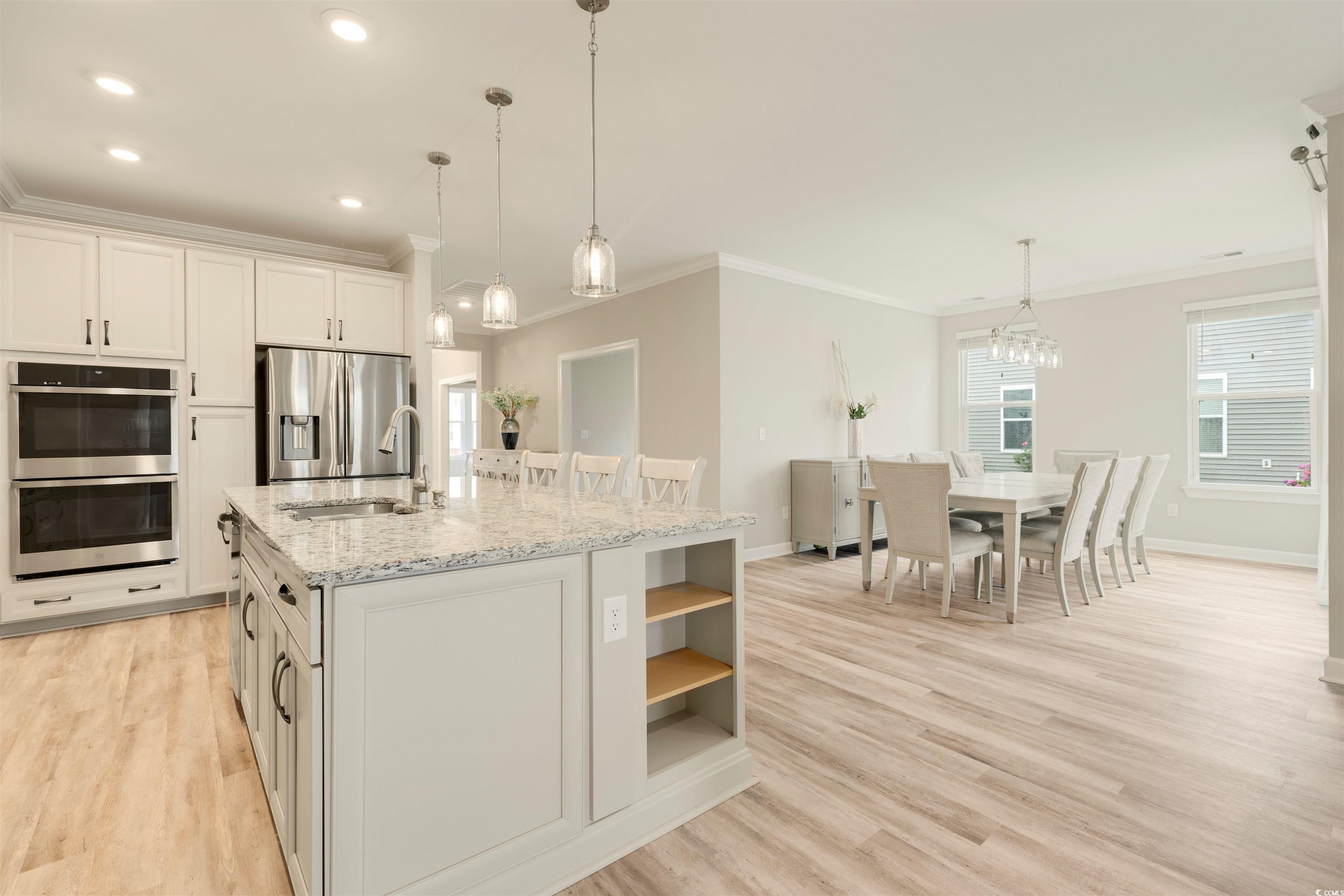 Welcome to this beautifully crafted 3-bedroom, 2-bath Shorebreak style home, built in 2022, offers the perfect combination of elegance and functionality. Inside, you’ll find LVP and tile flooring throughout—no carpet—along with a spacious, open layout. The kitchen is equipped with stainless steel appliances, a double oven, and a large dining area ideal for gatherings. The master suite boasts a high-end ivory custom closet and a spa-like bathroom with a double vanity, soaking tub, and walk-in shower. Outdoor living is a dream with a 523+ sq ft paver patio accented by a cobblestone border, a built-in gas fire pit, and an extra gas line ready for a future grill or outdoor kitchen. The fenced-in backyard features a smooth-top aluminum fence with gate openings on both sides of the home. Also, enjoy the tiled front and back porches and a roomy 2-car garage complete with upgraded grey flake epoxy coating. This home is packed with upgrades and built for both elegance and everyday comfort. Located in the vibrant Bridgewater community with great amenities including a resort style pool and pickleball court, and just minutes from all that Little River and North Myrtle Beach have to offer! Hurry and don’t miss your opportunity to make it yours!