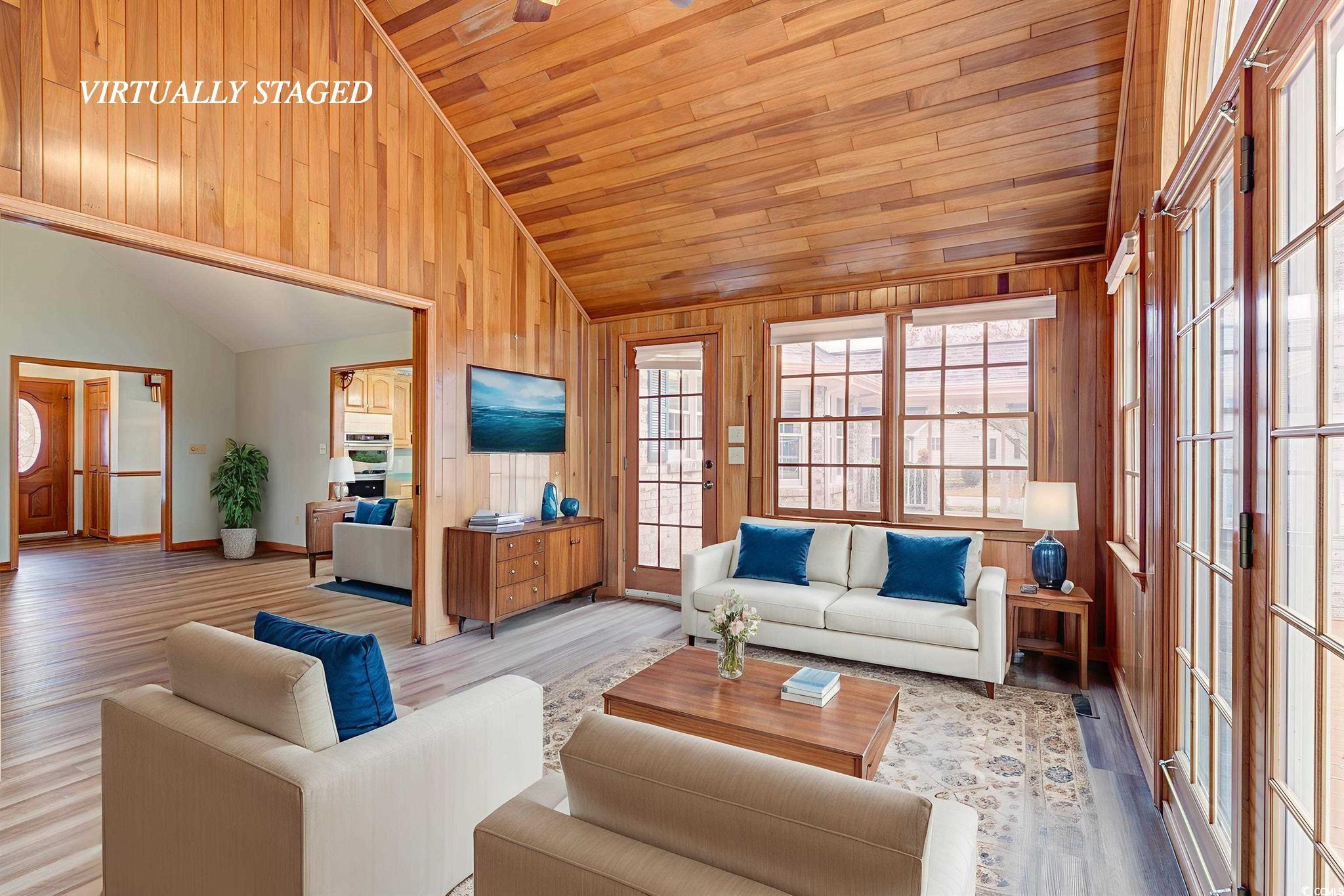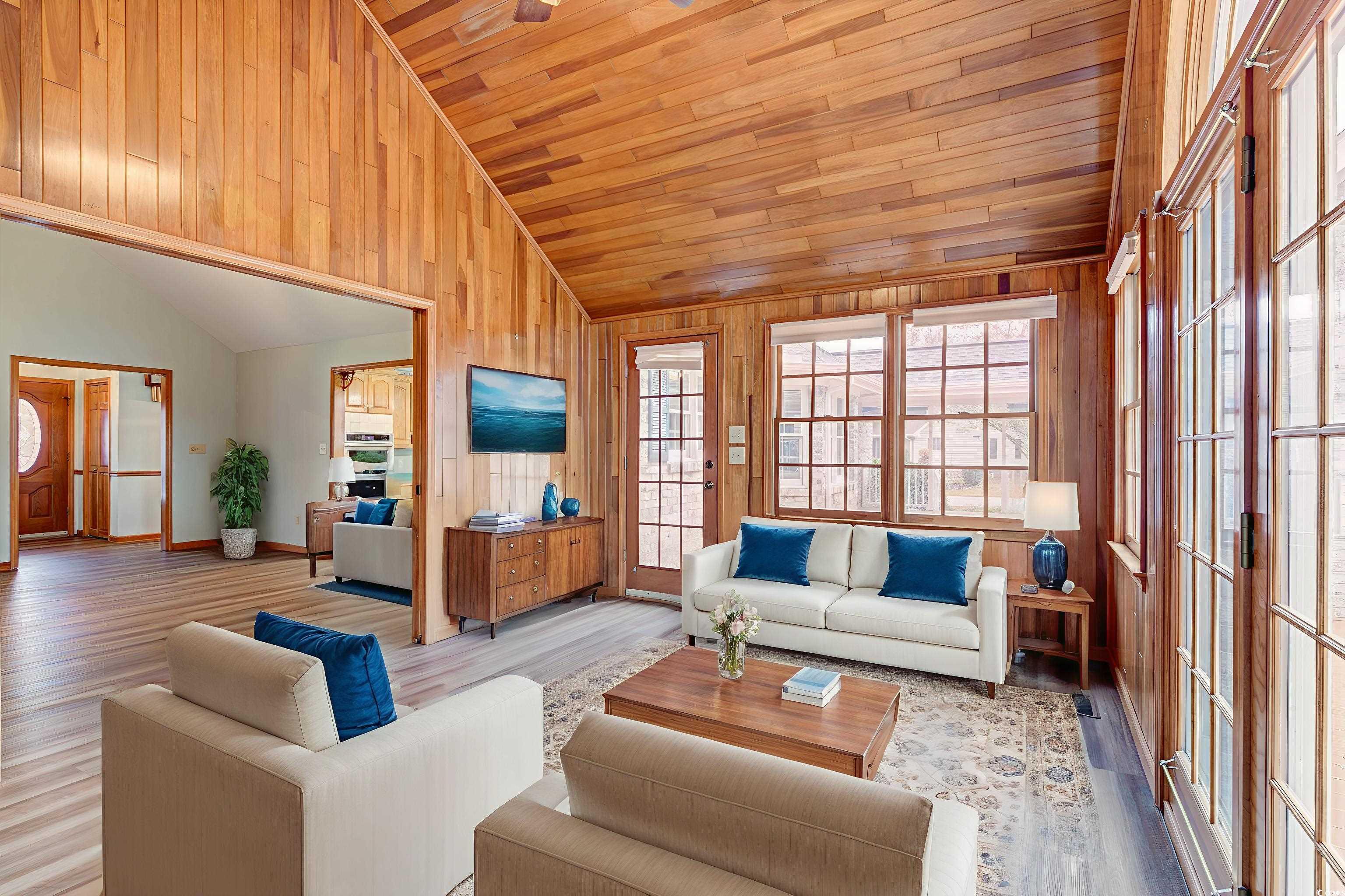 Wake up to calm water views and coastal life in a community designed for relaxed, everyday living. Nestled on a quiet cul-de-sac corner lot in The Lakes, this 3-bedroom, 2-bath coastal home blends timeless craftsmanship, generous space, and warm wood finishes to create a peaceful retreat you’ll love coming home to. The front porch is roomy enough for rocking chairs and welcomes you as you enter through the beautifully detailed glass front door. The wide foyer seamlessly connects the formal living and dining rooms—perfect for gatherings and special occasions. Continue into the comfortable family room, featuring a vaulted ceiling and a charming brick gas fireplace, truly the centralized heart of the home. The family room opens to a kitchen and generous breakfast area, where you'll find an impressive amount of original warm wood cabinetry, a cooktop on the work island, wall oven/microwave combo, desk area, and abundant counter space. Just off the main living space is the paneled Carolina room, surrounded by windows that fill the room with natural light and offer views of the backyard. A French door and side door provide easy access to the large back deck—perfect for entertaining and enjoying outdoor living. The spacious owners suite with two walk-in closets, soaking tub, shower and double vanity is convenient to the laundry and kitchen. This split bedroom plan has two guest bedrooms, a full bath and linen closets located just beyond the family room. The home also features a dedicated laundry/mud room complete with a sink and built-in cabinets for extra storage. Outside, you'll find a detached two-car garage with a spacious room above—ideal for a workshop, storage, and a second floor room for additional flex space. The large deck connecting the home and garage creates a wonderful outdoor courtyard feel for entertaining or relaxing. With its original custom woodwork, thoughtful layout, and serene setting, this well-cared-for property offers both character and comfort—an exceptional opportunity to own a true original.