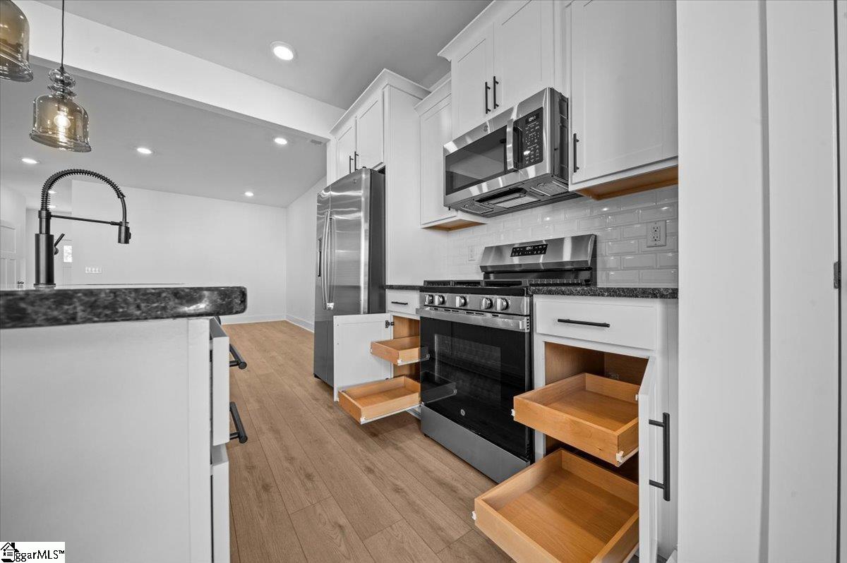 Welcome to Hickory Heights! New townhomes in Greenville County. we are a low-maintenance community ideally located just 10 minutes from both Downtown Greenville and Travelers Rest. SIMPLIFY YOUR MOVE! All homes feature the move-in package boasting a refrigerator, washer, dryer, dishwasher, microwave, in-sink disposal and white faux wood blinds. This Litchfield townhome features almost 1600 square feet of living space and is ready for you to make your own. Upon entering the spacious foyer and continuing down the hall, you will fall in love with the open living and kitchen space with 9 foot ceilings, a perfect area for entertaining. The oversized island with dark granite countertops and beautiful white cabinetry give the kitchen a bright feel along with stainless steel gas appliances including a refrigerator. The patio off the kitchen allows for outdoor living and also offers extra storage in the outdoor closet. Upstairs you come to the large Primary Suite that features an ensuite bathroom with double vanities, generous walk in closet and 5 foot step in shower with glass door. Two more spacious bedrooms, full bath, and laundry area with washer/dryer included complete the second floor. Blinds are also included throughout the home! The 1 car garage and double parking pad give a convenient and versatile combination for car storage and parking. Smart home technology, energy-efficient design, and a dedicated local warranty team ensure long-term comfort and convenience. An added plus is lawn maintenance is included so you will have more time to enjoy your new home. Enjoy easy access to city life, local dining, outdoor recreation, and area attractions like the Swamp Rabbit Trail and Paris Mountain State Park. There are plenty of entertainment and dining opportunities around, being centrally located near shopping and restaurants in Downtown Greenville (5 Miles), Cherrydale (5 Miles), Traveler's Rest (7 Miles), Easley (10 Miles) and Berea. Just a 6 minute drive from the beautiful Furman University campus along with quick/convenient access to The Swamp Rabbit Trail. Spend your day visiting one of the four state parks in the nearby area (Caesars Head, Paris Mountain, Table Rock, and Jones Gap). Come by today for your personal tour and make this home your own. See Sales Agent for additional pricing information.