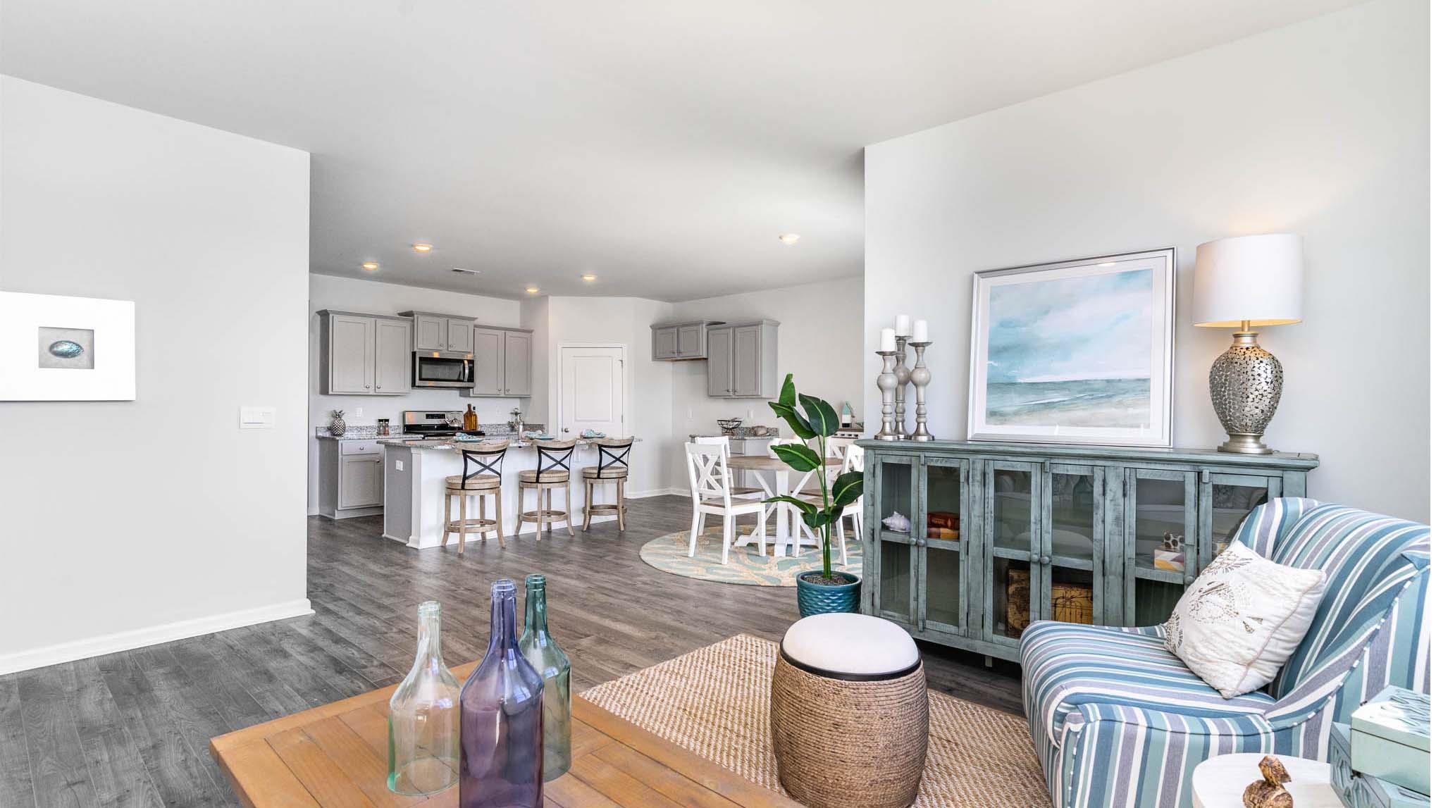 This thoughtfully designed one level home is one of our most popular floor plans! With an open concept living room, dining room and kitchen, this home is bright, spacious, and designed for entertaining guest or comfortably interacting with family. The kitchen features granite countertops, 36" cabinets, a walk in corner pantry, stainless steel appliances including a refrigerator, and island with breakfast bar! Your primary suite awaits off the back of the home with a spacious walk-in closet and master bath with double sinks, a linen closet and 5' shower. Three secondary bedrooms are at the front of the home providing separation from the primary suite. Enjoy the coastal air from the back porch as you wind down in the evening! Blinds will be included throughout the house on all standard sized windows. 2 car garage with garage door opener. This is America's Smart Home! Each of our homes comes with an industry leading smart home technology package that will allow you to control the thermostat, front door light and lock, and video doorbell from your smartphone. *Photos are of a similar Cali home. Pictures, photographs, colors, features, and sizes are for illustration purposes only and will vary from the homes as built. Home and community information, including pricing, included features, terms, availability and amenities, are subject to change and prior sale at any time without notice or obligation. Square footage dimensions are approximate. Equal housing opportunity builder.