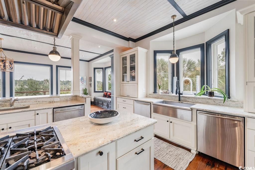 Welcome to 5188 Timber Race Course, a rare two-dwelling waterfront estate on just over two acres—a self-sustaining island oasis with all the conveniences of the prestigious Stono Ferry community nearby. Winding down the private peninsula driveway, you’ll be greeted by a tranquil koi pond before arriving at this serene retreat. Inside, expansive water views draw your eye to open living spaces anchored by a wood-burning fireplace. A chef’s kitchen and broad porches invite seamless indoor-outdoor living. From here, the primary suite flows gracefully into its own private wing, where the bedroom and spa-inspired bath create a secluded sanctuary apart from the main gathering spaces. This thoughtfully designed compound also features a second-floor gym overlooking the Stono River, complete with its own balcony for sunning and river breezes. Additional self-sufficient comforts include a gas-powered generator and a climate-controlled garage with stainless steel sink—ideal for gardening or dog washing. A private deep-water dock with lift and floating dock accommodates larger vessels, providing direct access to the Intracoastal Waterway via the Stono River—perfect for fishing, cruising to Charleston, or docking at Bohicket Marina. The detached guesthouse—approximately 800 square feet—offers a private haven with a full kitchen, bedroom, and living area, perfect for guests or multigenerational living. Beyond, irrigated raised beds support a true farm-to-table lifestyle. Ownership at Stono Ferry brings premier amenities: a championship golf course, equestrian facilities, junior Olympic pool, tennis and pickleball courts, clubhouse dining, walking trails, and the celebrated Charleston Cup Steeplechase. Live as if on your own private peninsula—while still connected to Charleston, Kiawah, shopping, dining, and the rich history and charm of the Lowcountry.