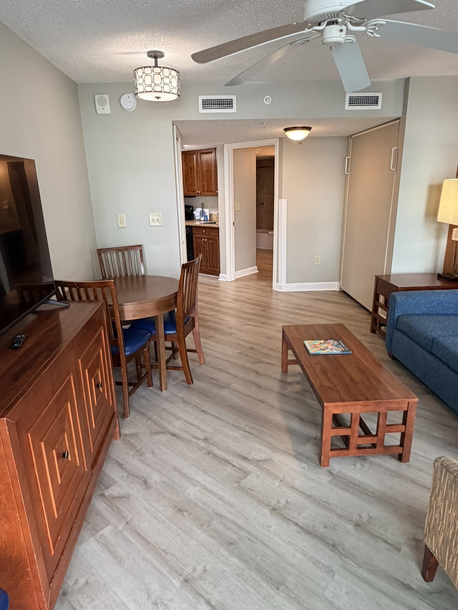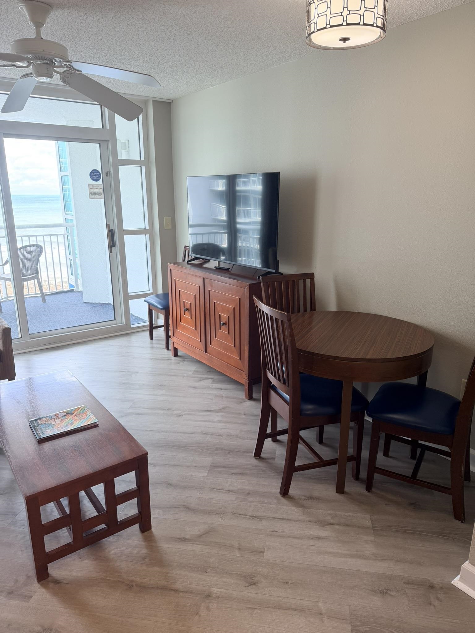 Welcome to Dunes Village Resort, perfectly situated at the end of Myrtle Beach’s prestigious Golden Mile, offering unmatched amenities and year-round enjoyment. This beautifully furnished, true one-bedroom villa boasts stunning ocean views and recent upgrades including NEW LVP flooring installed January 2025 and new beds and a sofa bed in 2024. The spacious floor plan comfortably sleeps up to 8 guests, featuring two queen beds in the bedroom, plus a sleeper sofa and Murphy bed in the living area. The full kitchen is equipped with granite countertops, stove, microwave, full-size refrigerator, and dishwasher. Additional highlights include a full bath, washer and dryer, and two televisions—everything you need for a relaxing stay or strong rental performance. Step onto your private balcony and take in breathtaking ocean views, then enjoy one of the most amenity-rich resorts on the beach. Dunes Village offers two indoor water parks with pools, lazy rivers, hot tubs, kids’ splash areas, and four indoor water slides, plus multiple outdoor pools. The resort also features tennis and basketball courts, beach volleyball, putt-putt golf, playground, fitness center, onsite spa, year-round activities program, two restaurants, and a Starbucks. This property is ideal as a vacation getaway or an income-producing investment with access to one of the beach’s top rental programs. Close to all of Myrtle Beach’s premier attractions, this is your chance to own a true piece of paradise.