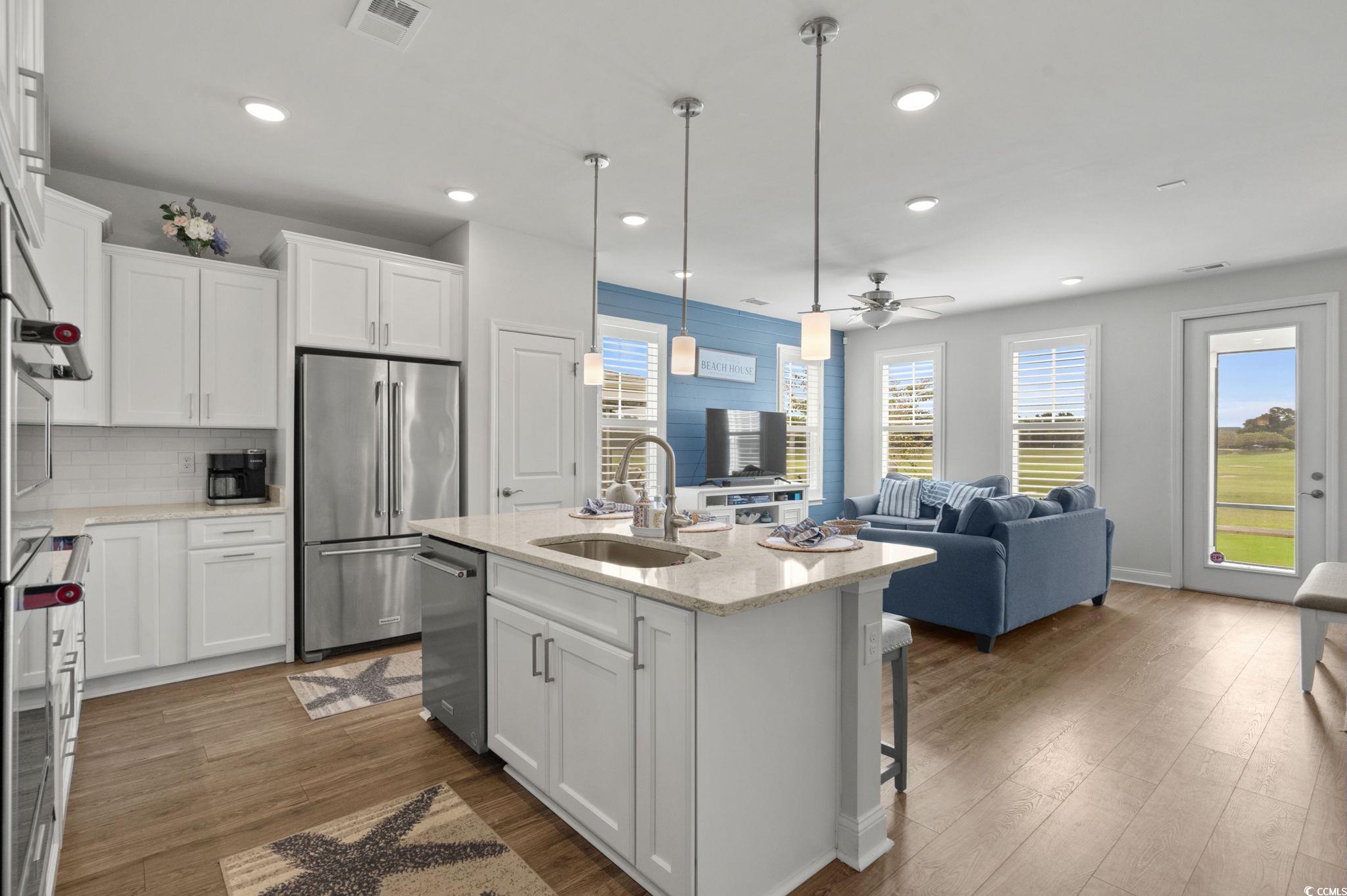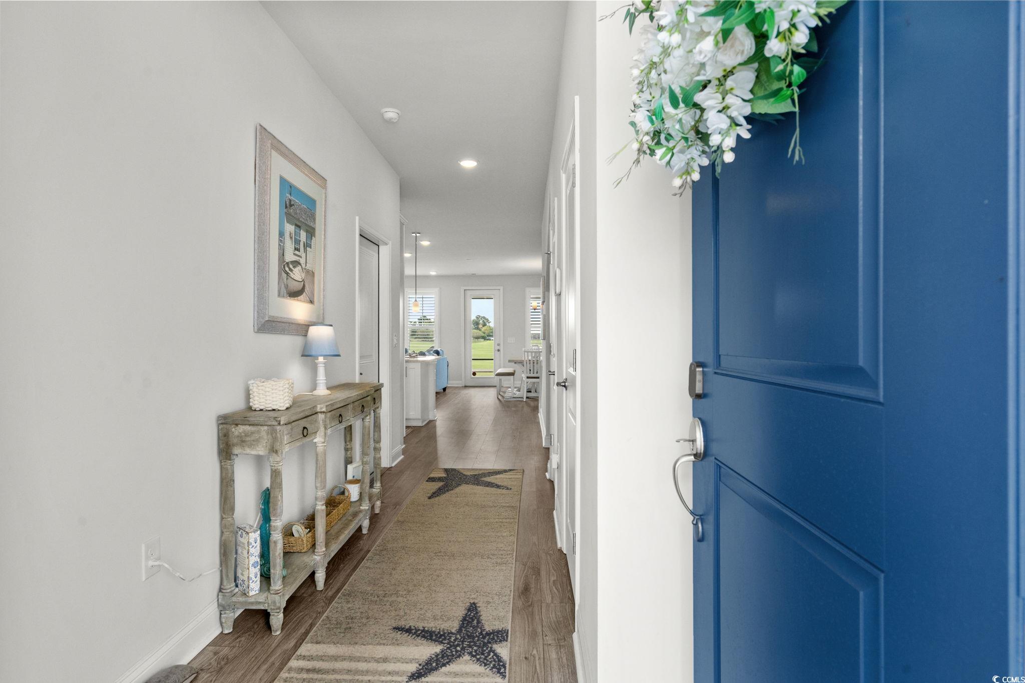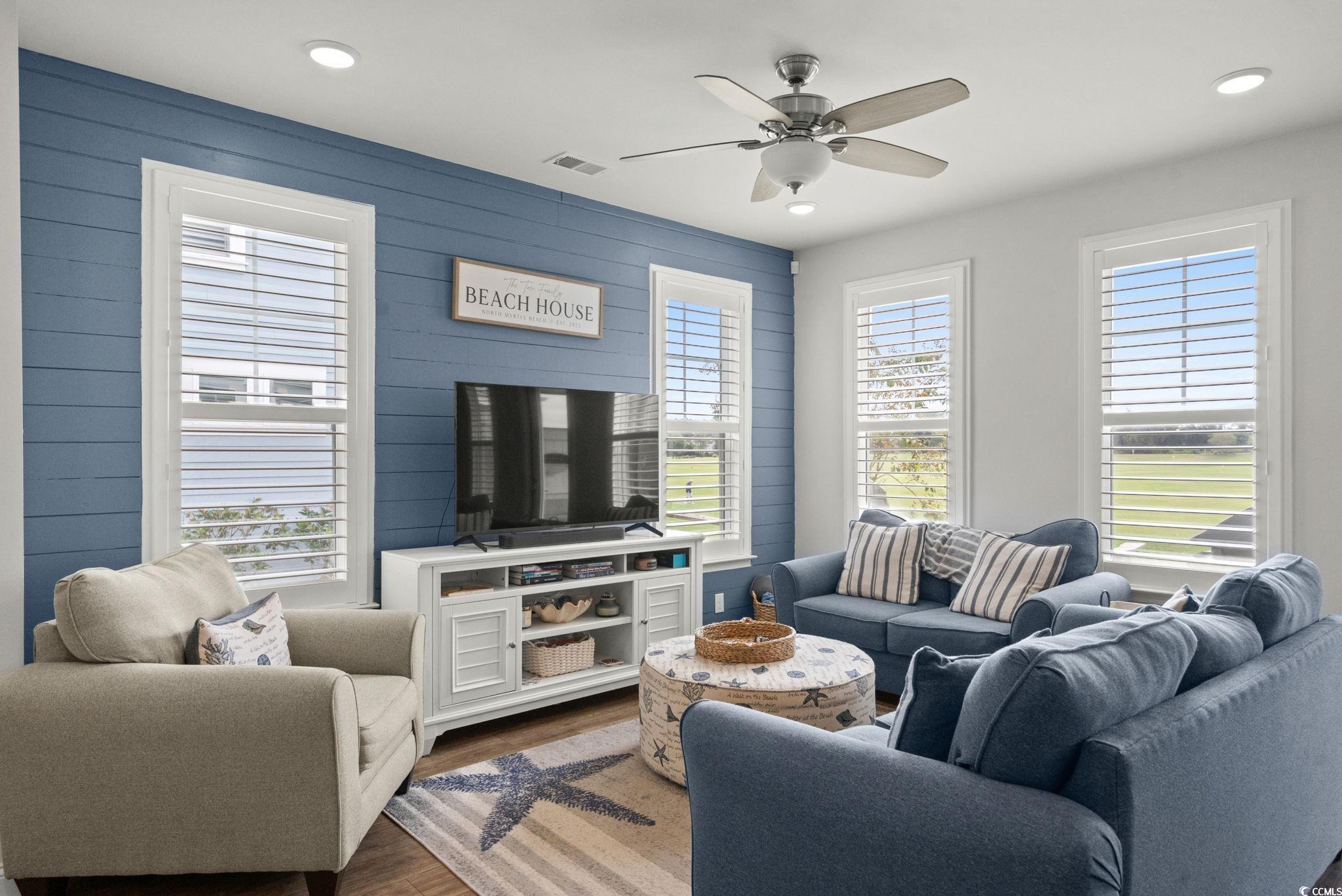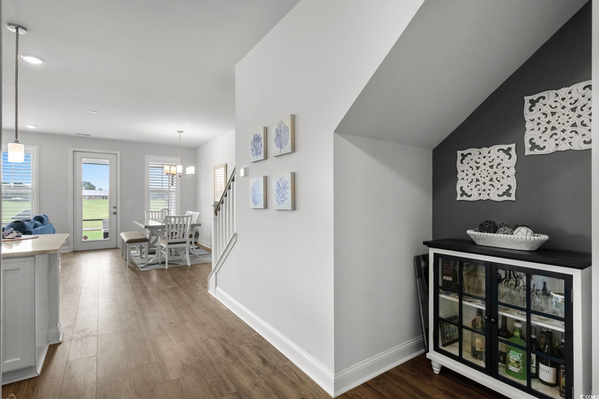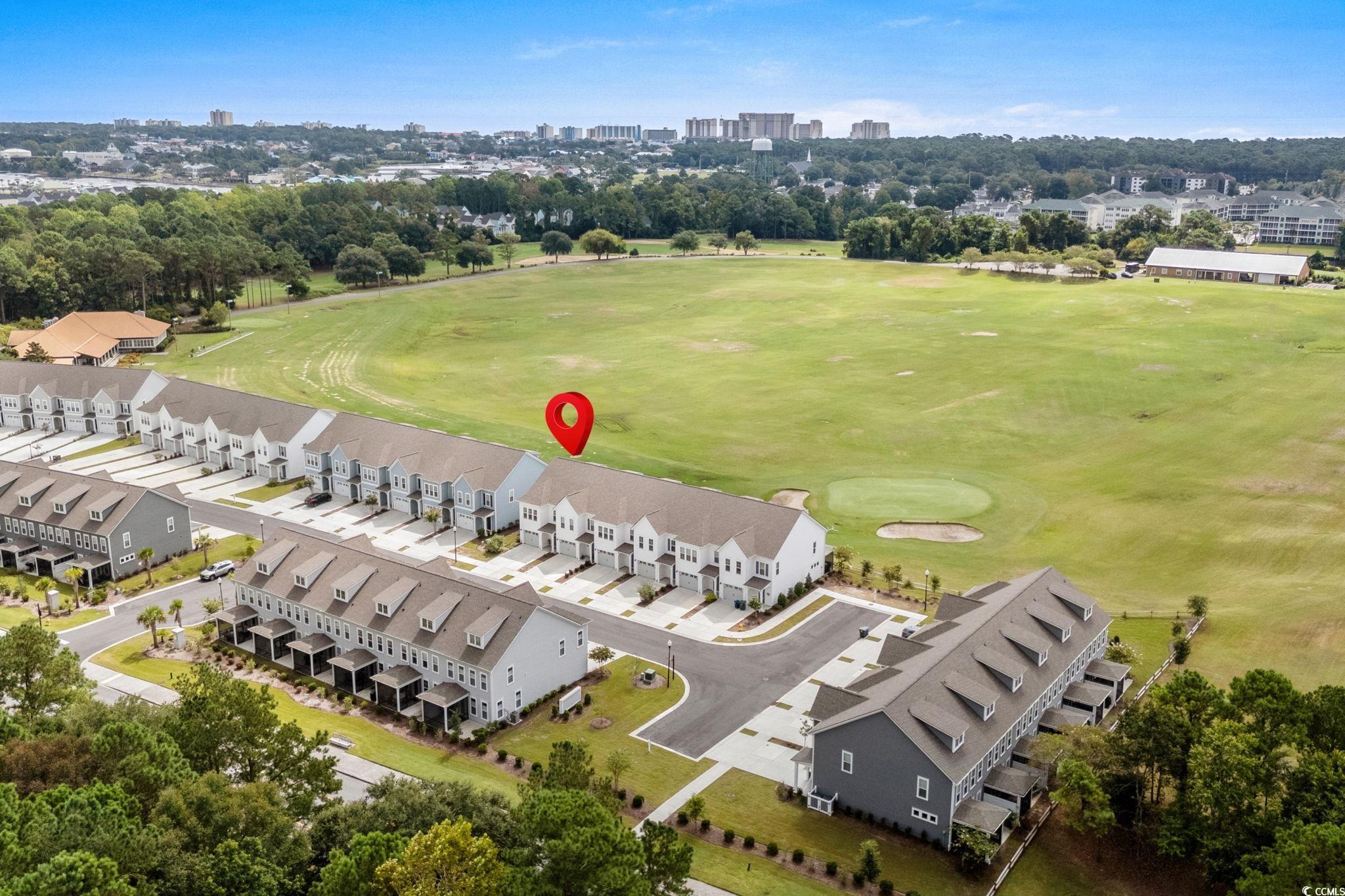 This 4BR, 3.5BA townhome located in the The Townes at Barefoot Resort is absolutely stunning! One of the most desirable lots in the entire community, this is the only END UNIT currently on the market within this community and it backs up to the beautiful driving range offering gorgeous views and resort style living! This is truly TURN KEY - sold FULLY FURNISHED and GOLF CART included! There is also an optional transferable GOLF MEMBERSHIP to Barefoot Resort. What more could you ask for? The gourmet kitchen offers quartz countertops, soft close cabinets, Kitchen Aid appliances and tiled backsplash. Beautiful LVP floors run throughout the first level into the open living & dining room which leads to the screen in porch overlooking the driving range. The second level hosts the Primary Suite + Primary Bathroom, Two Guest Bedrooms, an additional full bathroom, and the laundry room. The third floor consists of a large bonus room/4th bedroom, full bathroom, and additional storage space. The home is tastefully furnished and decorated with upgrades including shiplap and plantation shutters. The one car garage is perfect for your beach toys, additional storage, and of course your golf cart! Short Term Rentals ARE allowed, however, this has only been used as a second home. Owners have access to the Resort Style Pool, the Beach Cabana, sidewalks, and so much more. The Townes at Barefoot is approximately 2 miles to the ocean and a short golf cart ride to all of the amenities that Barefoot Landing has to offer including local shops and restaurants, the House of Blues, and the Duplin Winery. Schedule your showing on the gorgeous home before it is too late!