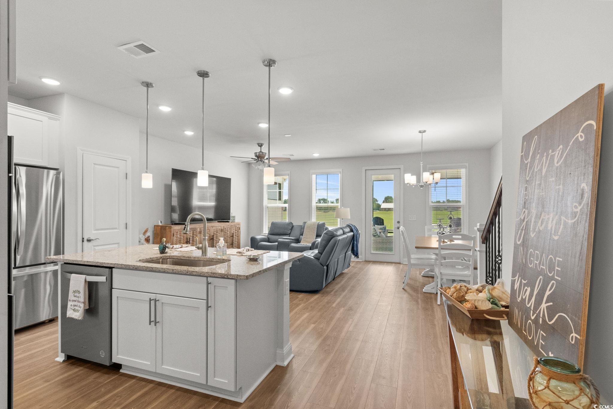 Immaculate 4BR/3.5BA Townhome in Townes at Barefoot. Lightly Used, Golf Membership Included! Welcome to resort-style living in this 4-bedroom, 3.5-bathroom, three-story townhome with over 2,100 heated sq ft, located in the highly sought-after Townes at Barefoot. Built in 2023 and used only a few weeks per year since purchase, this beautifully maintained home offers a rare opportunity for a move-in-ready property with a transferable Barefoot Resort golf membership, a major added value for golf enthusiasts. Step inside and enjoy a bright, open floor plan featuring 9' ceilings, Shaw Restoration laminate flooring, and a spacious kitchen with upgraded cabinetry, quartz countertops, and premium KitchenAid stainless steel appliances. The main level includes a welcoming foyer, half bath, and an open kitchen/dining/great room area perfect for entertaining. A screened-in porch and back patio make for ideal outdoor lounging and grilling spaces. Upstairs, the second floor hosts the owner's suite with a walk-in closet and spa-like en-suite bath with double sinks and a tiled walk-in shower. Two additional guest bedrooms, a full bath, and a convenient laundry room complete this level. The third floor offers a private guest suite with its own full bathroom, ideal for visitors or a quiet home office. Other upgrades include ceramic tile in all baths and laundry room, engineered marble countertops, Moen fixtures, energy-efficient LED lighting, and Schlage deadbolts on exterior doors. A one-car garage and easily accessed attic storage for extra convenience. Furnishings by Seaside Furniture are negotiable, making it easy to move right in and start enjoying your beach lifestyle. As a resident of Barefoot Resort, you'll enjoy access to an impressive array of amenities including four championship golf courses, a private beach cabana with seasonal shuttle service, the 15,000 sq ft saltwater pool overlooking the marina, the Greg Norman Golf Academy and driving range, on-site dining options, walking and biking trails, and more. It's a lifestyle defined by convenience, relaxation, and luxury. Located just steps from Putter's Pub and the driving range, and minutes from the beach, Barefoot Landing, shopping, dining, and entertainment. This home truly offers the perfect blend of comfort, location, and leisure. Whether you're looking for a primary residence, a second home, or a smart investment! Don't miss this rare opportunity to own a gently used, turn-key townhome in one of the Grand Strand's premier resort communities. Schedule your private showing today!