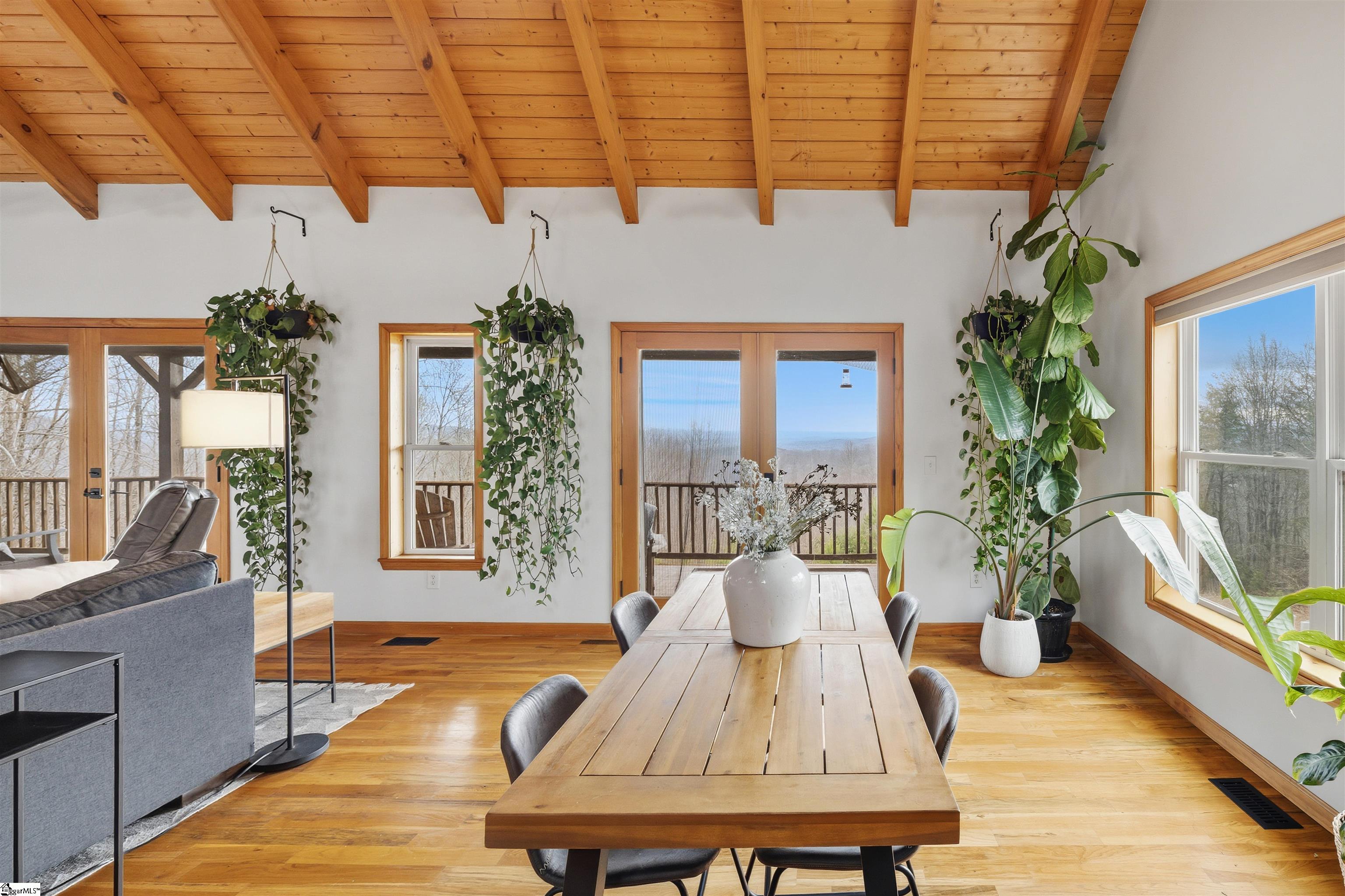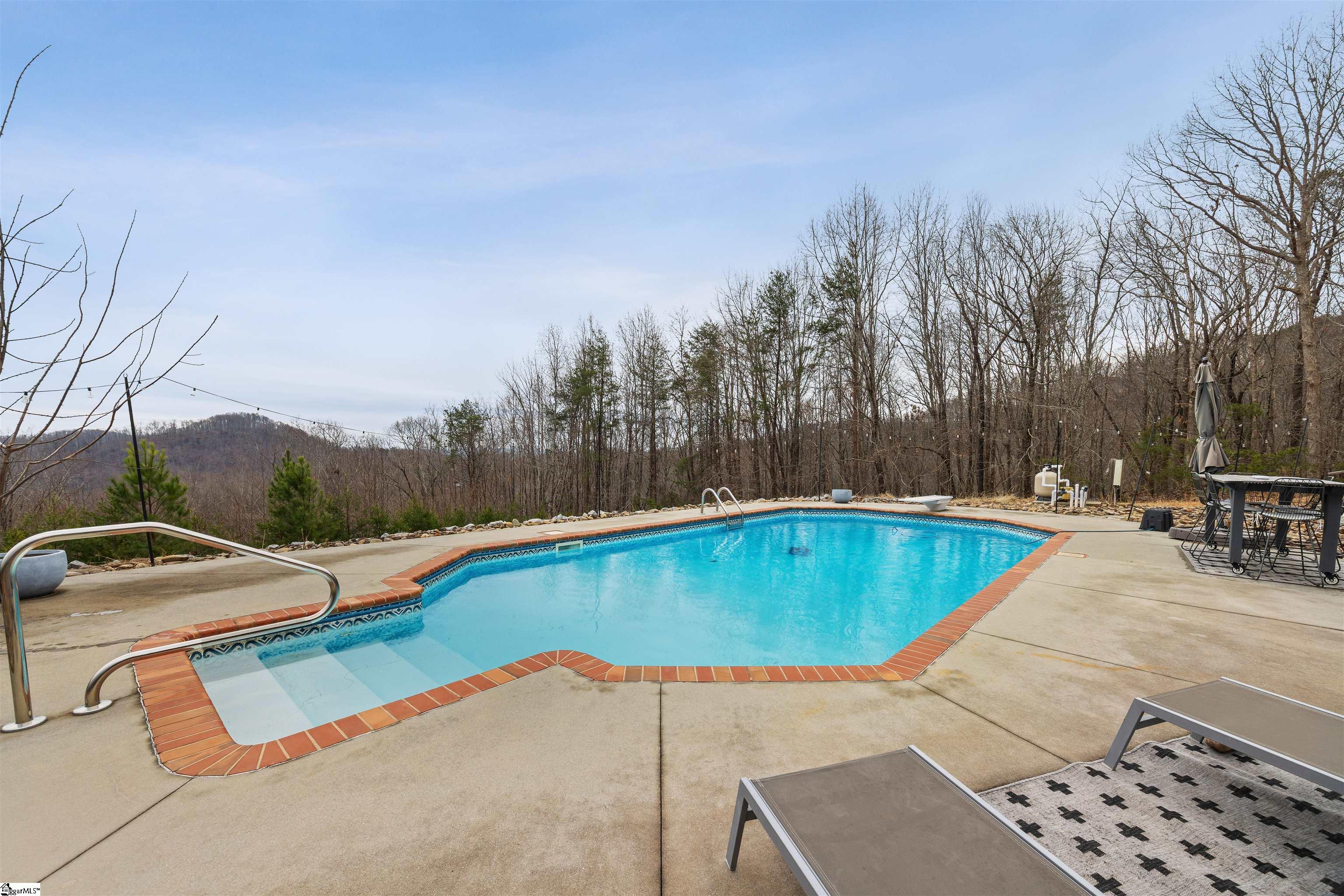 Tucked into the foothills of the Blue Ridge Mountains, 523 Upper Springs Road offers a rare blend of privacy, views, and thoughtful updates in a peaceful, nature-rich setting just minutes from charming and growing downtown Pickens. Approached by a quiet, tree-lined drive, the landscape opens to sweeping mountain scenery that immediately sets the tone for this inviting retreat. This beautifully refreshed mountain home features 4 bedrooms, 2 bathrooms, and approximately 2,940 square feet of living space designed to connect seamlessly with its surroundings. A classic cabin aesthetic anchors the exterior, highlighted by a new 50-year metal roof, covered front porch, and full-length covered decks on both the main and lower levels—ideal for enjoying the changing seasons, mountain air, and abundant wildlife. Inside, high ceilings and expansive windows frame breathtaking views from nearly every room. Multiple French doors extend the living spaces outdoors, enhancing natural light and indoor-outdoor flow. The main level has been thoughtfully updated with new interior paint and drywall, refreshed finishes, new kitchen tile flooring and backsplash, and updated cabinet hardware. The primary suite offers direct porch access and serene views, creating a true private retreat. The fully updated walkout basement adds exceptional flexibility, with newly finished bedrooms, bathroom, and utility room, all featuring fresh drywall, paint, and new carpet and padding. The basement bathroom includes new internal plumbing, and walkout access leads directly to the backyard and pool area—perfect for guests or multigenerational living. Outdoor living is equally well-considered, with replaced lower deck boards, new step boards leading toward the garage path, and newly installed rock pathways guiding you to the pool. The pool itself has been upgraded with a new pump, filter, and cleaning robot, creating a low-maintenance space for summer relaxation surrounded by nature. Additional improvements include coded front door and garage locks, new blinds and curtains throughout, updated door hardware, new utility room refrigerator/freezer, and a new washing machine. A separate three-car garage provides ample storage for vehicles, outdoor gear, or workshop use. Located near Nine Times Preserve, Nine Times Forest, Caesars Head State Park, and extensive hiking—including much of the South Carolina portion of the Foothills Trail—this property offers an exceptional lifestyle for those seeking space, scenery, and quality construction without sacrificing access to town amenities.