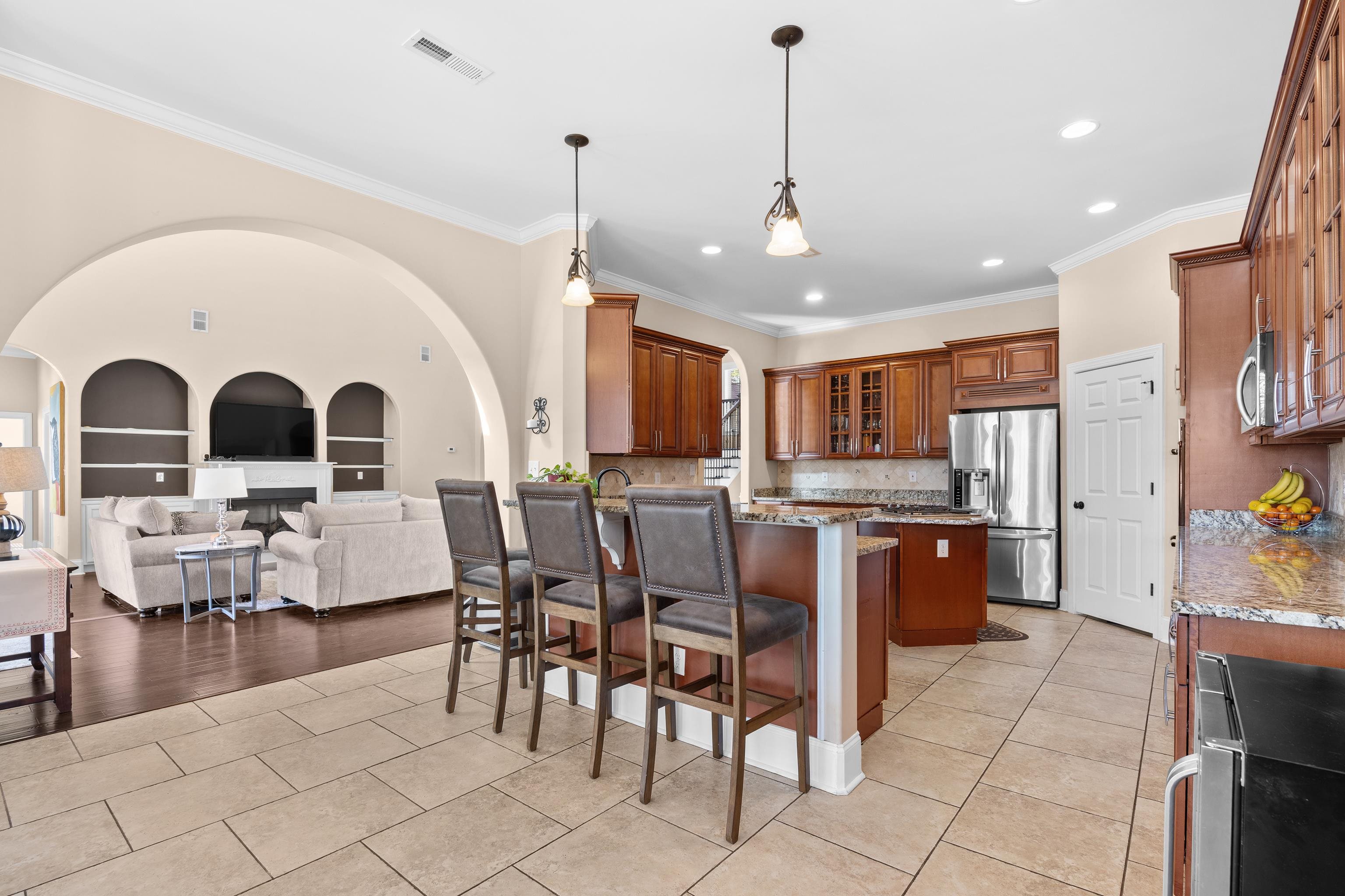 This exceptional five-bedroom, four-bath custom home with over 6,000 sq. ft. under roof, is perfectly situated on a quiet street with cul-de-sacs at both ends, offering privacy and no through traffic. Designed for both everyday living and entertaining, the home features a dramatic two-story great room with fireplace and direct access to an incredible outdoor retreat. Step outside to your own resort-style oasis, complete with a 22,000-gallon heated saltwater pool and spa, tanning shelf, umbrella sleeves, expansive paver patio, fire pit with pergola and sunshade, covered porches, and an outdoor kitchen with built-in grill and sink — perfect for year-round enjoyment. Inside, the spacious layout includes a versatile flex room ideal as a formal dining room, media space, playroom, or home office. The large kitchen showcases beautiful wood cabinetry with soft close drawers, granite countertops, and a generous dining area. A main-level bedroom and full bath provide an ideal guest suite or multigenerational living option and feature a large custom walk-in closet. Abundant storage is found throughout, including multiple linen closets. Upstairs, you’ll find four additional bedrooms and three full baths, including a private guest suite with en-suite bath and private balcony, plus two bedrooms connected by a Jack-and-Jill bath. The spacious primary suite offers two walk-in closets, a large primary bath with jacuzzi tub and oversized tile shower, and a separate room ideal for a home office, nursery, or exercise space. The oversize garage (over 1,000 sq ft) offers incredible flexibility as a workshop, storage area, or ultimate man cave. A garage of this size is very hard to find and there is plenty of room to store all of your toys! Throughout the home, you’ll appreciate tile and hardwood flooring (with carpet in only two bedrooms), granite finishes, and extensive crown molding. Plantation Lakes residents enjoy outstanding community amenities, including two resort-style pools, tennis and pickleball courts, sand volleyball courts, basketball court, playground, clubhouse with kitchen and fitness room, boat launch, day docks, and a scenic lake with approximately 17 miles of shoreline. This home truly combines luxury, comfort, and lifestyle — inside and out.