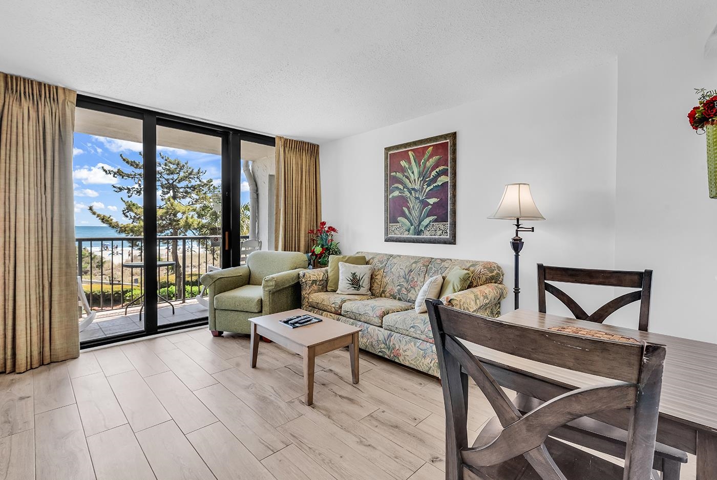 Welcome to Unit 205 at Beach Colony Resort, a charming 1-bedroom, 1-bath direct oceanfront condo located along Myrtle Beach’s desirable Golden Mile—known for its quieter beaches and upscale feel. Sold fully furnished, this unit offers a bright, comfortable layout with white kitchen cabinets and a spacious bedroom large enough to accommodate two beds, making it ideal for guests or rental flexibility. Step out onto your private balcony to enjoy ocean breezes and beautiful views of the Atlantic. Beach Colony Resort offers an impressive list of amenities including indoor and outdoor pools, indoor and outdoor hot tubs, a lazy river, fitness center, on-site restaurant, summer tiki bar, arcade, gift shop, laundry facilities, and convenient beach access just steps away. The building also features 24-hour security and a parking garage. Ideally situated on Ocean Boulevard in a quieter residential area, yet only a 5-minute drive to Broadway at the Beach and many of Myrtle Beach’s top attractions, restaurants, and entertainment. Whether you’re searching for a vacation getaway, investment property with rental potential, or a full-time coastal retreat, this oceanfront condo offers the perfect blend of comfort, convenience, and beachside living.