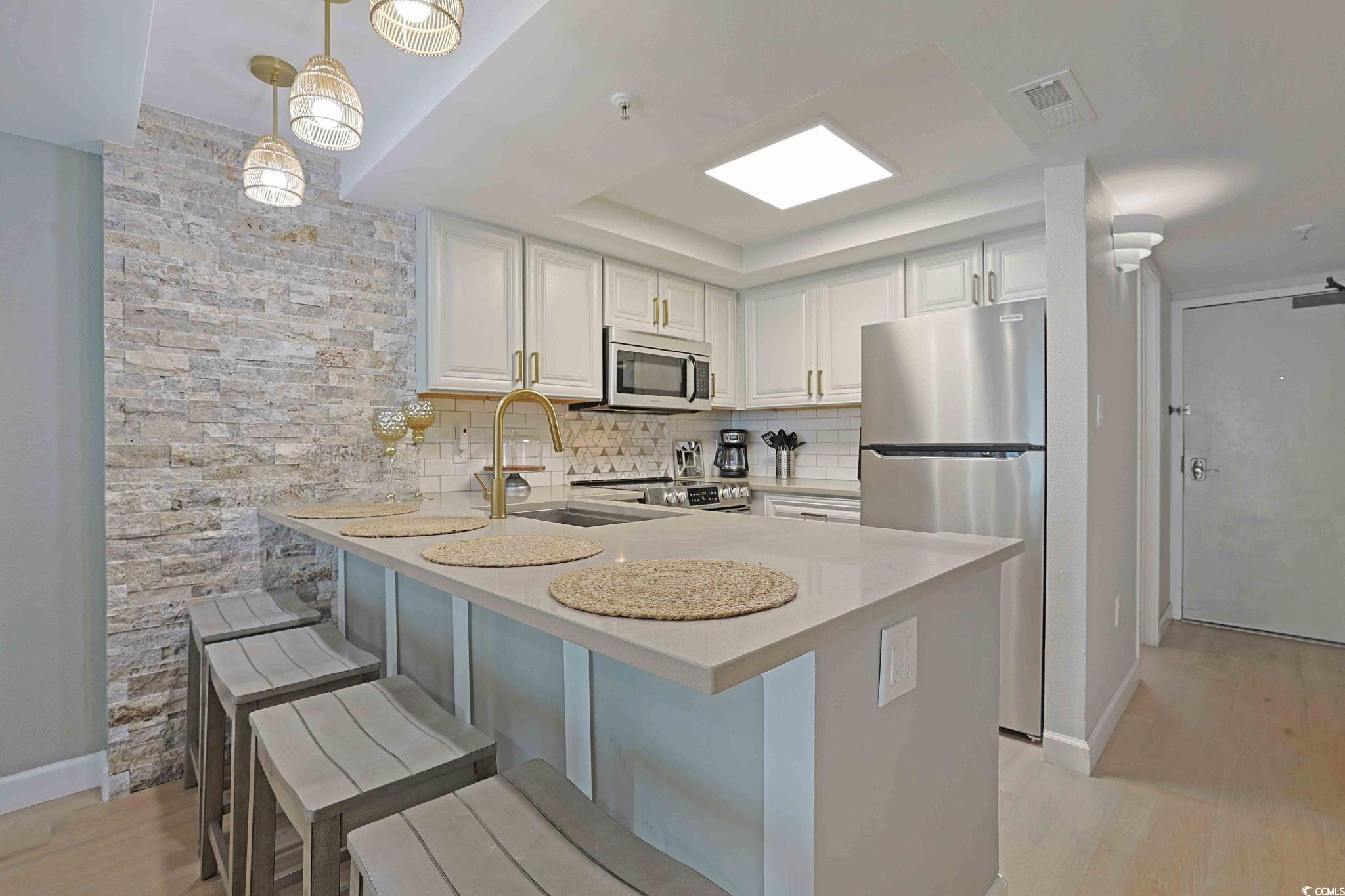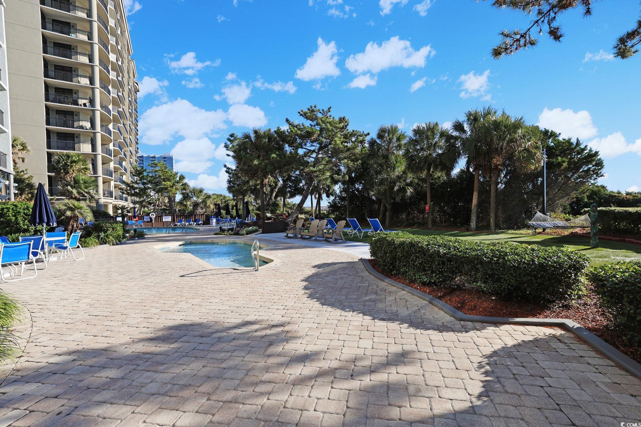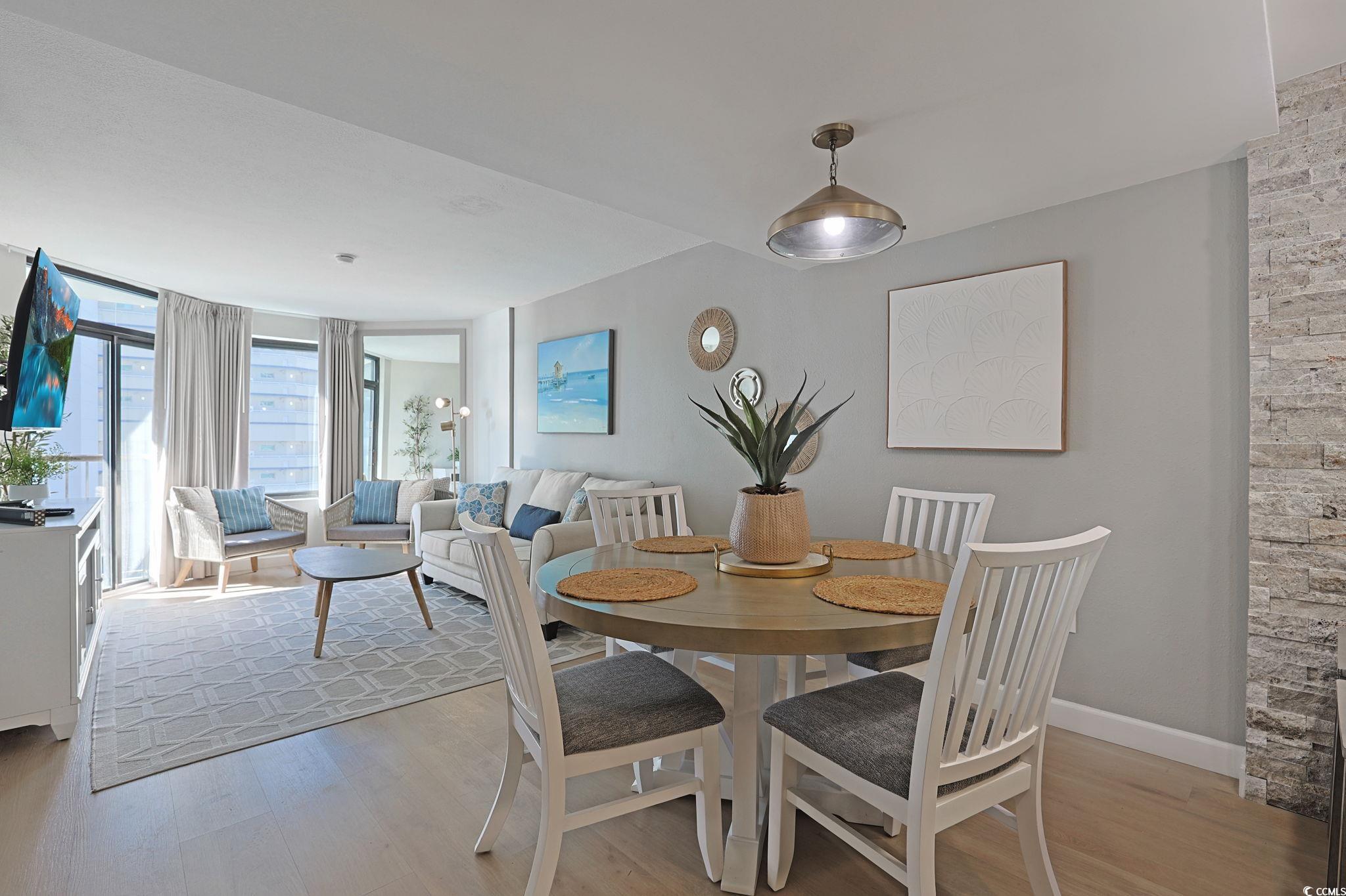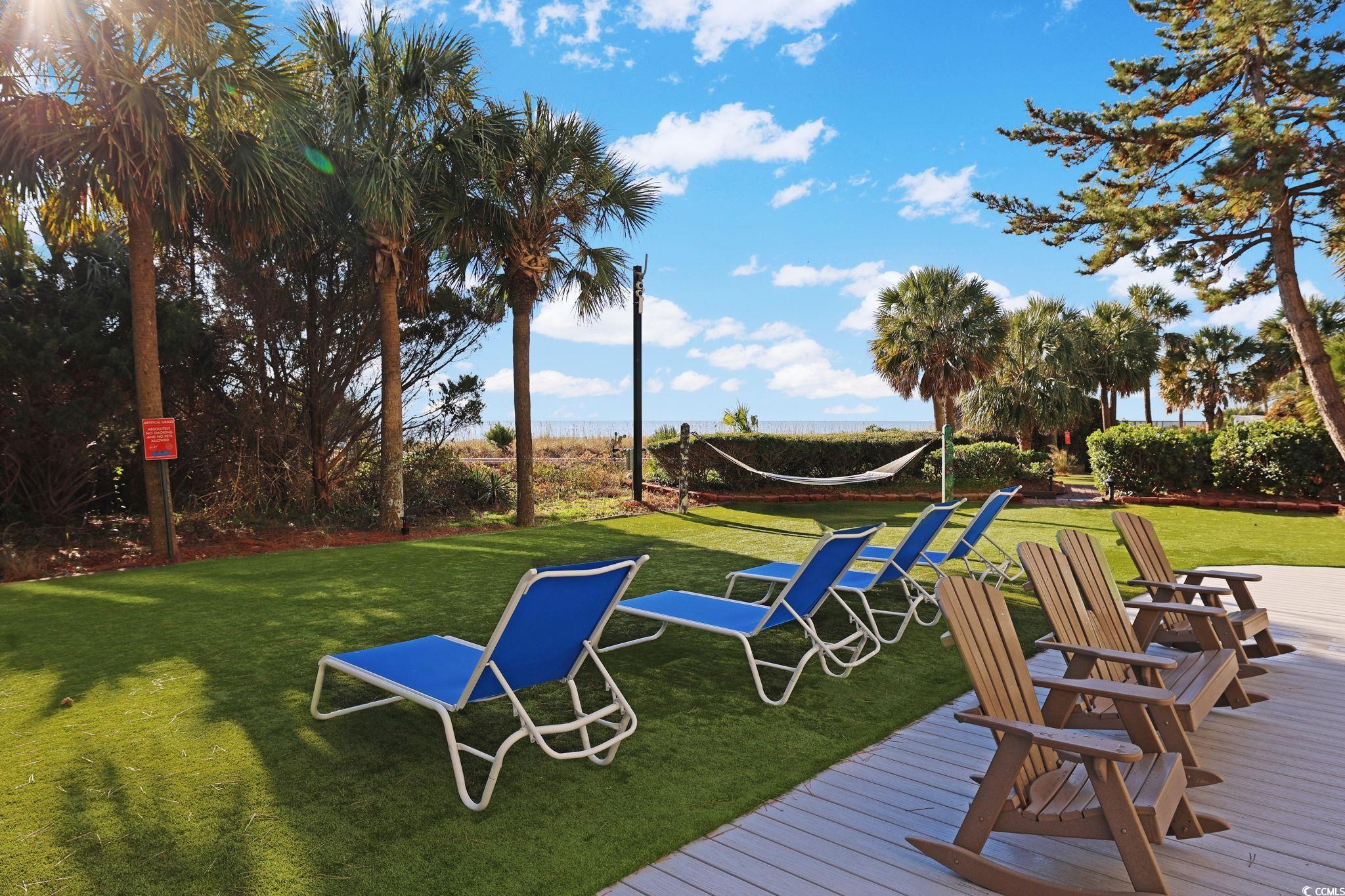 Presenting this welcoming & renovated 2 bedroom 2 bath condo that will be the gem you have been looking for in a place at the beach. This piece of paradise is located in the popular Beach Colony Resort complex. Take the elevator up to to this open floor plan condo that includes wood look LVP flooring, stylish furnishing, and a classic living/dining room combo that showcases a sliding glass door that opens up to the relaxing balcony with views & sounds of the waves breaking. The family-friendly kitchen is equipped with a stainless steel appliance package, granite counter tops, ample cabinet spaces, and a delight breakfast bar. The primary suite offers a double bi-fold door closet, a sliding glass door that leads out to the balcony, private access to the primary bath hosting a single sink vanity, a comfort station, a laundry closet with a stackable washer & dryer, and a timeless step-in shower. This delightful condo is finished with an additional bedroom and a full guest bath. This condo affords you easy access to the beach and golfing along with all of the other activities and happenings in Myrtle Beach including fun eateries, award winning off-Broadway shows, public fishing piers, and intriguing shopping adventures along the Grand Strand. Conveniently located to your everyday needs, including grocery stores, banks, post offices, medical centers, doctors’ offices, and pharmacies. Check out our state of the art 3-D Virtual Tour.