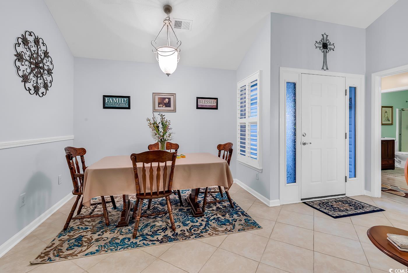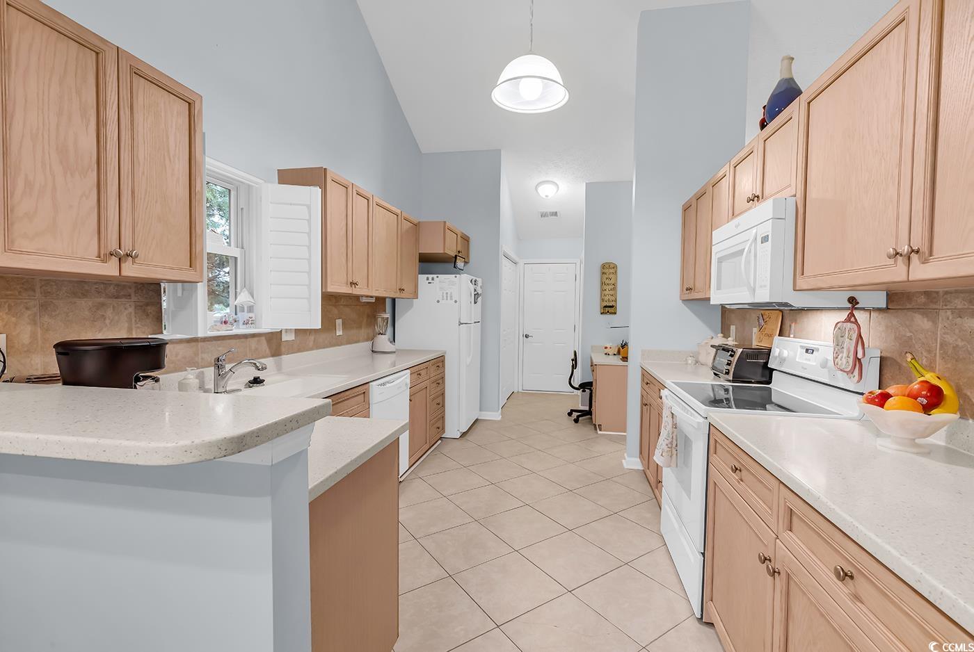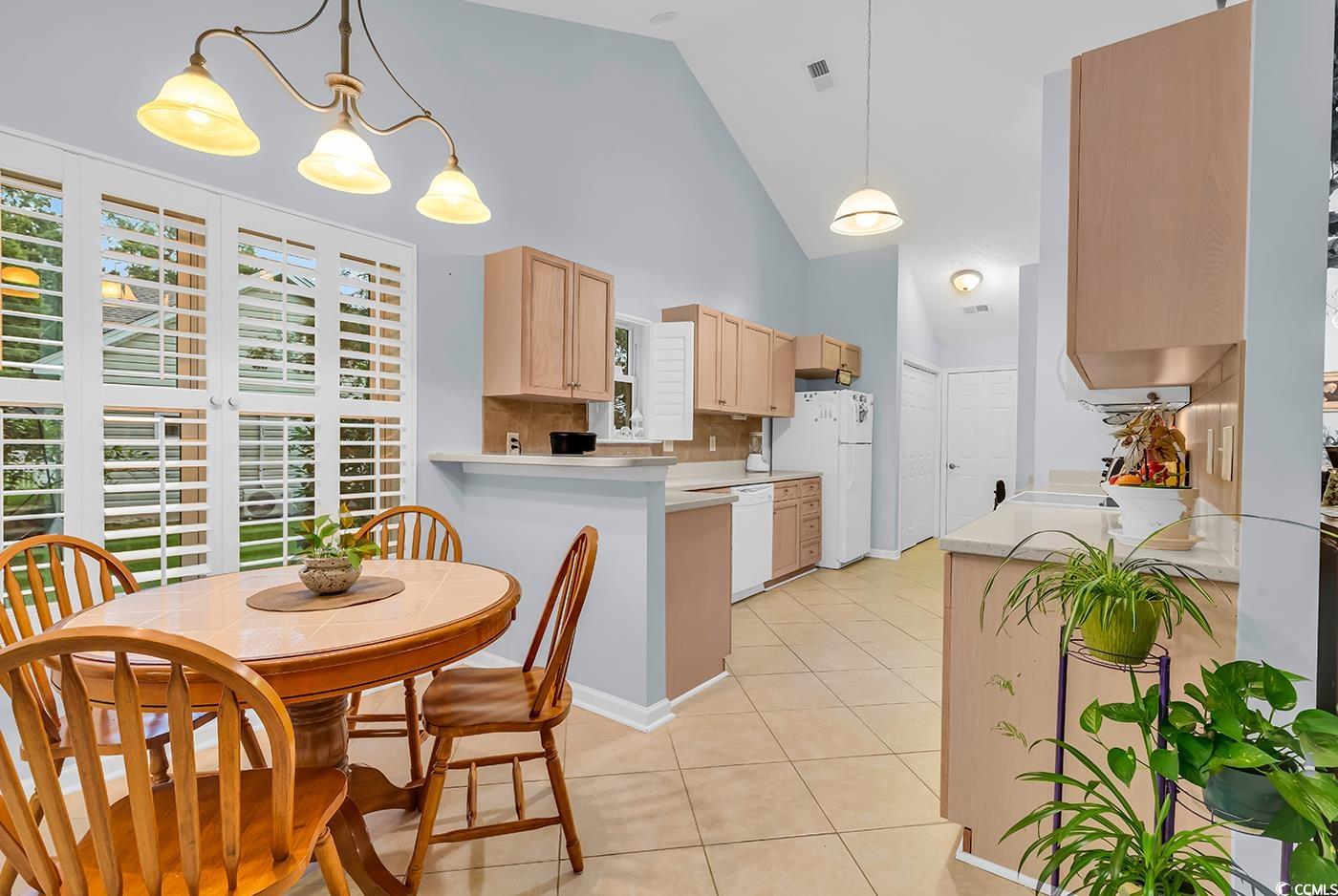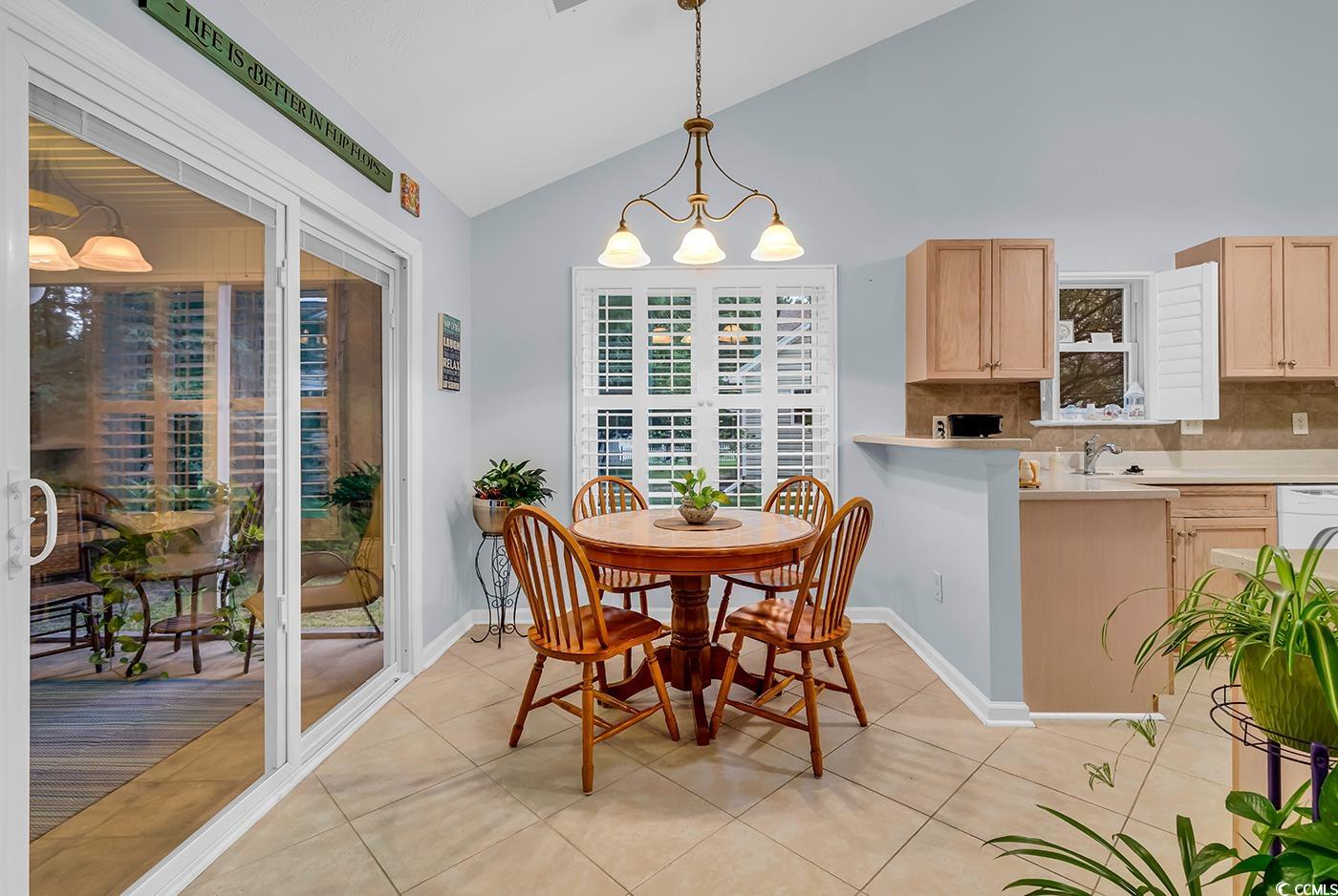 Welcome to your dream home in beautiful Myrtle Beach, nestled in the desirable Peninsula at Palmetto Pointe subdivision. This stunning ranch-style residence encompasses 1,588 square feet, offering a seamless blend of comfort and convenience. Step inside to discover an inviting open floor plan centered around radiant tile flooring that flows effortlessly through the main living area. You will be captivated by the vaulted ceilings that enhance the spaciousness of the home. The well-appointed kitchen boasts custom light fixtures and is perfect for culinary adventures. Retreat to the master suite, which features a luxurious walk-in closet, and an en suite bath complete with both a shower and a tub for ultimate relaxation. Two additional bedrooms with stylish LVP flooring provide ample space for guest accommodations or personal pursuits. Experience the tranquility of your wooded backyard, adorned with mature trees, and indulge in outdoor living in your screened-in porch equipped with a ceiling fan, perfect for warm evenings. A charming trail beckons you to explore the wooded area beyond, while the back patio invites al fresco dining. Enjoy the convenience of being just minutes away from the beach and in close proximity to endless dining and shopping options, making this property a true gem along the coast.