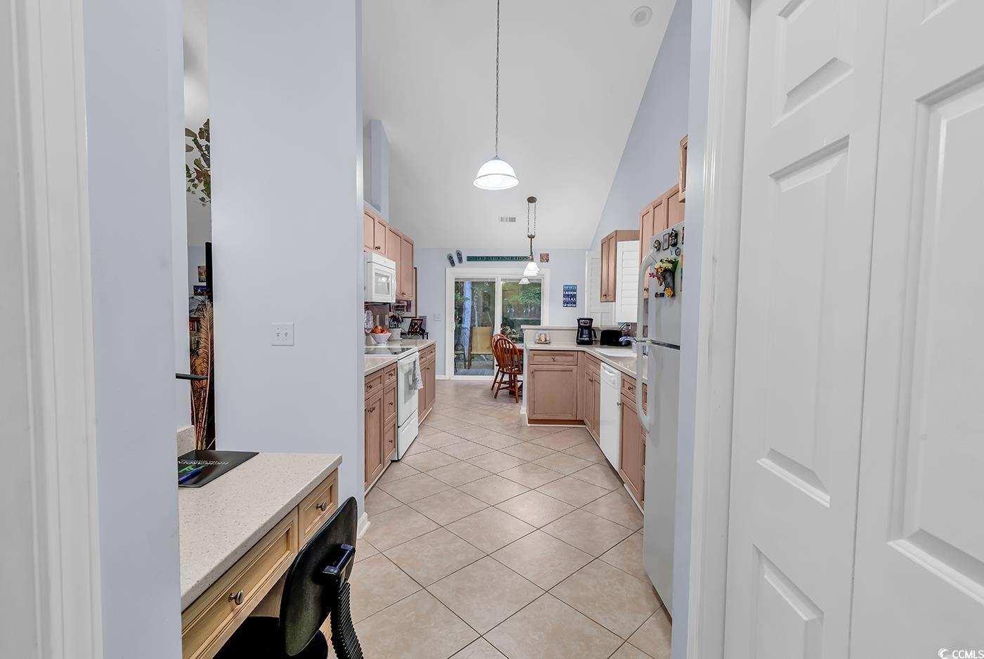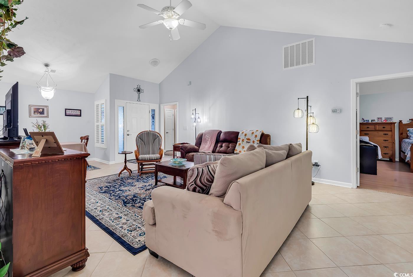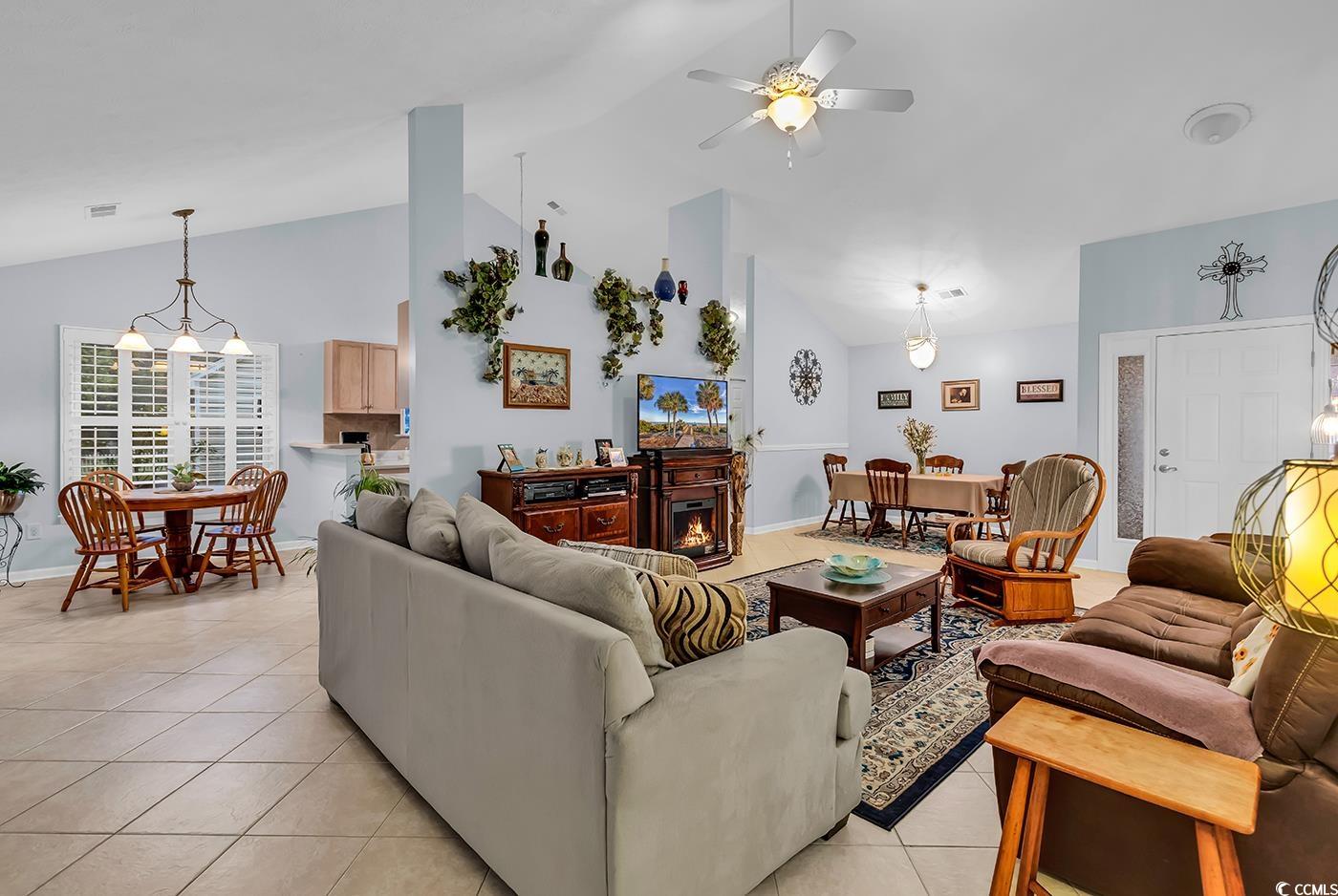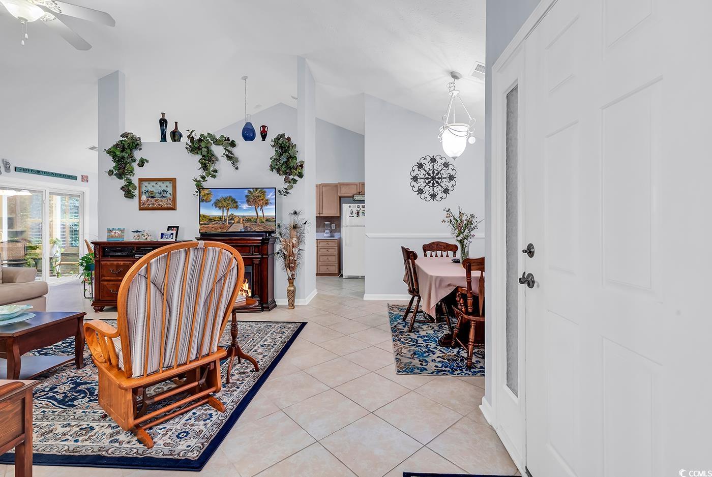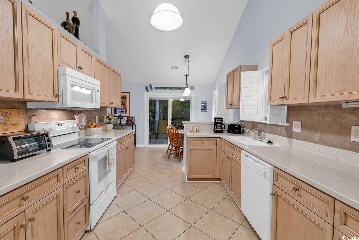 Welcome to your dream home in beautiful Myrtle Beach, nestled in the desirable Peninsula at Palmetto Pointe subdivision. This stunning ranch-style residence encompasses 1,588 square feet, offering a seamless blend of comfort and convenience. Step inside to discover an inviting open floor plan centered around radiant tile flooring that flows effortlessly through the main living area. You will be captivated by the vaulted ceilings that enhance the spaciousness of the home. The well-appointed kitchen boasts custom light fixtures and is perfect for culinary adventures. Retreat to the master suite, which features a luxurious walk-in closet, and an en suite bath complete with both a shower and a tub for ultimate relaxation. Two additional bedrooms with stylish LVP flooring provide ample space for guest accommodations or personal pursuits. Experience the tranquility of your wooded backyard, adorned with mature trees, and indulge in outdoor living in your screened-in porch equipped with a ceiling fan, perfect for warm evenings. A charming trail beckons you to explore the wooded area beyond, while the back patio invites al fresco dining. Enjoy the convenience of being just minutes away from the beach and in close proximity to endless dining and shopping options, making this property a true gem along the coast.