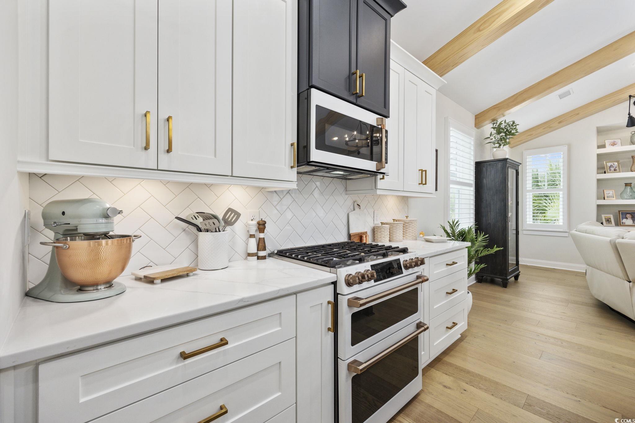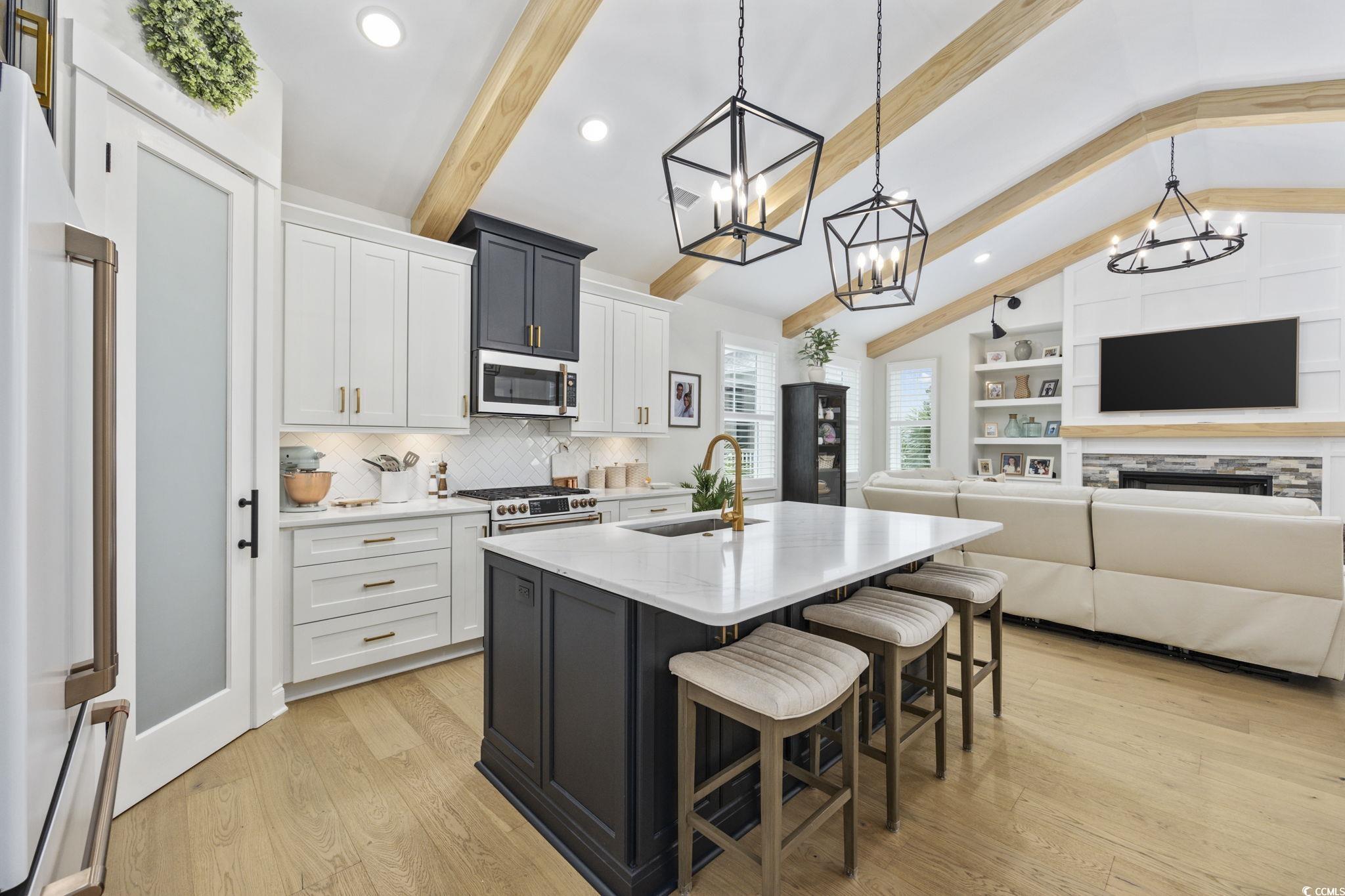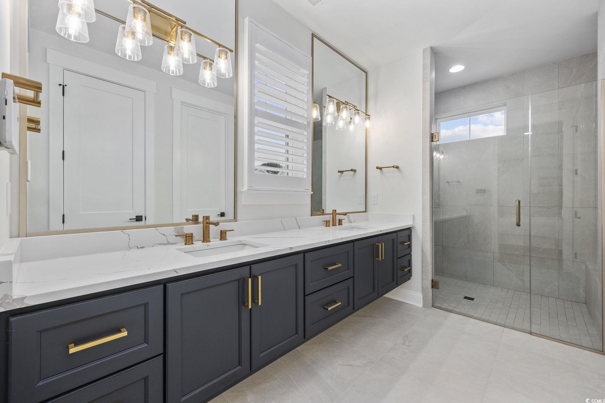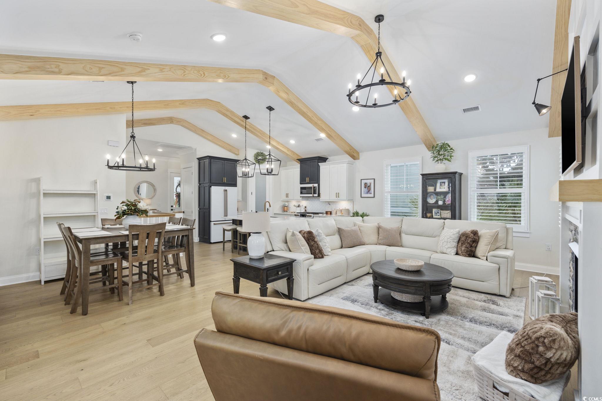 Welcome to this exquisite, nearly-new Craftsman-style beach house, nestled in the exclusive gated community of Ocean Village, just steps from the stunning Atlantic Ocean. Built in 2023, this home seamlessly blends luxury and coastal charm, offering the perfect setting for relaxed beach living with sophistication. Featuring 3 bedrooms, 3.5 bathrooms, and a dedicated office, this thoughtfully designed residence offers both comfort and convenience. As you enter, you’ll be captivated by the craftsmanship and attention to detail throughout. The spacious family room boasts vaulted ceilings with stunning wood beams and an inviting fireplace, creating a warm and welcoming ambiance. The open floor plan flows effortlessly, with engineered hardwood flooring throughout the main level, adding elegance and warmth to the space. The gourmet kitchen is a chef’s dream, equipped with upgraded white Cafe Classic appliances, a large walk-in pantry, and ample counter space, perfect for both casual meals and entertaining. The luxurious primary suite provides a serene retreat, complete with custom shelving in the walk-in closet and a spa-like bathroom featuring a double vanity and a beautifully designed walk-in shower. The two secondary en-suite bedrooms each feature walk-in closets and are connected by a cozy sitting room, ideal for a private TV area or quiet reading nook. For added convenience, the home includes a dedicated golf cart entrance and driveway, as well as a spacious 13x7’6 storage room off the garage. Outdoor living is just as inviting with an outdoor shower to rinse off after a day at the beach, plus the peaceful ambiance of the gated community that ensures privacy and tranquility. Every aspect of this home has been carefully designed, from the high-end finishes to the functional, modern layout. Whether you're seeking a permanent coastal retreat or a vacation getaway, this stunning beach house has everything you need to embrace the beach lifestyle. Don’t miss the opportunity to make this exceptional property your own!
