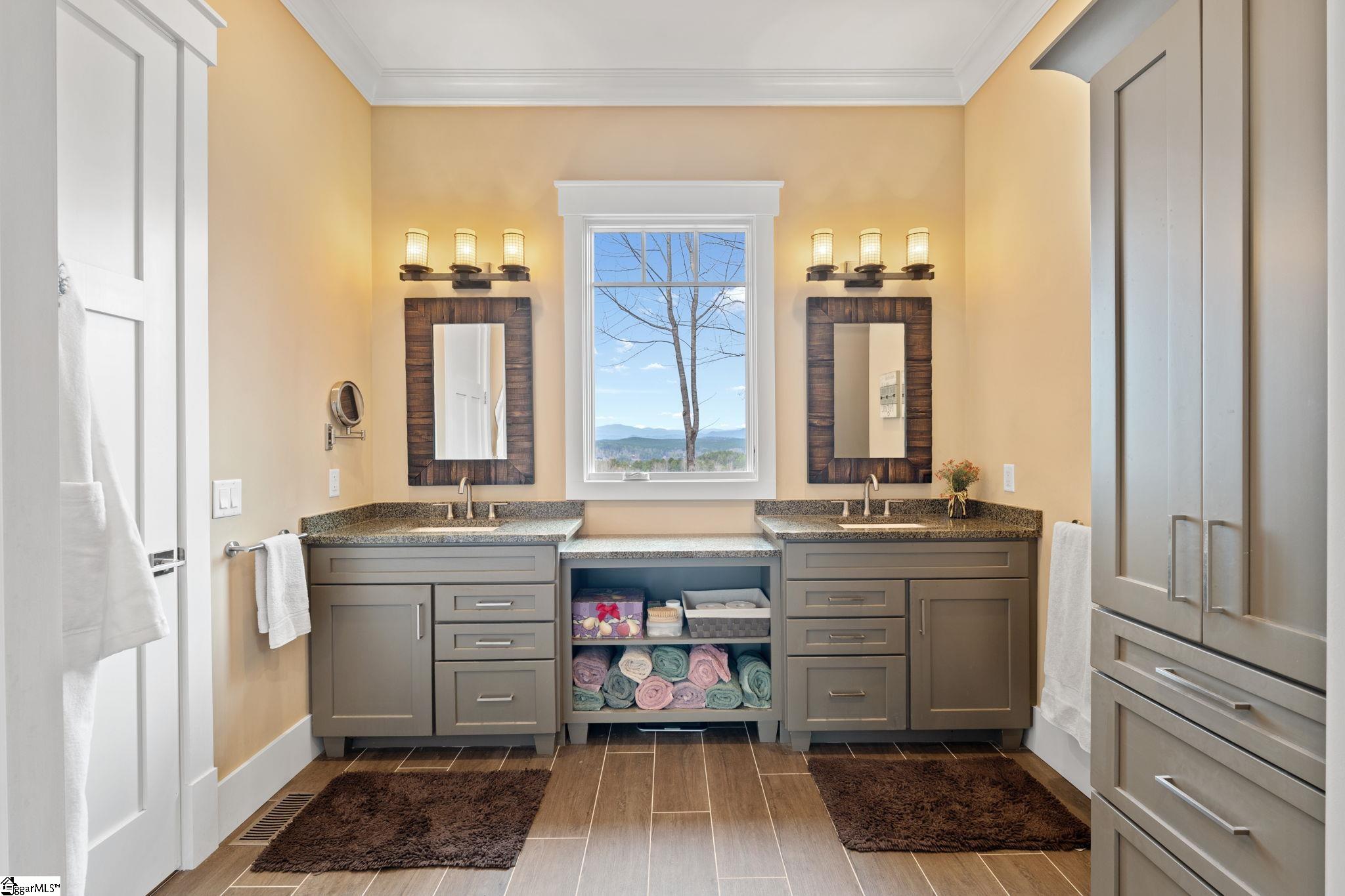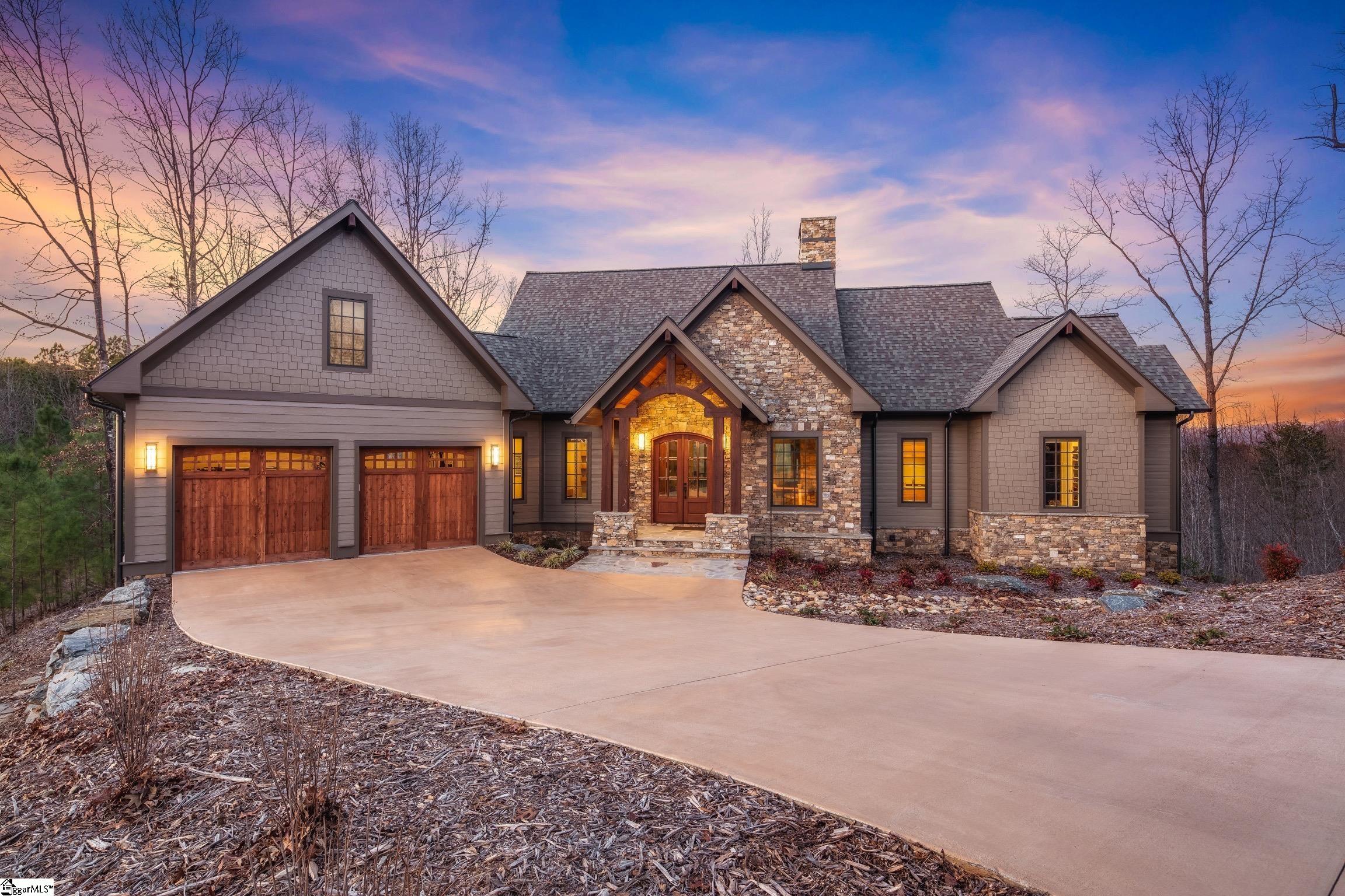 Picturesque mountain rustic home in the Cliffs of Keowee Springs combines a private wooded setting with captivating mountain and lake views from nearly every room. Built by Hillcrest Homes, the home sits on two lots totaling over five acres in The Cliffs at Keowee Springs. This property is ideal as a primary residence for a small family or an exceptional getaway retreat. The main level includes a great room, kitchen, dining area, primary bedroom suite, and powder room with site-finished, white oak hardwood flooring throughout. The open concept great room features vaulted ceilings, a dramatic stacked stone fireplace and clerestory windows that fill the space with natural light. Panoramic sliding doors open to a spacious screened porch with natural flagstone flooring, creating a seamless connection to outdoor living. The kitchen is well appointed with black stainless steel appliances, double ovens, a gas cooktop, and a generous island with breakfast bar. Just off the adjacent dining area, a flagstone patio offers the perfect place to enjoy a fire or sip morning coffee. The primary bedroom is a private retreat with panoramic views. The en suite bathroom offers dual vanities, a walk-in shower, and a separate water closet. The spacious walk-in closet includes custom shelving along with a window seat. The laundry room is conveniently located adjacent to the primary bedroom. The lower level walkout is thoughtfully designed to accommodate family and guests and also offers long-range mountain views from every window. A multipurpose recreation area includes a wet bar with a wine chiller and built-in cabinetry. Two bedrooms are located on this level, allowing one to be easily used as a home office, along with one full bathroom. An unfinished storage area provides a generous amount of additional storage space. This home is just minutes from the front gate and clubhouse and is offered in pristine condition. It presents an outstanding opportunity for those looking to downsize while continuing to enjoy the benefits of a Cliffs membership. Membership privileges provide access to exceptional amenities across seven clubs throughout South and North Carolina, including award winning golf courses, fine dining, wellness centers, tennis and pickleball courts, and more.