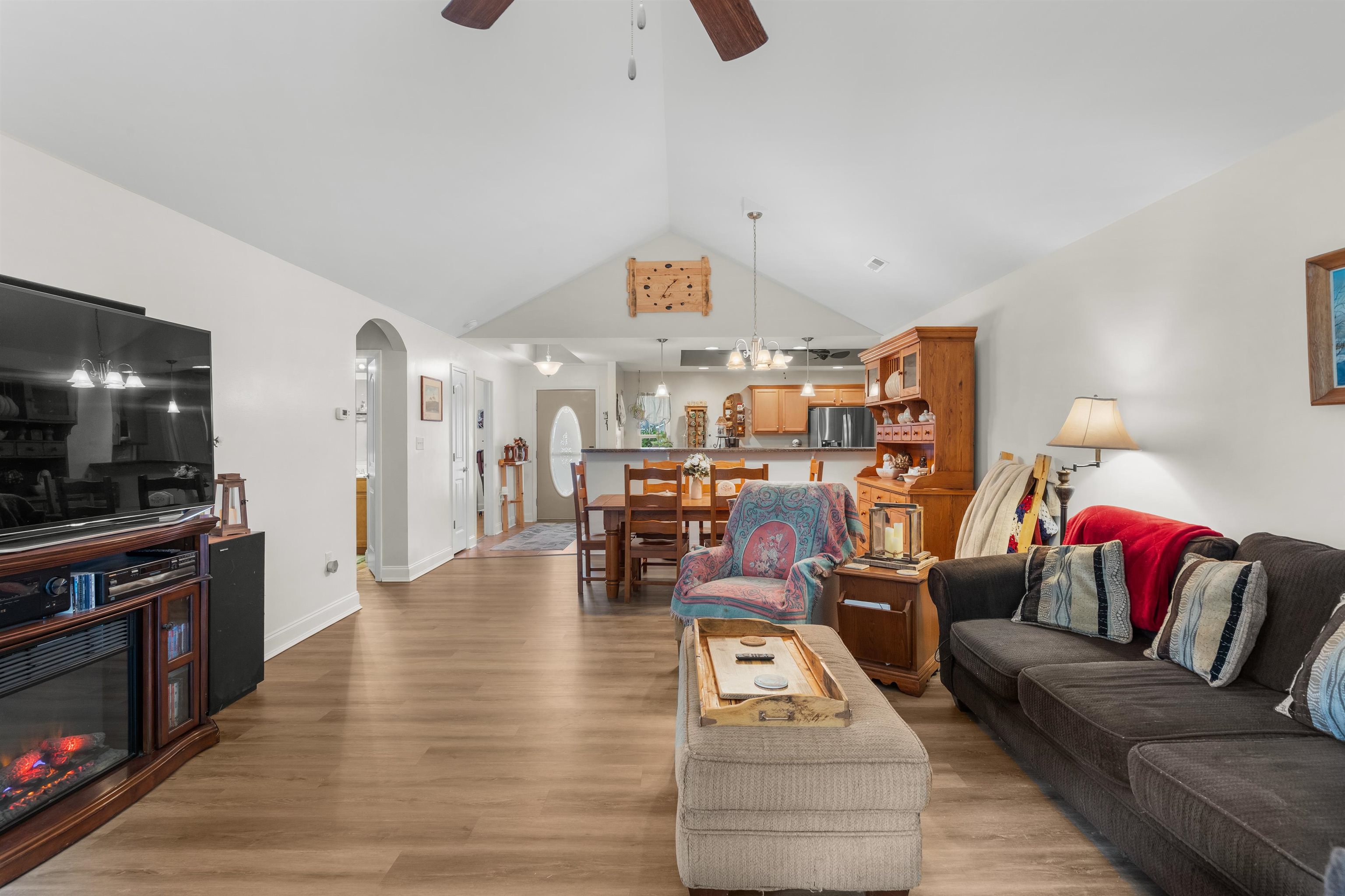 This beautifully updated 3-bedroom, 2-bath home sits on a nice wooded lot at just under a quarter acre. Located in the desirable Diamond community this home offers the perfect blend of comfort, style, and privacy. From the moment you arrive, the charming front porch sets the tone, ideal for morning coffee or evening relaxation. Step inside to a spacious, open-concept floor plan highlighted by vaulted ceilings in both the living and dining areas, creating an airy and welcoming atmosphere. The single-story, split-bedroom layout provides exceptional functionality and privacy. Brand-new wide-plank luxury vinyl plank flooring has just been installed throughout the entire home, adding a modern, cohesive look. The kitchen is a true centerpiece, offering abundant cabinet and counter space, stainless steel appliances, tile flooring, a tray ceiling with dual ceiling fans, a pantry, and a generous breakfast bar, perfect for casual dining or entertaining guests. The private owner's suite, thoughtfully positioned on the opposite side of the home, features a vaulted ceiling and patio doors that leads out to a newly built deck overlooking the serene wooded backyard, your own peaceful retreat. The en-suite bath impresses with dual vanity sinks, a walk-in shower, and a spacious walk-in closet. Located in the award-winning St. James School District, this home is just minutes from shopping, restaurants, and close to the entertainment at the Murrells Inlet MarshWalk, offering the best of both tranquility and convenience. Move-in ready, beautifully updated, and with a wooded lot that offers privacy, this home has it all! Square footage is deemed reliable, buyer responsible for verification.