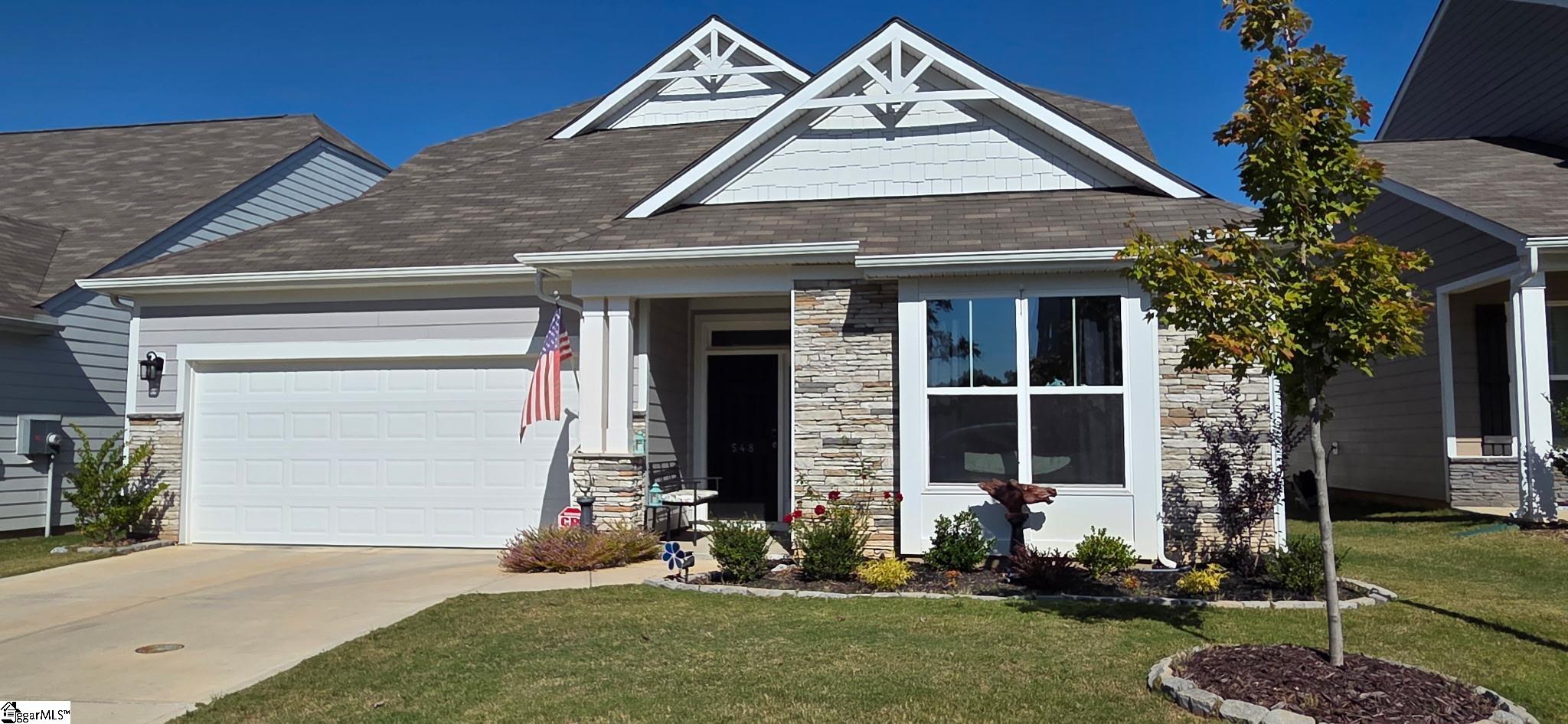 Welcome home to this beautifully maintained property in the heart of Simpsonville—conveniently located near shopping, dining, and major commuter routes. From the moment you enter the open foyer with crown molding and wainscoting, you’ll appreciate the eye-catching finishes throughout. An open-concept design connects the kitchen, breakfast area, and living room—perfect for everyday living and entertaining. The kitchen features granite countertops, a tile backsplash, a large island with seating, a walk-in pantry, and cabinets with roll-out shelving. Glass doors lead to a covered patio overlooking the fenced backyard. The primary suite offers a relaxing retreat with dual granite vanities, a large tiled shower with a bench, and a walk-in closet with a laundry pass-through. Two additional bedrooms and a full bath provide flexible space for guests, work, or hobbies. Additional features include a gas tankless water heater, smart home panel, and a two-car garage with extra storage. Stylish, comfortable, and move-in ready—this home has it all!