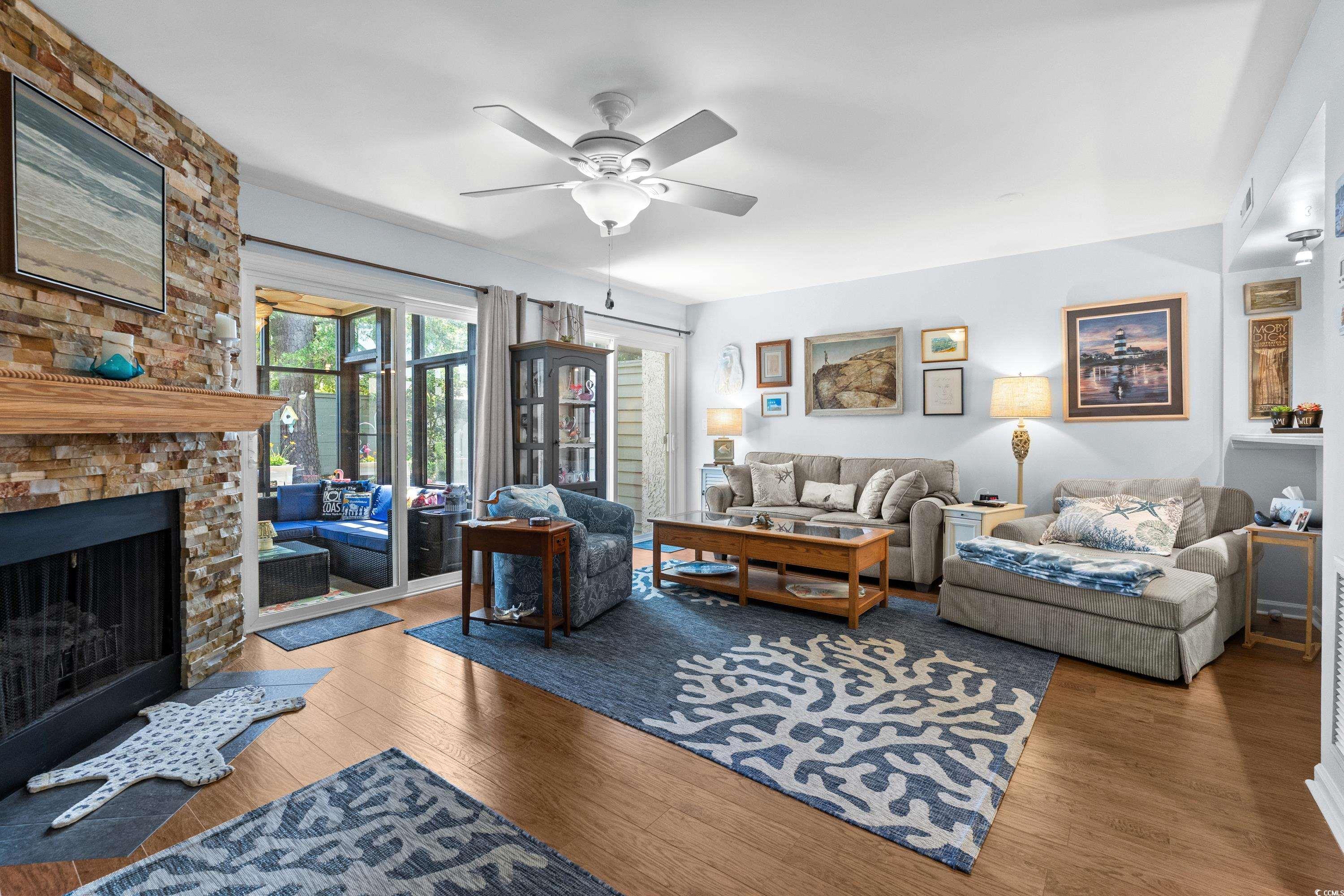 Beautifully updated and maintained 2 bedroom, 2.5 bath townhome style condo in the gated community of Shadow Moss in North Myrtle Beach. Located east of Hwy 17 and right beside Coastal North Town Center, Shadow Moss is conveniently located near Publix, Dicks, Hobby Lobby, TJ Maxx, PetSmart, restaurants and shops and is just a short golf cart ride to the beach! Within the past 2 years, the owner has made many updates like painting the entire interior, adding gutters to the front and back, adding a new air purification system with Ultraviolet light to HVAC, new outlets and light switches and an all-new bathroom in the primary suite. On the main level, we have an eat-in kitchen with ceiling fan over breakfast nook, updated tall cabinets, Corian-style countertops with built-in sink, tile backsplash, new GE stainless steel LG French door refrigerator and new GE stainless microwave over stove, dishwasher, garbage disposal, pantry and tile floors. Just off the eat-in kitchen is the laundry closet with a full-size stacked washer/dryer. In the main level hallway, there is a cute little butler’s pantry with a wine chiller, and a powder room with a new faucet. The sizable family room is highlighted with a beautiful floor-to-ceiling stacked-stone electric fireplace with mantle, ceiling fan, engineered hardwood floors, and 2 glass sliders that lead to the back patio and to the 3-season room. The glass enclosed 3 season room provides tons of sunlight and great views of the backyard area. It also has a ceiling fan, storage closet, and 2 screened windows that open as well as the storm door’s screened window. On the 2nd level, there are 2 bedrooms and 2 full bathrooms. The primary bedroom suite has a vaulted ceiling with a ceiling fan, new LVP flooring, double closets, and a glass slider leading to a private balcony overlooking the backyard. The completely updated primary bathroom features a new walk-in shower, new comfort height vanity with a granite countertop, new toilet and new door. The guest bedroom has engineered hardwood floors, a ceiling fan and an ensuite bathroom with tub/shower combo and tile floors. Owners are allowed pets and golf carts. Take a dip in the community pool on those hot summer days, meet friends in the clubhouse, or enjoy the nature around the onsite pond. HOA fee includes building insurance, common maintenance and repair, pool & landscape services, water & sewer, enhanced cable, internet, pest control, property management, legal/accounting, trash pickup and recycling. Come see this beautiful townhome-style condo that is so close to everything North Myrtle Beach has to offer: shopping, restaurants, entertainment, shag dance clubs, fishing, the Intracoastal Waterway…and don’t forget the amazing sandy beaches of the Atlantic Ocean!