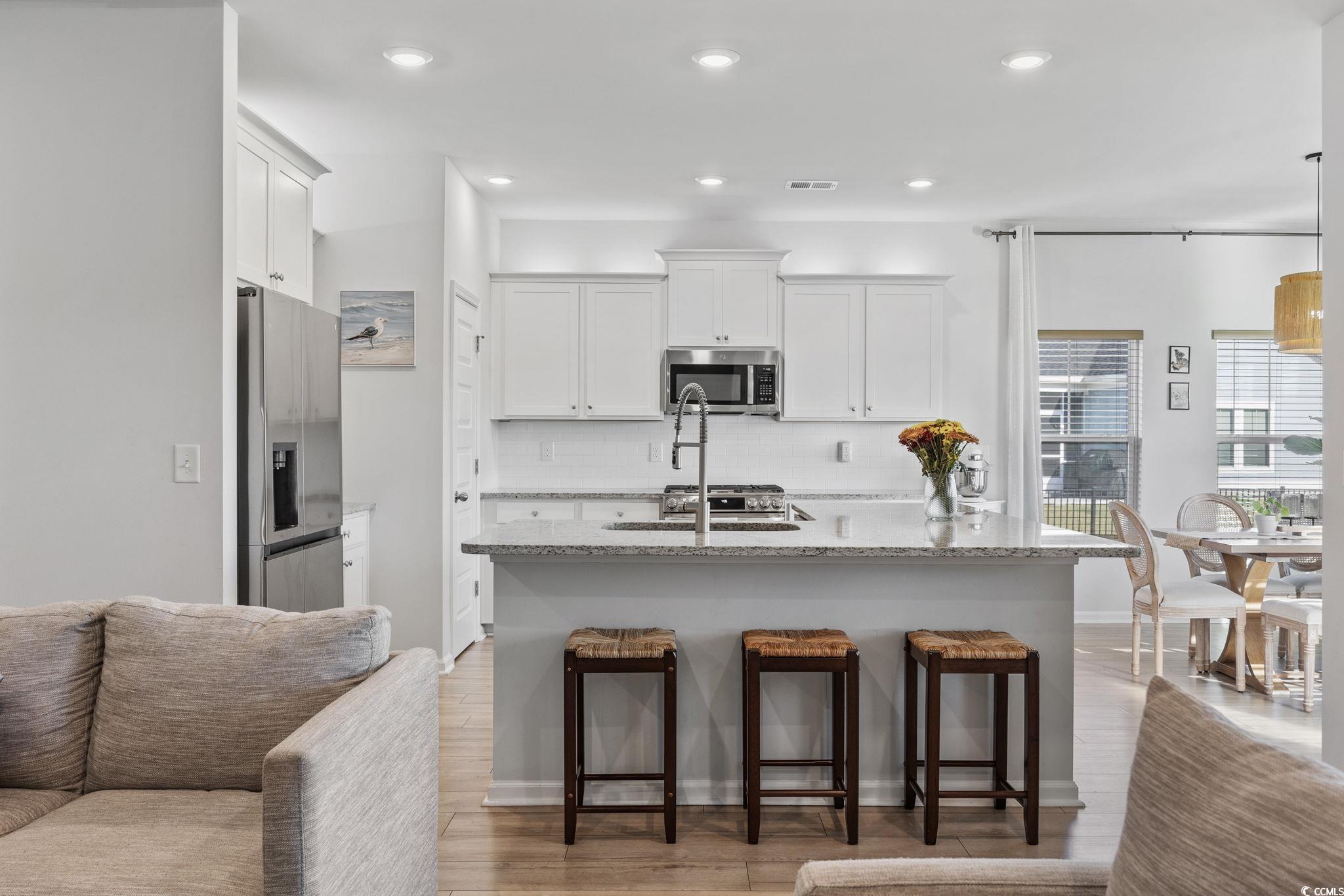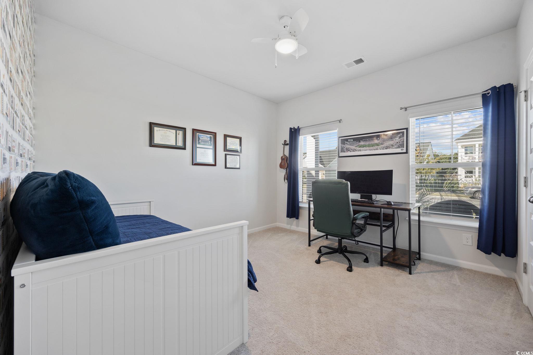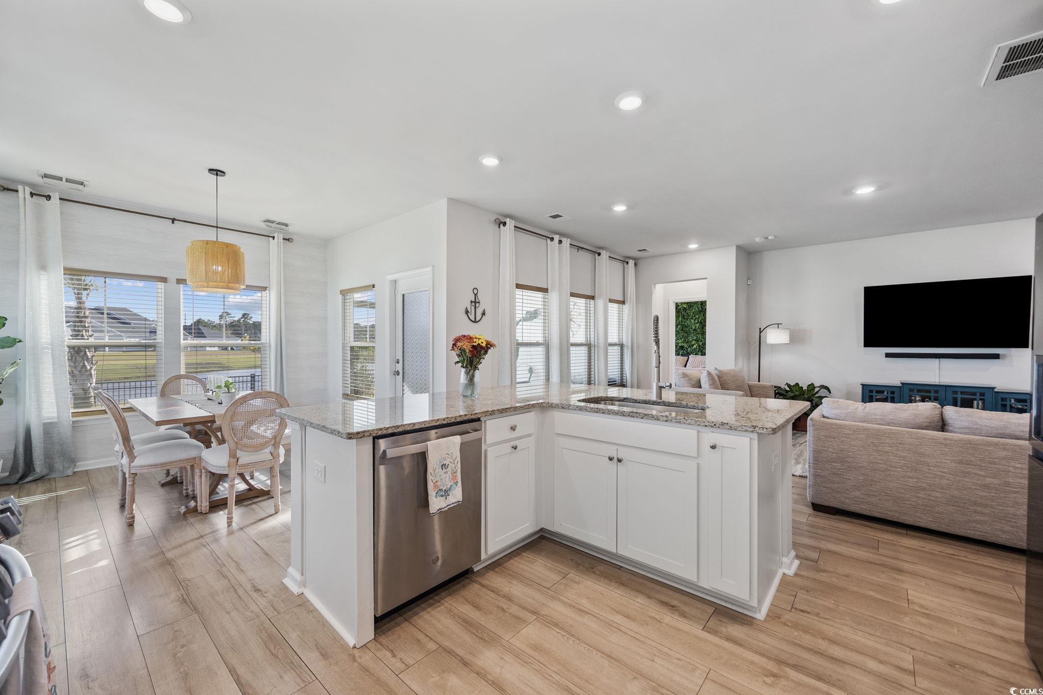 Welcome to this remarkable 5-bedroom, 3-bath home in The Preserve at Pine Lakes, a premier golf course community in Myrtle Beach. Nestled on a scenic lake lot, this home showcases timeless Southern charm with a spacious front porch, hurricane shutters meeting the SC Safe Home Opening Protection Guidelines, and beautiful landscaping featuring Carolina river rock, two backyard palm trees, and Pindo and Sago palms in the front. Step inside to a custom entryway with elegant wainscoting that sets the tone for the rest of the home. The layout is bright and inviting, with abundant windows dressed in cordless faux wood plantation blinds, upgraded light fixtures, and ceiling fans throughout. The heart of the home is the upgraded kitchen, complete with a brand-new stove and double oven, a separate pantry, above-cabinet lighting, and plenty of counter space for everyday cooking and entertaining. The adjoining living areas flow seamlessly, perfect for gatherings with family and friends. The main level offers comfortable bedrooms, while two additional bedrooms upstairs provide ideal space for guests, a home office, or a quiet retreat. The laundry room has been enhanced with newly added shelving, and a washer and dryer are included for convenience. A Rinnai tankless water heater with a full freeze protection kit ensures comfort and efficiency year-round. Enjoy peaceful mornings and relaxing evenings on the large front or back porch. The single-pane screened-in back porch features maintenance-free composite decking and overlooks serene lake views. A golf cart ride will take you straight to the beach, and furniture and golf cart are negotiable. Residents of this sought-after community enjoy resort-style amenities including a sparkling pool, walking trails, and tennis/pickleball courts. Located just minutes from the beach, dining, entertainment, and Highway 17, this home offers the perfect blend of lifestyle, location, and luxury.