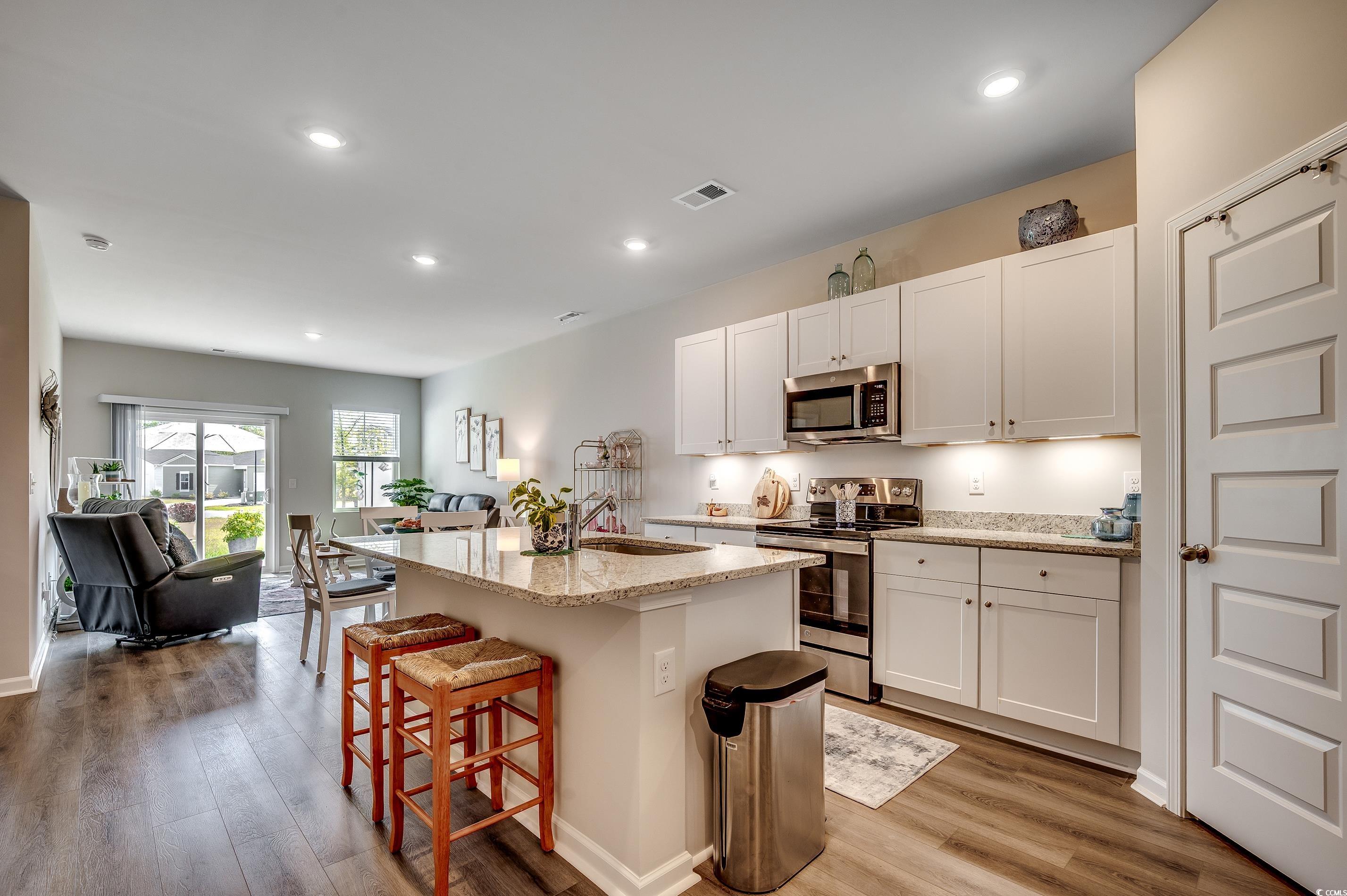 Lovely community of Cooper's Bluff offers this 3-bedroom and 3 full bath townhome with a garage. It's nicely laid out with a downstairs primary suite with a low-rise walk-in shower, an added shower slider, and a large closet. Another bedroom downstairs works great as a TV room or a nice home office. There's a 3rd bedroom suite upstairs, which also has a large storage room. Luxury vinyl wood-style floors dress the downstairs, and bedrooms are carpeted. There's a roomy backyard area with a privacy fence between units, and there is the option to fully fence the back area space. A nice-sized patio is on the back of the home as well. Low HOAs offer lawn care, a community pool, a community garden, and a playground area. This location is convenient to area schools, dining, shopping, and close to the Airport and hospitals. Hwy 544, 707, and 31 are very close in proximity to Cooper's Bluff