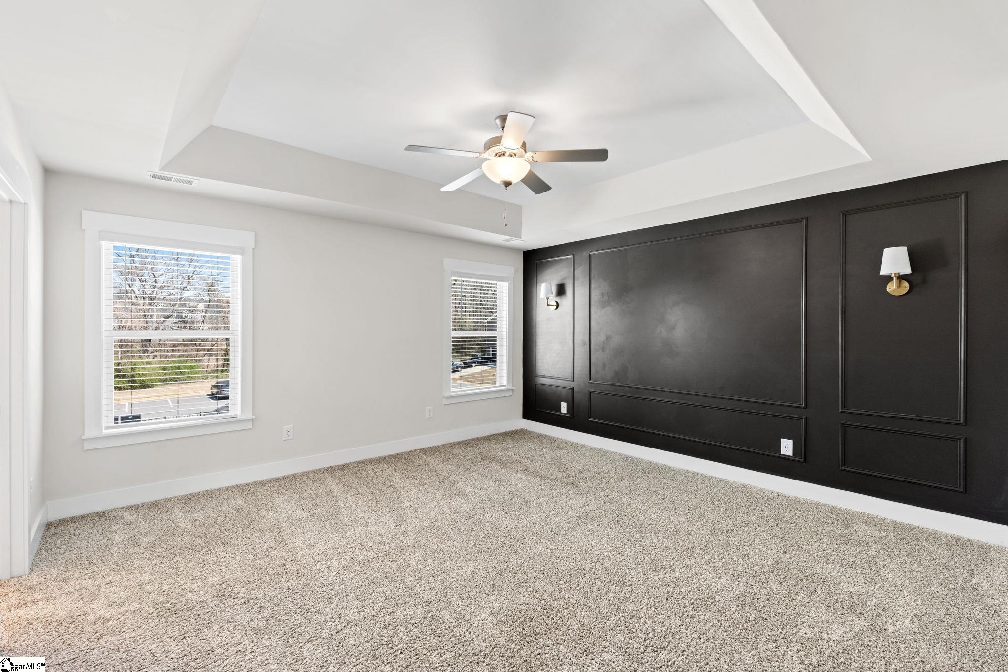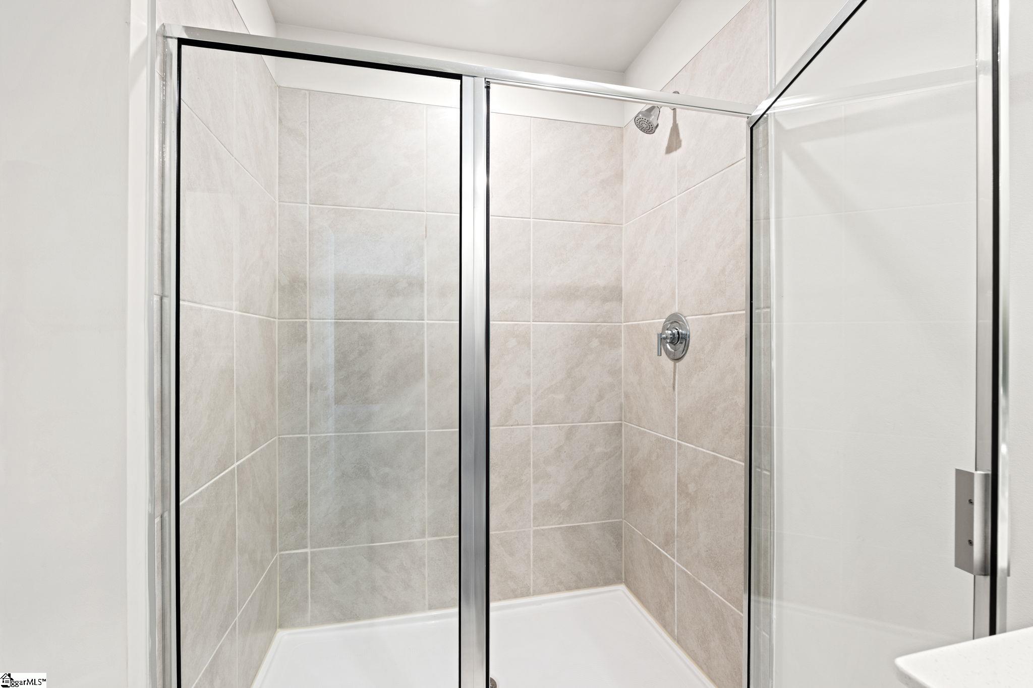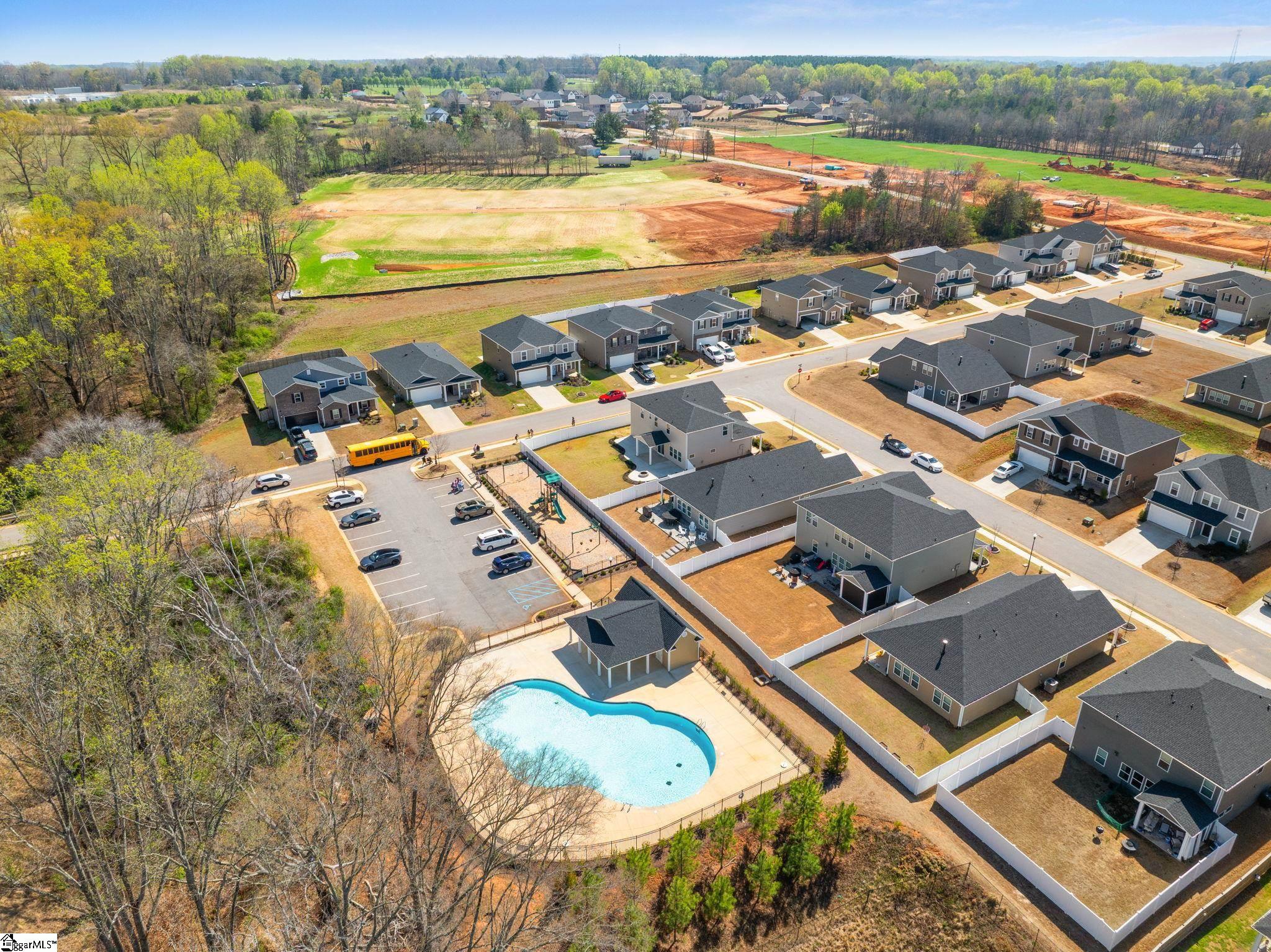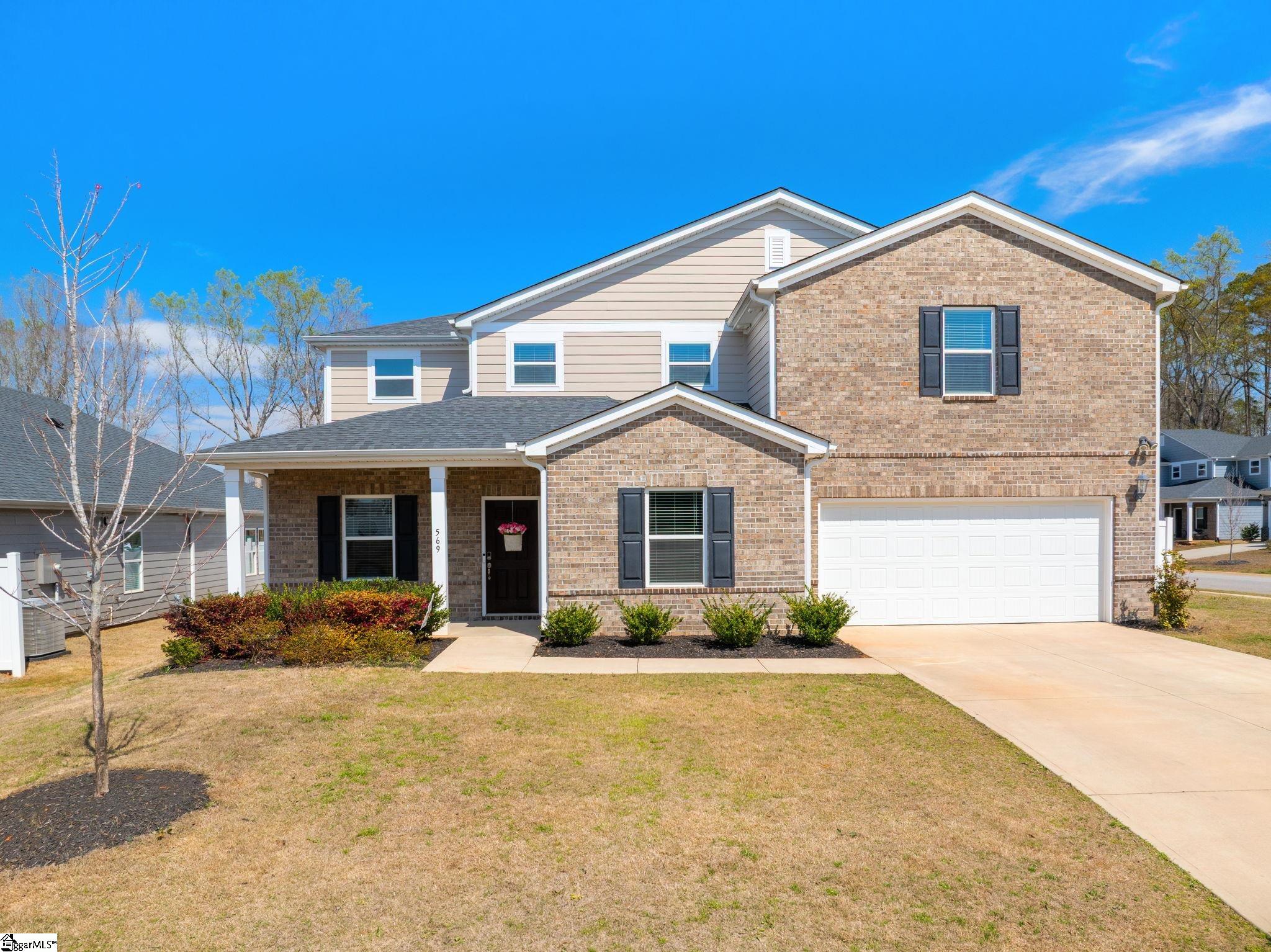 Beautifully designed two-story home featuring 5 bedrooms and 3 full baths, including a convenient main-level bedroom and full bath is perfect for guests or multi-generational living. The main floor showcases durable LVP flooring throughout the flex room, great room, and kitchen. The flex room welcomes you with a striking wallpaper accent wall and built-in bookcases, while the great room offers a cozy gas log fireplace and ceiling fan. The kitchen is well-appointed with granite countertops, tiled backsplash, island, stainless steel appliances (gas slide-in range, built-in microwave, dishwasher, refrigerator), and a walk-in pantry. A bright breakfast area with a charming bump-out and wallpaper accent wall creates the perfect space for a buffet or hutch. Upstairs, the spacious primary suite features a stylish accent wall with sconces (USB-enabled), a dresser bump-out, and en-suite bath with tiled shower surround, double quartz vanity, separate water closet, and walk-in closet. Three additional bedrooms, loft and full bath with double vanity, complete the second level. All bathrooms feature tile flooring & quartz countertops, all bedrooms & loft have carpet. Enjoy outdoor living with a covered front porch, an expansive covered back patio with extensions on both sides and a built-in fireplace, overlooking a vinyl-fenced backyard on a corner lot. Additional highlights include additional storage in the closet under the staircase and a built-in drop zone off the entry to the 3-car tandem garage (double-width door with space for a third vehicle, golf cart, or motorcycle). Ideally located with easy access to Hwy 101, I-85, Hwy 290, and Five Forks. Community amenities include playground and pool. Spartanburg District 5 Schools.