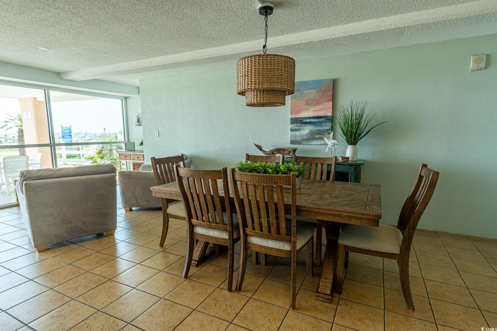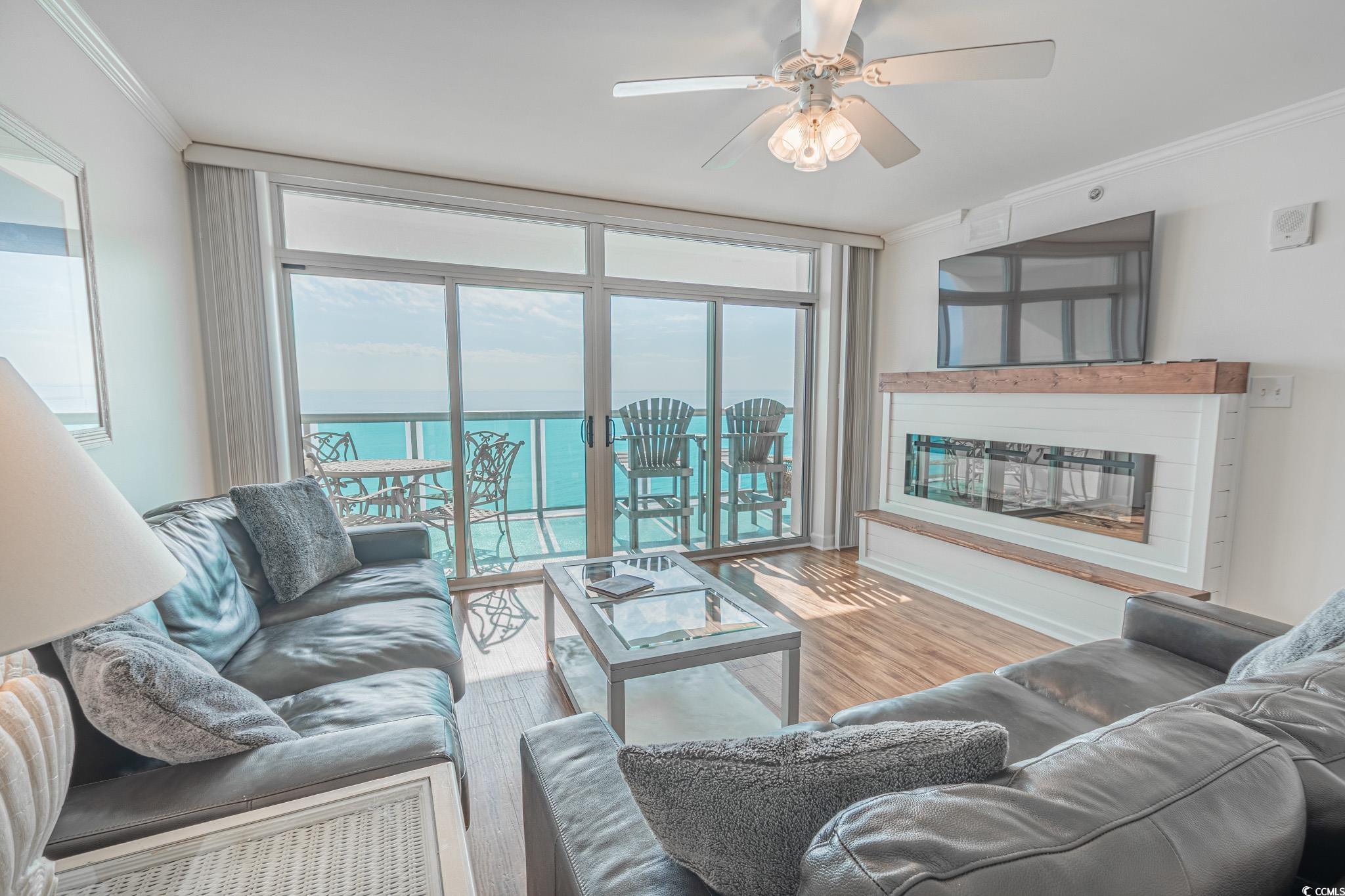 Elegant three-bedroom, three-bath fully furnished oceanfront condo located in the highly desirable Laguna Keyes in Cherry Grove. This beautifully maintained unit features LVP flooring, tile in wet areas, and smooth ceilings throughout. The kitchen is equipped with stainless steel appliances—newly replaced in August 2024, including the microwave, dishwasher, and stove—along with ample soft close cabinetry for storage, a brand new single level quartz breakfast bar , and a convenient kitchen–dining area combination. The spacious living room features a gorgeous new electric fireplace with shiplap accents, crown molding, a ceiling fan, and offers breathtaking ocean views with double sliding glass doors that open to the private balcony. The primary suite also showcases stunning beach views and includes private balcony access, a ceiling fan, a walk-in closet, and an en-suite bathroom with a vanity and custom-tiled shower with glass door. The two additional bedrooms each feature ceiling fans and their own private bathrooms with vanities and stand-up showers, offering comfort and privacy for guests. Additional interior highlights include a linen closet and a brand new stackable washer and dryer. All mattresses and sofas were replaced within the last two years. Laguna Keyes amenities include indoor and outdoor pools, a spa and lazy river on the 6th floor, fitness center extra private storage on the 3rd floor, private beach access, lounge areas, and a prime location close to dining, shopping, and entertainment. Square footage is approximate and not guaranteed; buyer is responsible for verification.