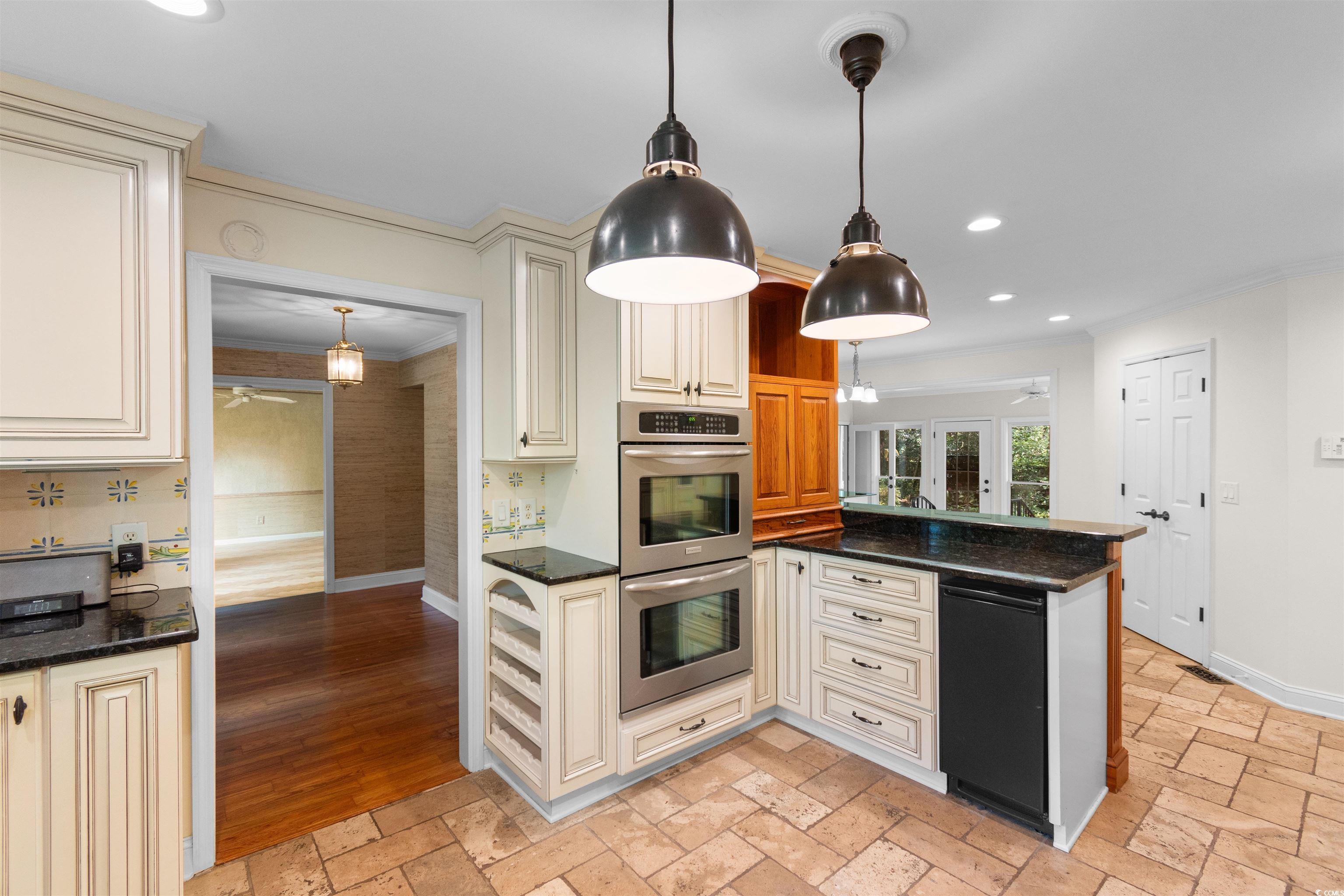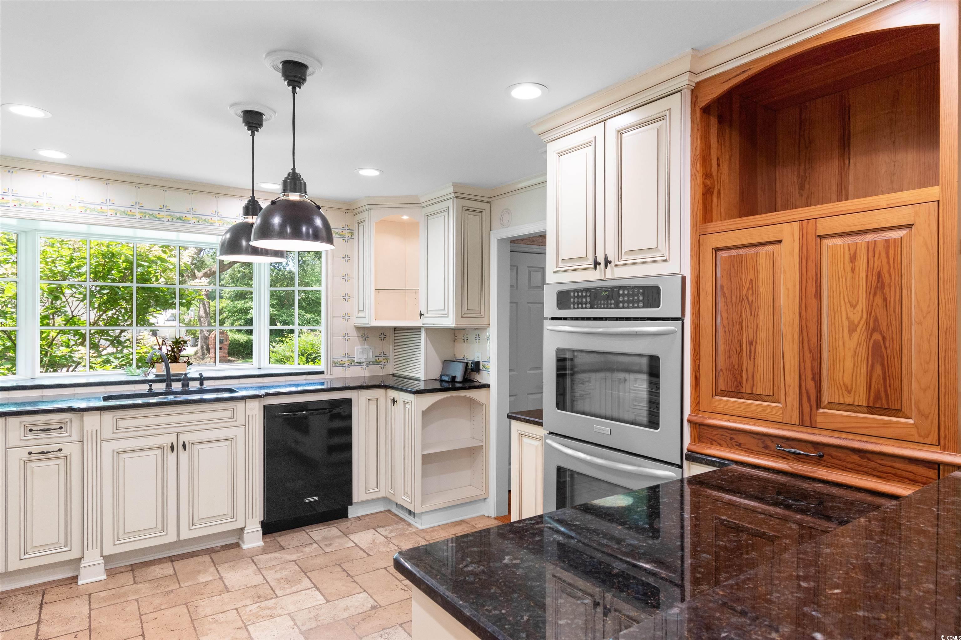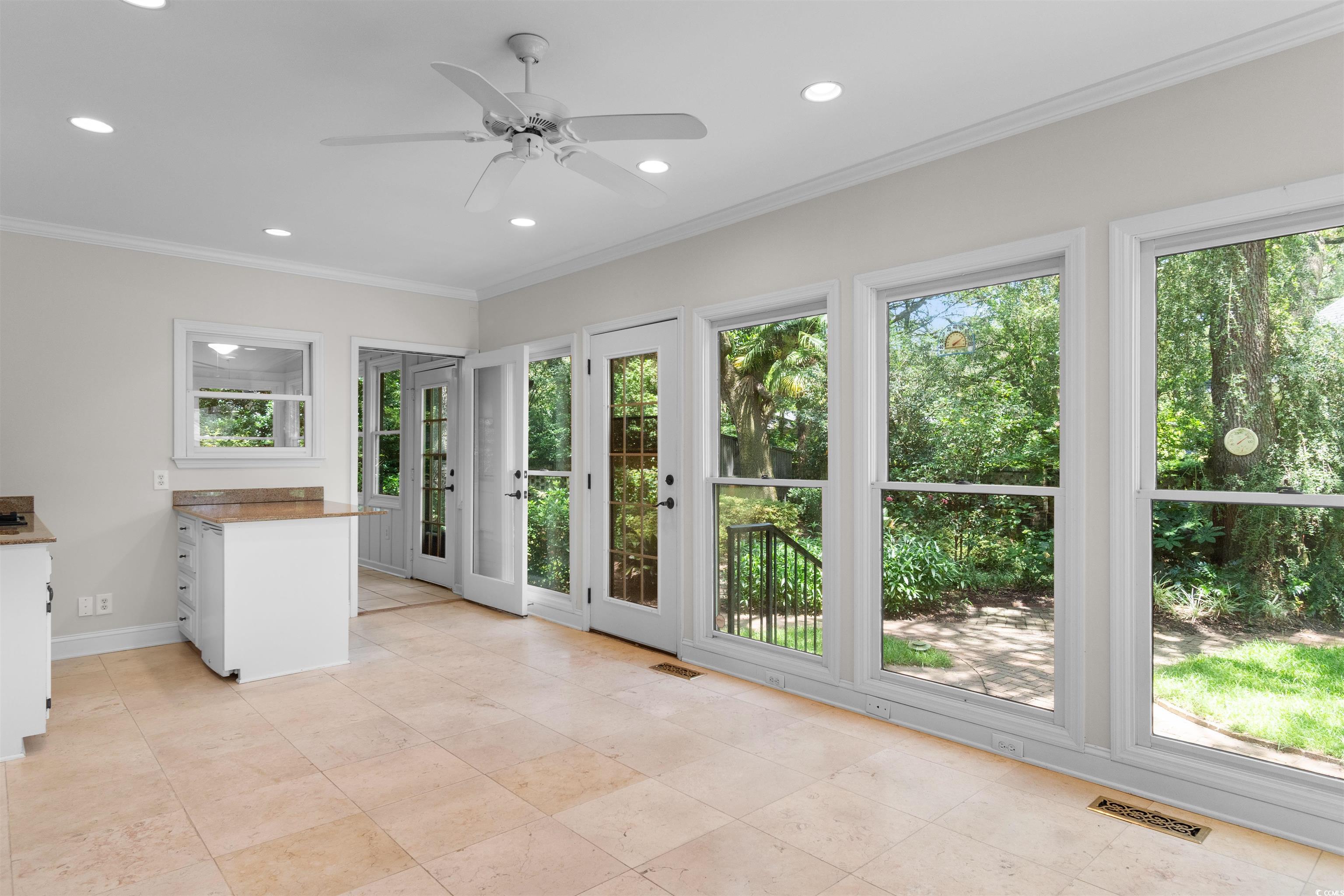 Custom Brick Home with Timeless Elegance and Thoughtful Upgrades This solidly built 4-bedroom, 2.5-bath brick home blends classic architecture with modern sophistication. A freshly painted interior and an attached 2-car garage make it truly move-in ready. At the heart of the home, the chef’s kitchen impresses with travertine marble flooring, custom cabinetry, hand-painted tile backsplash, Sub-Zero refrigerator, and a true double oven—perfect for everyday cooking or hosting with ease. The open dining space, also finished in travertine, flows into the welcoming family room for effortless gatherings. The elegant living room is a showstopper, featuring a custom Russian Oak herringbone-patterned floor, a full stone veneer fireplace wall with hidden outlets, and a gas fireplace that can easily be converted back to wood-burning. Built-in furniture-quality cabinetry adds both beauty and functionality. For added versatility, the family room and Carolina room include mini-kitchenettes, ideal for entertaining guests. The spacious primary suite offers two custom walk-in closets and a spa-like bath with separate vanities, a new tiled shower, and a soaking tub. Outdoors, the lush gardens create a setting reminiscent of Brookgreen Gardens, offering peace, privacy, and year-round beauty. A hard-wired propane generator provides peace of mind, while a private well supplies water for the pond and irrigation system—keeping the landscape vibrant and economical. This home is a rare find: thoughtfully updated, meticulously maintained, and designed for both comfortable living and elegant entertaining. * Measurements and square footage are approximate. The buyer/buyer's agent is responsible for verifying ALL information in the MLS including lot size, square footage, etc.