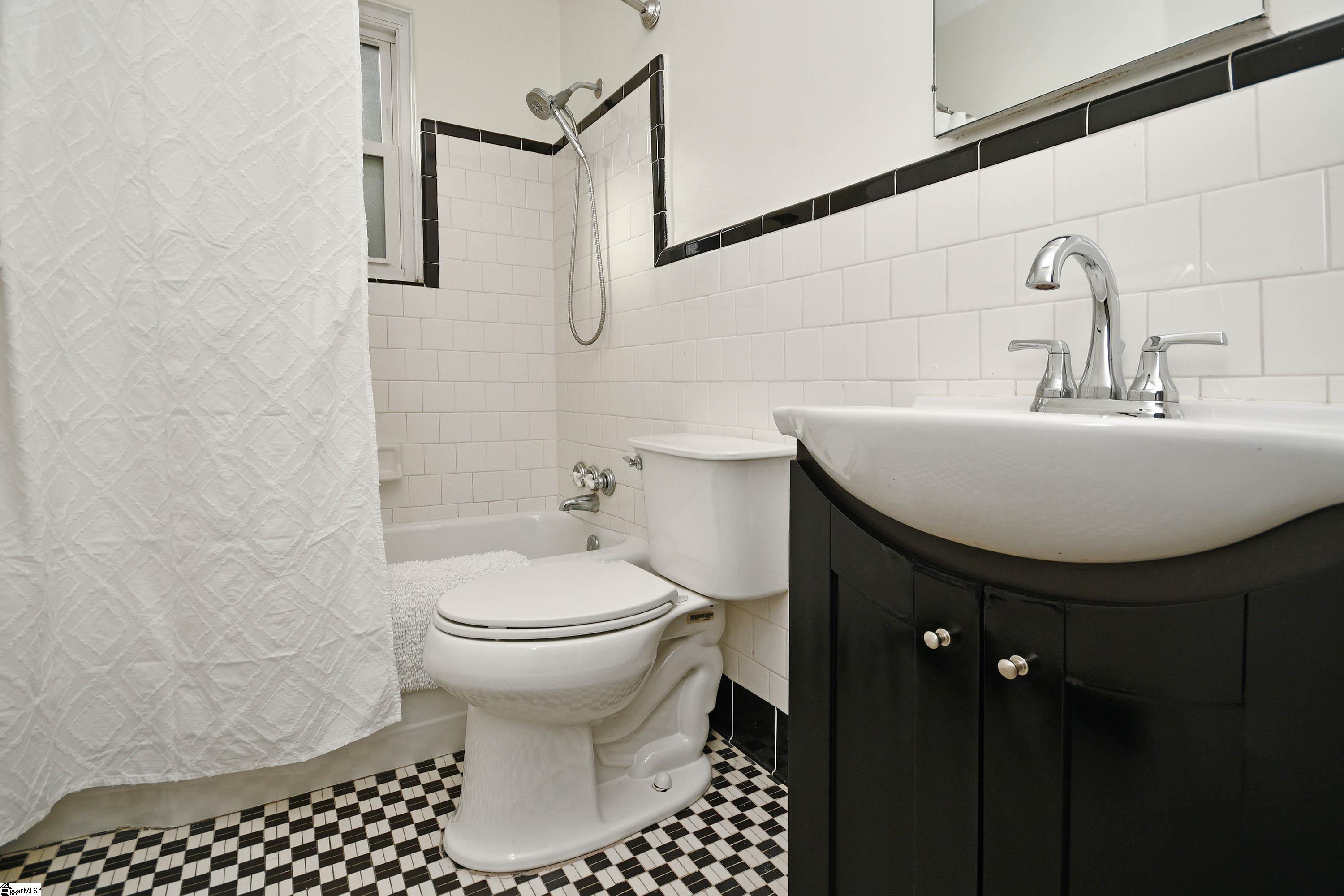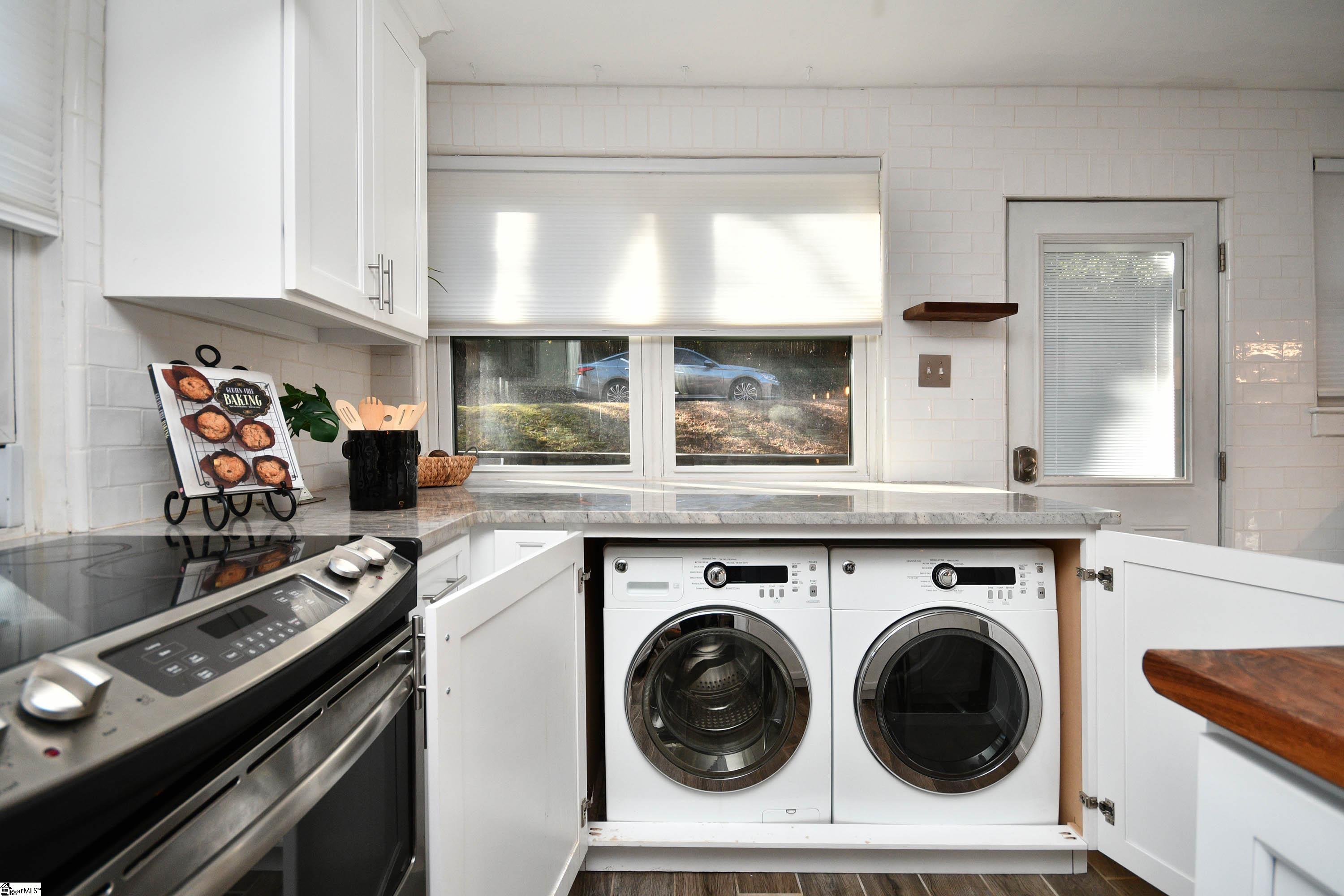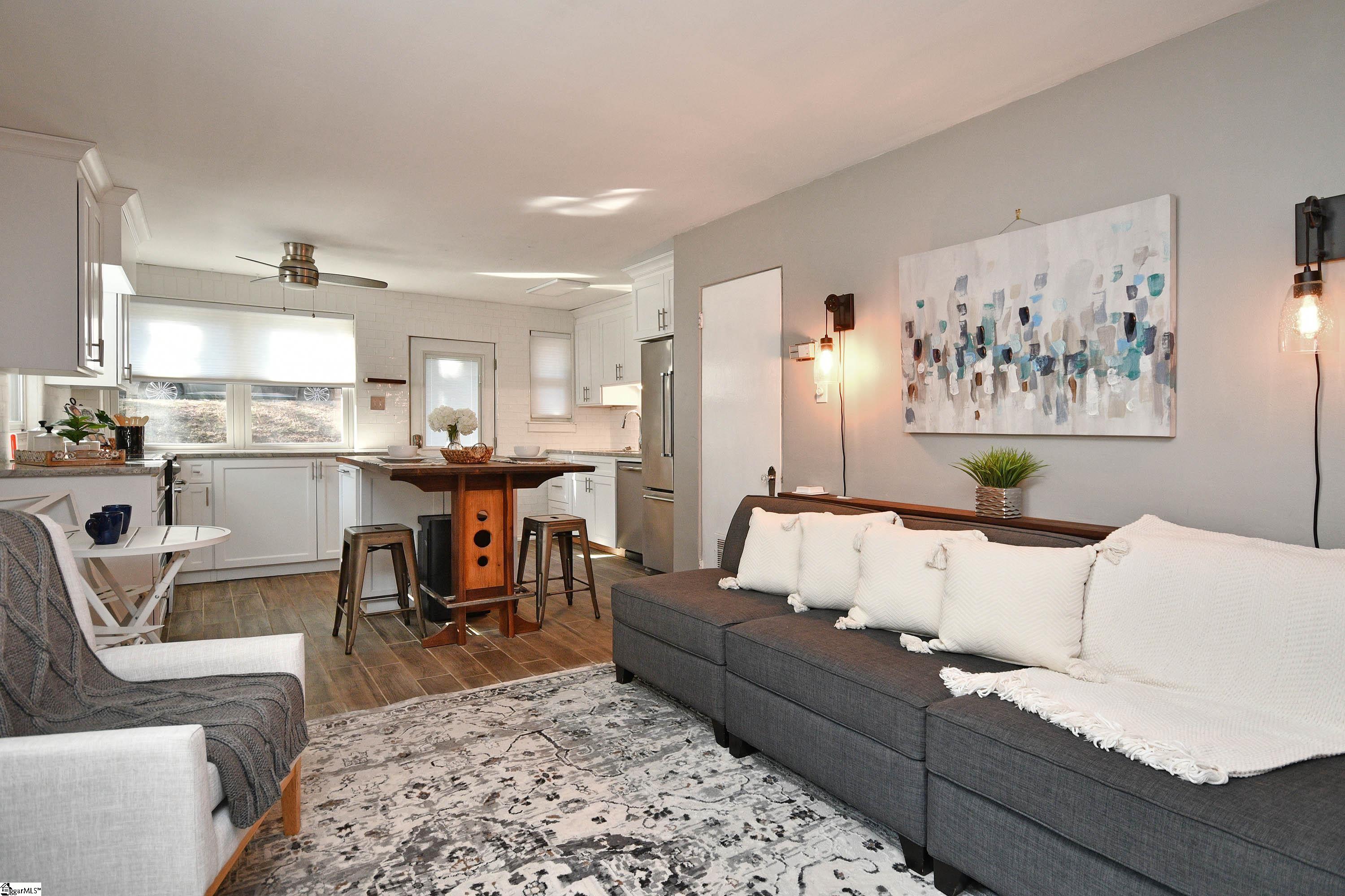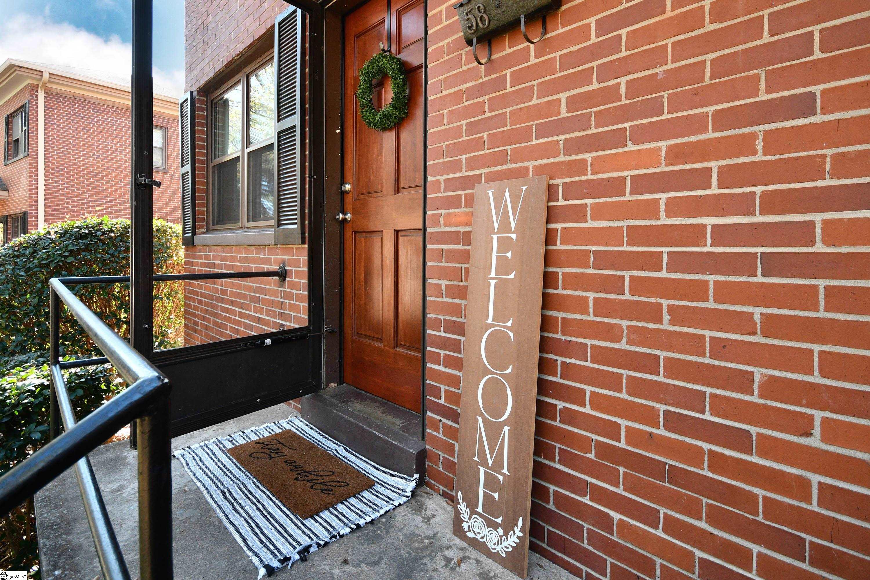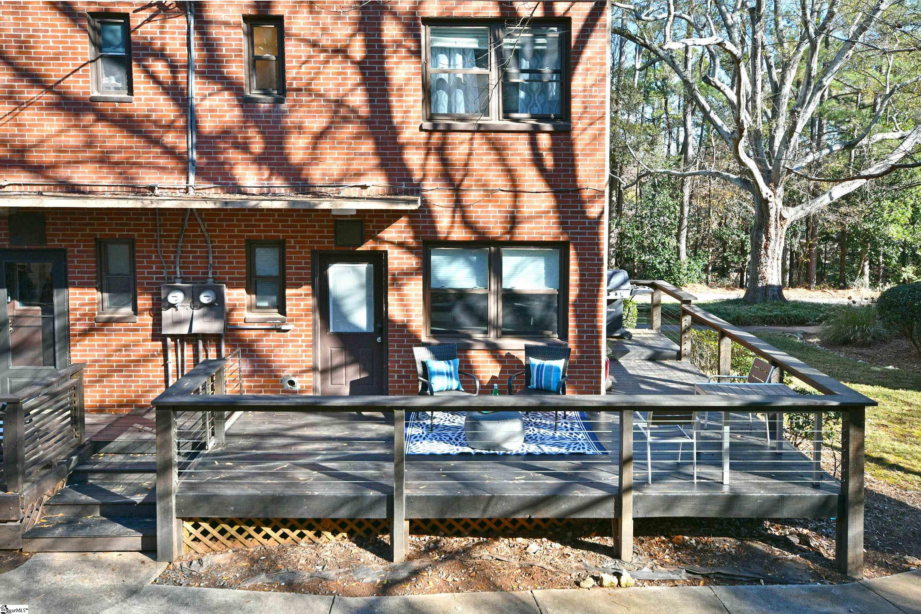 Looking for maintenance free living close to downtown Greenville in the prestigious Augusta Road area without the hefty price tag? This two-bedroom, one bath condo at Faris Ridge is perfect for you. Featuring a renovated open concept main level with a spacious kitchen complete with new plentiful cabinets, gleaming quartzite countertops, soft close cabinets and drawers, stainless steel appliances, custom walnut island, and under cabinet washer and dryer. Easily converse with your guests in the open living space while you are in the kitchen. The living area has custom cellular shades, wall sconces for extra lighting and ceramic floors. This end unit has the added bonus of more windows for extra light. Enjoy outdoor living on the oversized wrap around deck with room for an alfresco dining set and casual seating as well as a grill. Upstairs find the primary bedroom, secondary room that could be an office or bedroom, and full bath with reglazed tub. Storage includes a closet under the stairs one at the base of the stairs on the main level as well as three additional closets upstairs. Regime fees cover lawn maintenance, pest control, lights, water and trash. This condo is an easy walk from the Swamp Rabbit Trail or from all that Augusta Road has to offer. Don't miss the opportunity to live well in this beautiful area!