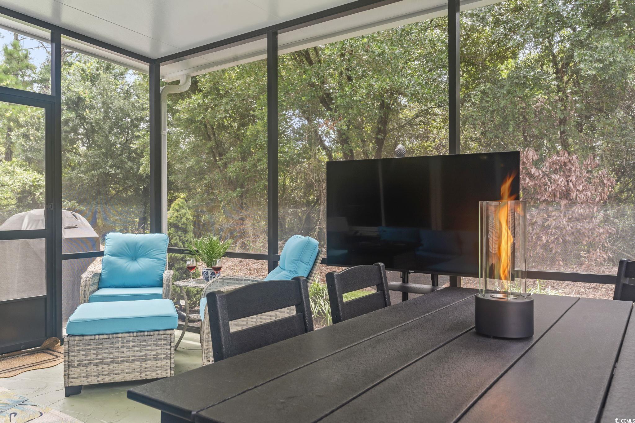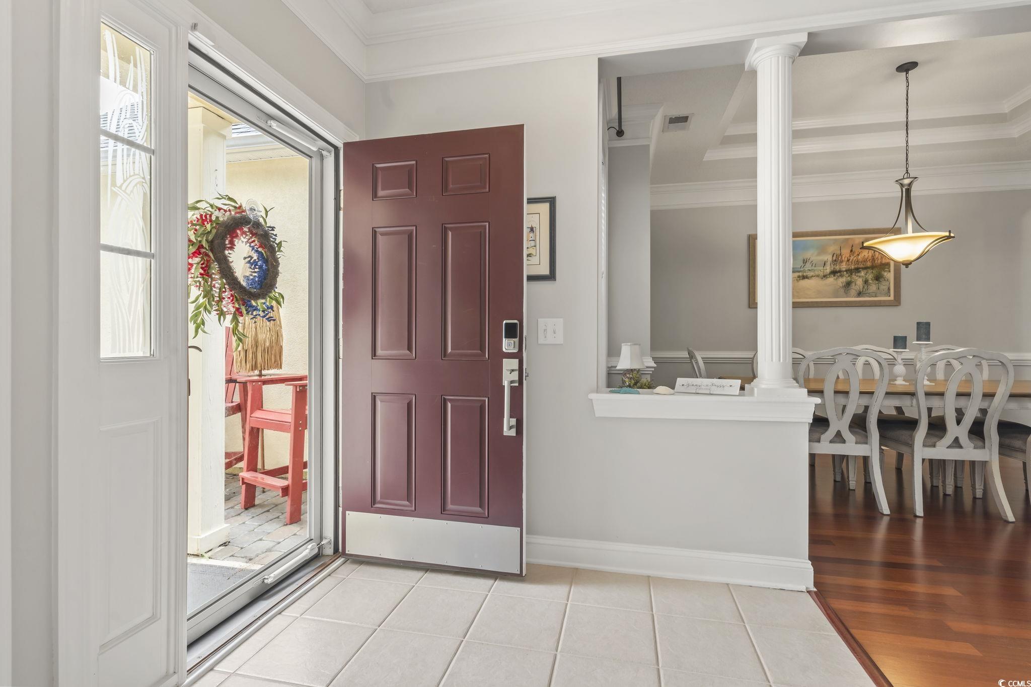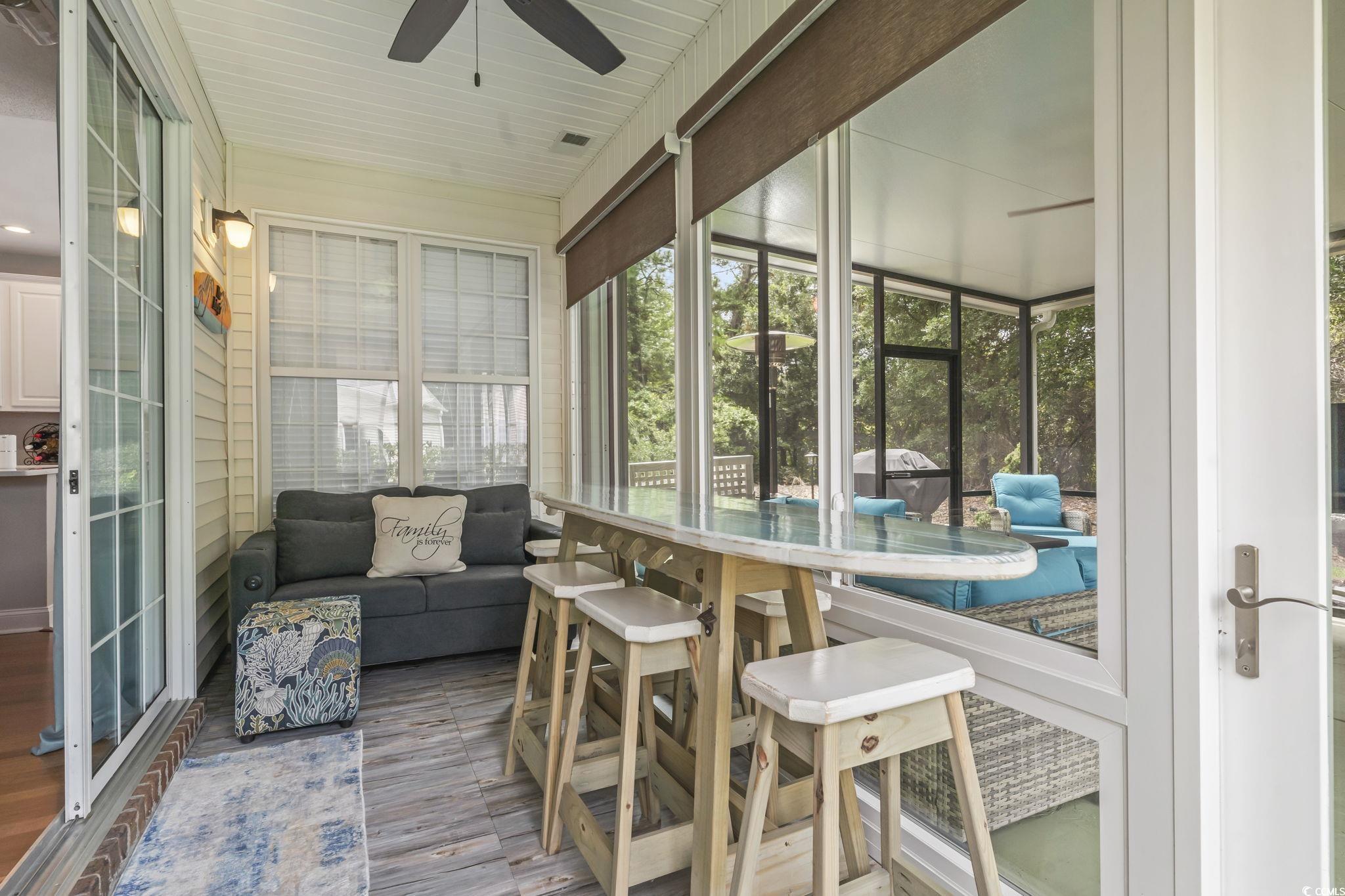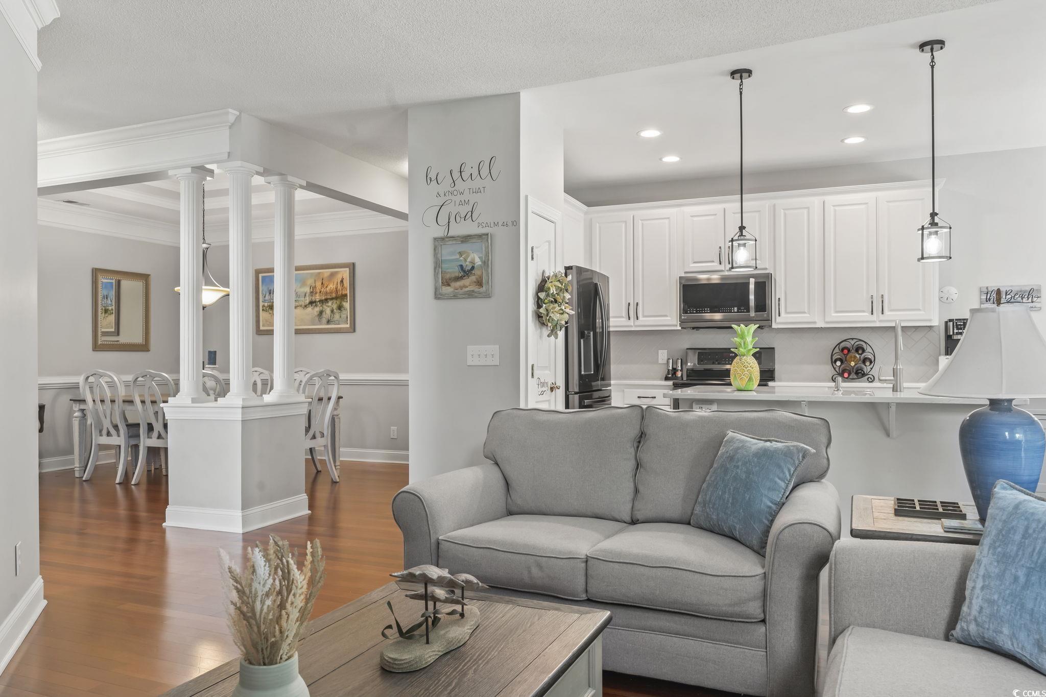 Discover coastal living in the heart of Barefoot Resort's Coquina Pointe! This beautifully updated 3BR/2BA home features rich cherry wood floors, an open split-bedroom layout, and a stunning kitchen with quartz countertops, stainless steel appliances, apron sink, and soft-close cabinetry. The formal dining room boasts tray ceilings and crown molding, while the spacious primary suite offers a custom walk-in closet and tiled shower. Enjoy year-round relaxation in the all-seasons sunroom or unwind on the screened porch overlooking the private backyard and tranquil fountain. Both guest rooms include custom Murphy beds and built-ins. Additional upgrades: custom storage in garage and laundry, smart fixtures, ceiling fans, and more. HOA covers cable, internet, phone, lawn care, trash/recycling, and use of resort amenities—including pools, clubhouse, fitness center, tennis/pickleball courts, and seasonal beach shuttle. Optional golf memberships available. Just minutes to beach, shopping, dining & entertainment!