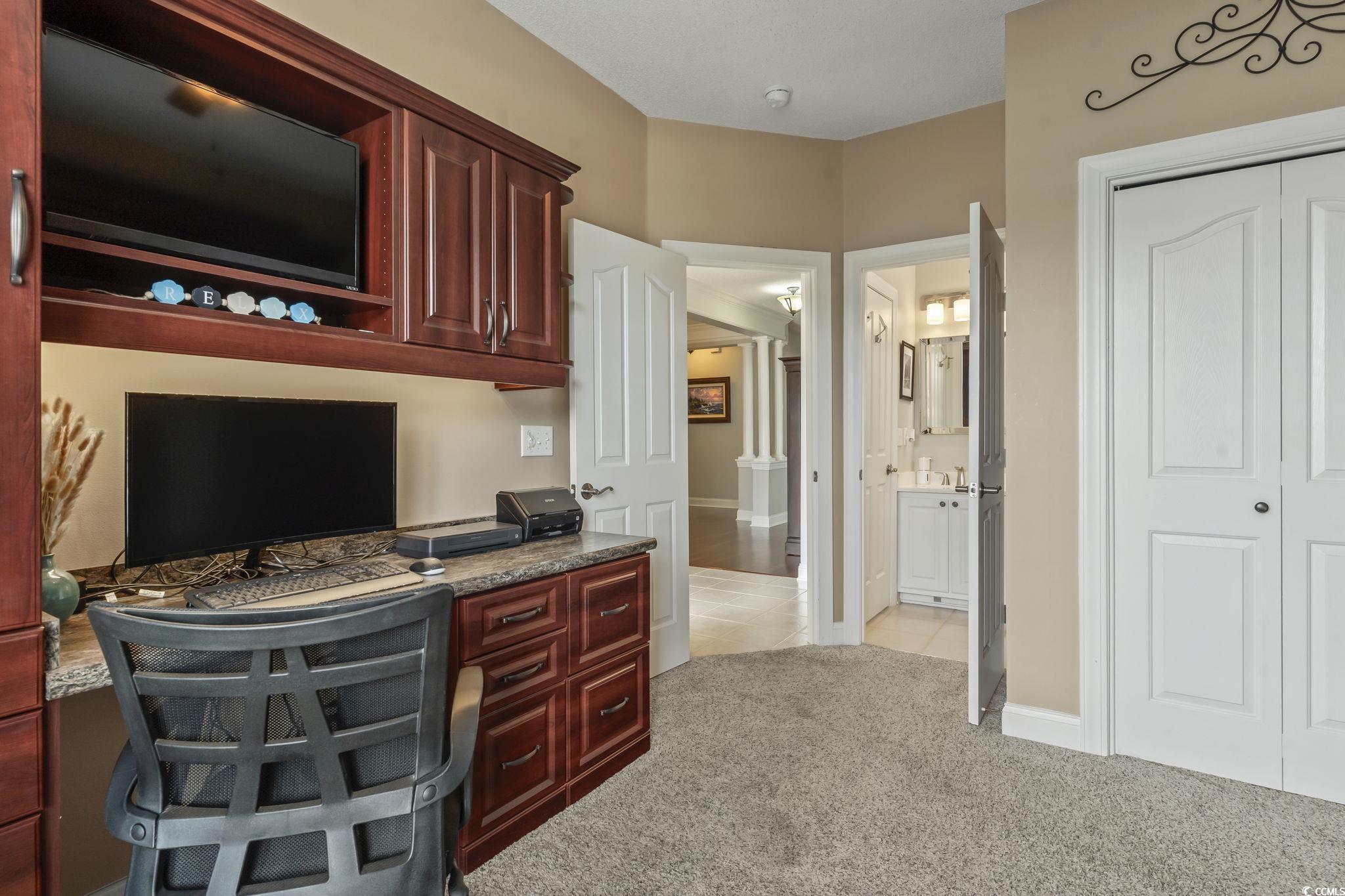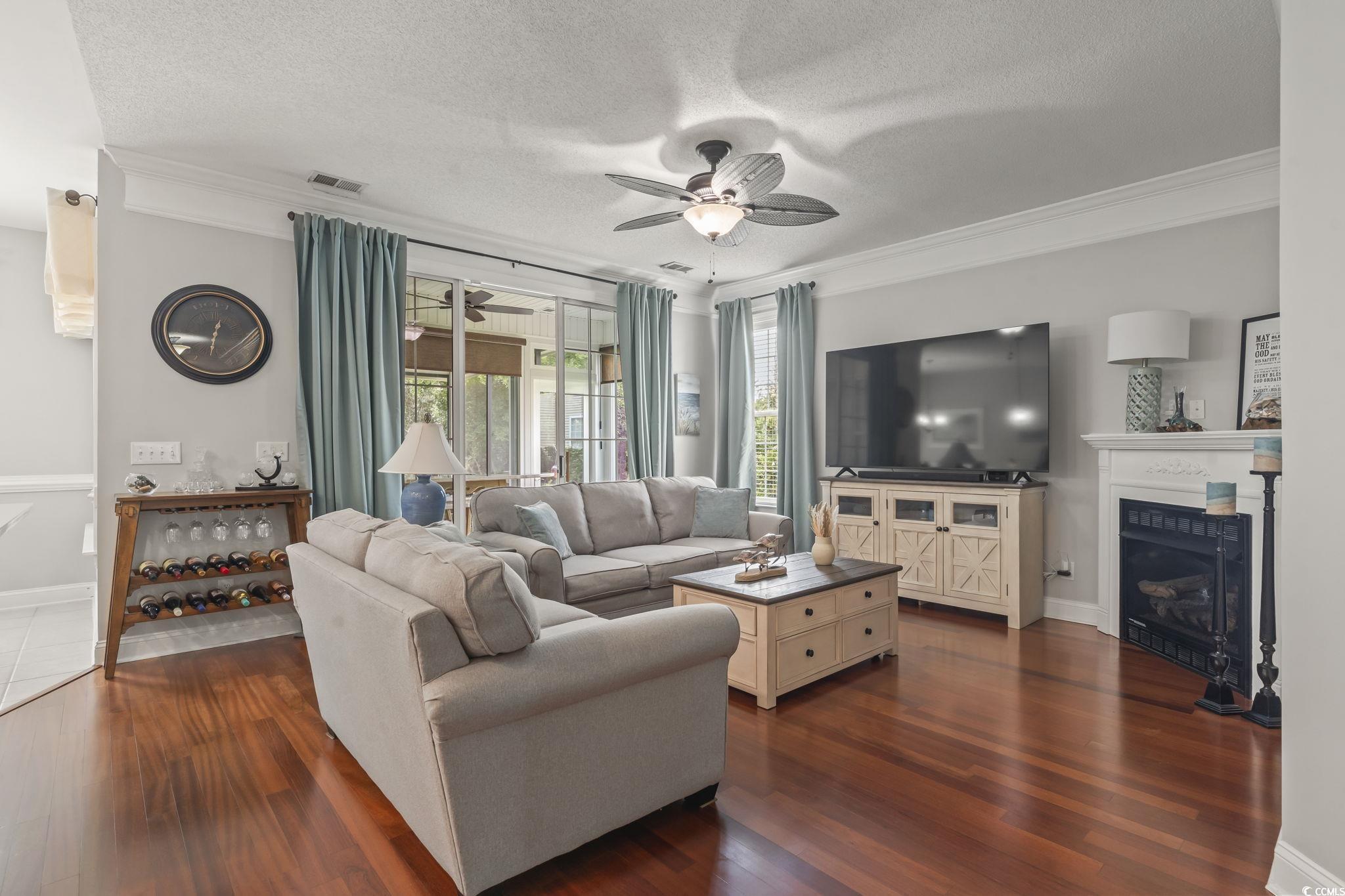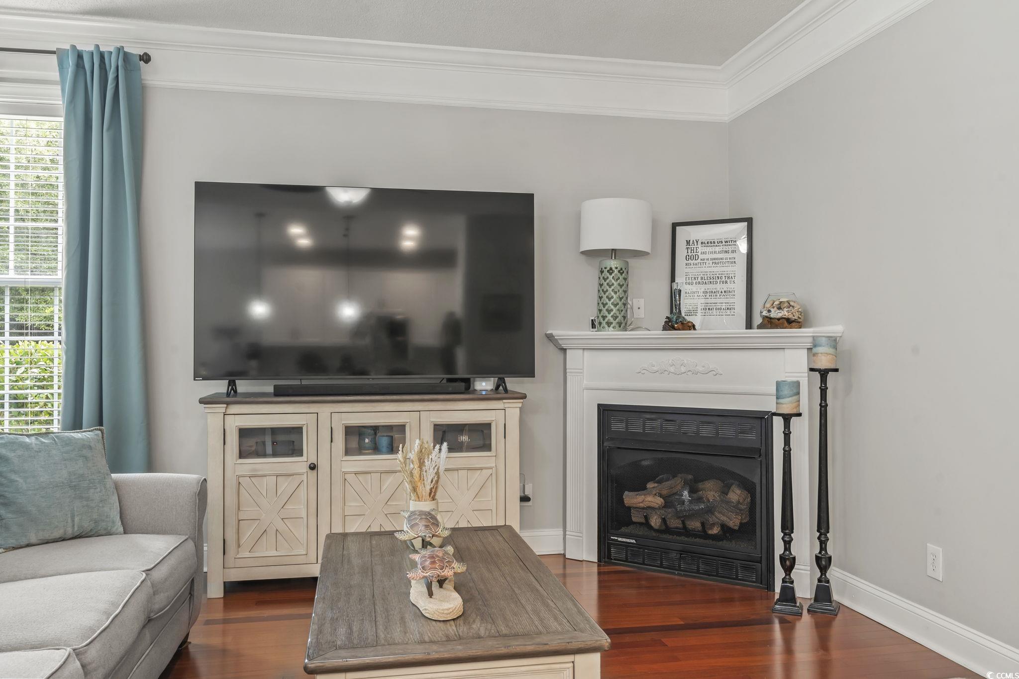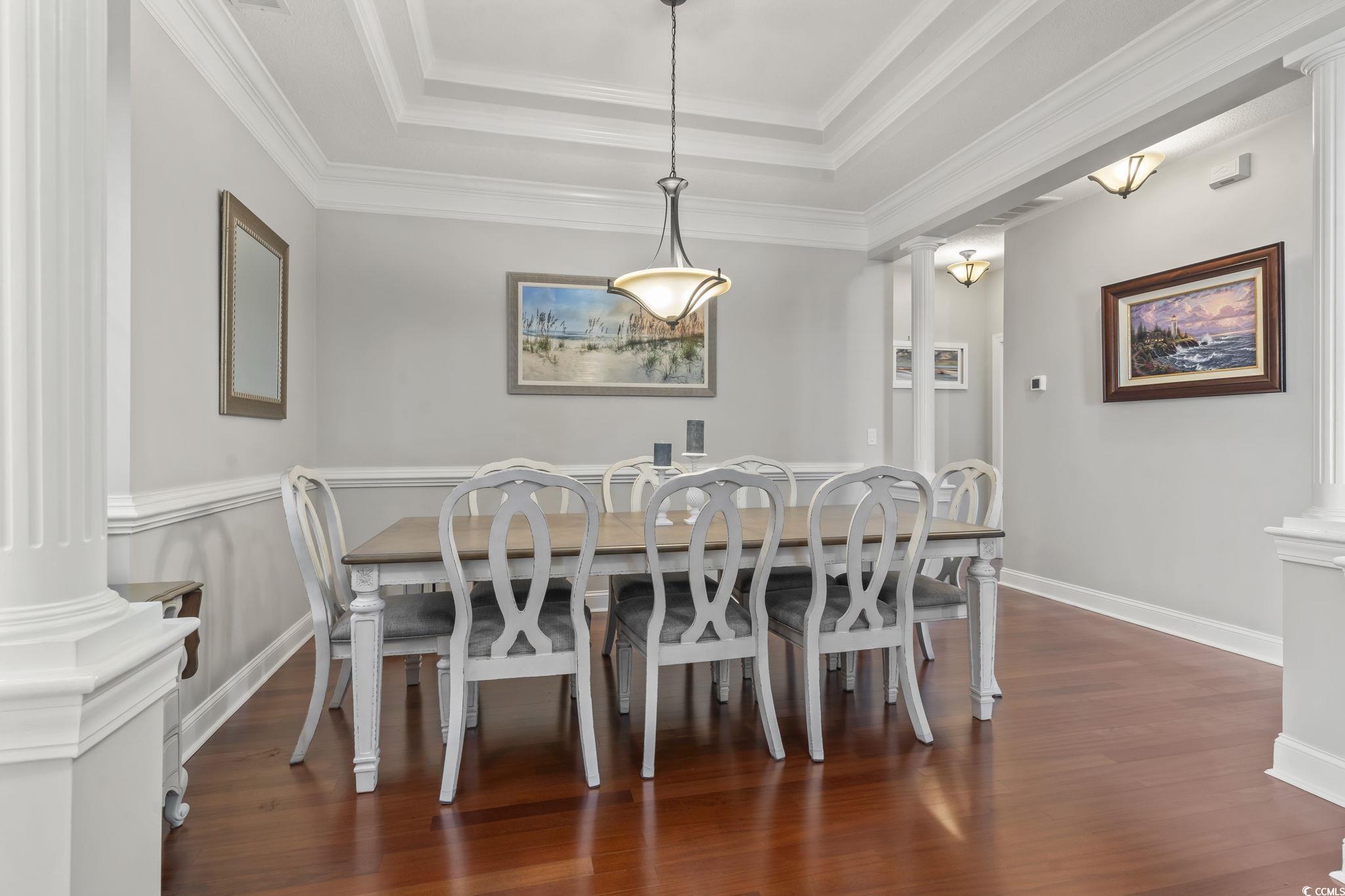 Discover coastal living in the heart of Barefoot Resort's Coquina Pointe! This beautifully updated 3BR/2BA home features rich cherry wood floors, an open split-bedroom layout, and a stunning kitchen with quartz countertops, stainless steel appliances, apron sink, and soft-close cabinetry. The formal dining room boasts tray ceilings and crown molding, while the spacious primary suite offers a custom walk-in closet and tiled shower. Enjoy year-round relaxation in the all-seasons sunroom or unwind on the screened porch overlooking the private backyard and tranquil fountain. Both guest rooms include custom Murphy beds and built-ins. Additional upgrades: custom storage in garage and laundry, smart fixtures, ceiling fans, and more. HOA covers cable, internet, phone, lawn care, trash/recycling, and use of resort amenities—including pools, clubhouse, fitness center, tennis/pickleball courts, and seasonal beach shuttle. Optional golf memberships available. Just minutes to beach, shopping, dining & entertainment!