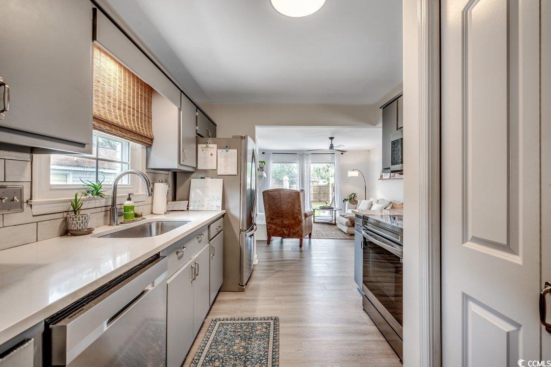 Desired Pine Lakes - this is your chance to own a completely renovated, turn-key home less than half a mile from the beach! Step inside to an updated kitchen featuring stainless steel appliances, granite countertops, and a striking tile backsplash. Relax in the open living area by the cozy fireplace or in the front room with expansive windows overlooking the front yard. The dining room offers plenty of space for family gatherings. The spacious master suite includes two closets, abundant natural light, and a beautifully renovated en-suite bath. The additional 2 bedrooms also have new windows and lots of light. Floors throughout are LVP and tile, combining style with durability. Entertain on your porch in the large, private backyard featuring beautiful trees and a new privacy fence. With upgraded landscaping, a spacious two-car garage, and plenty of driveway parking, this home has it all. Nestled on a quiet street, yet walking distance to Myrtle Beach’s finest restaurants, shops and grocery and of course our gorgeous beach—this home is the perfect blend of coastal convenience and modern living.