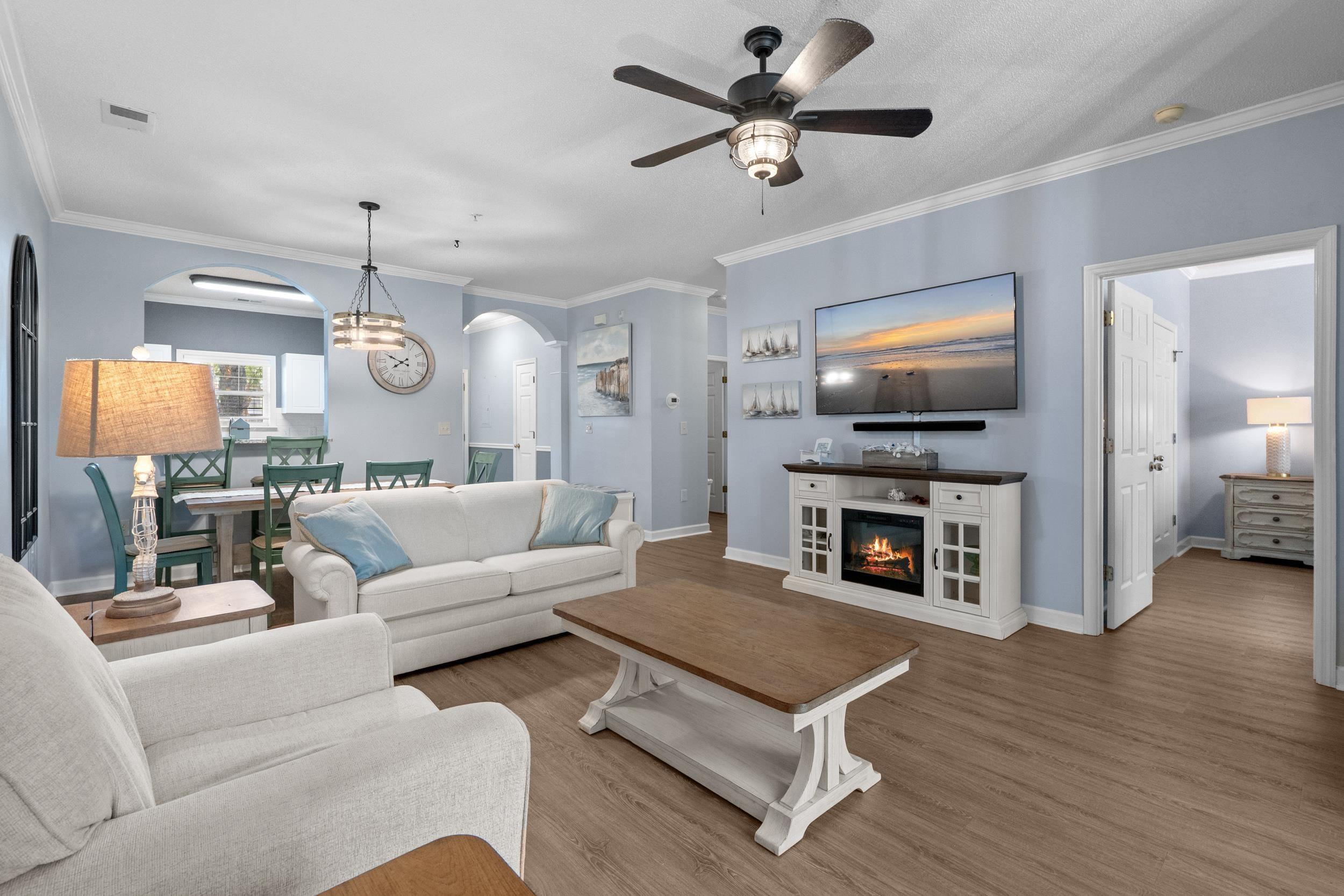 Updated 2 bedroom, 2 bath condo on the first floor offering a comfortable layout and impressive water and golf course views. The interior features a spacious living and dining area with upgraded flooring, fixtures, and finishes throughout. The kitchen has been enhanced with modern updates, providing plenty of cabinet space and a clean, functional design. The primary suite includes a private bath and generous closet space, while the second bedroom and full bath are well-suited for guests or additional living needs. Step out onto the screened in back porch to enjoy views of the pond and fountain, with the golf course just beyond—an ideal spot for morning coffee or unwinding at the end of the day. Low-maintenance living in a convenient location close to shops, dining, entertainment and just a short drive to the beach.