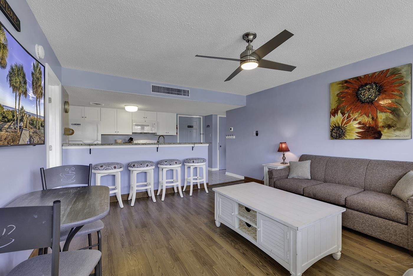 Welcome to Myrtle Beach Resort! This 2 bedroom 2 bath top floor condo in the Five Seasons section is currently looking for a new owner. It is rare to find a condo at this price point with the upgrades already done for you. The interior has had numerous improvements over the past several years, including new white kitchen cabinets, a full size range/oven, built in microwave, updated appliances, water heater, new bathroom vanities and more. The primary suite has its own private bath with tub/shower combination as well as access to the pond view balcony. The secondary bedroom is on the other side with quick access to the guest bathroom. The living area is spacious and light filled thanks to multiple windows and a glass panel balcony door providing plenty of room to spread out and relax after a day at the Beach. The fully stocked kitchen includes granite counters with a spacious breakfast bar for days you want to stay in and cook, and you are just minutes away from almost unlimited choices for dining out. This Resort is so very convenient to shopping, dining, and recreation that you wont spend much time in a car. The Myrtle Beach Resort is home to some to some of the best amenities in town. Indoor and outdoor pools, tennis and pickleball courts, a splash pad and lazy river, hot tubs, playground and more! There is an ocean front cafe and ice cream store (seasonal) with open air dining areas and of course access to the beautiful beach, all located inside a gated community. Short term and long term rentals are allowed, however would make a nice full time residence for those who want a maintenance free lifestyle. All utilities (except electric) and building insurance are included in HOA fee. Owners will need H06 for contents. Come see today!