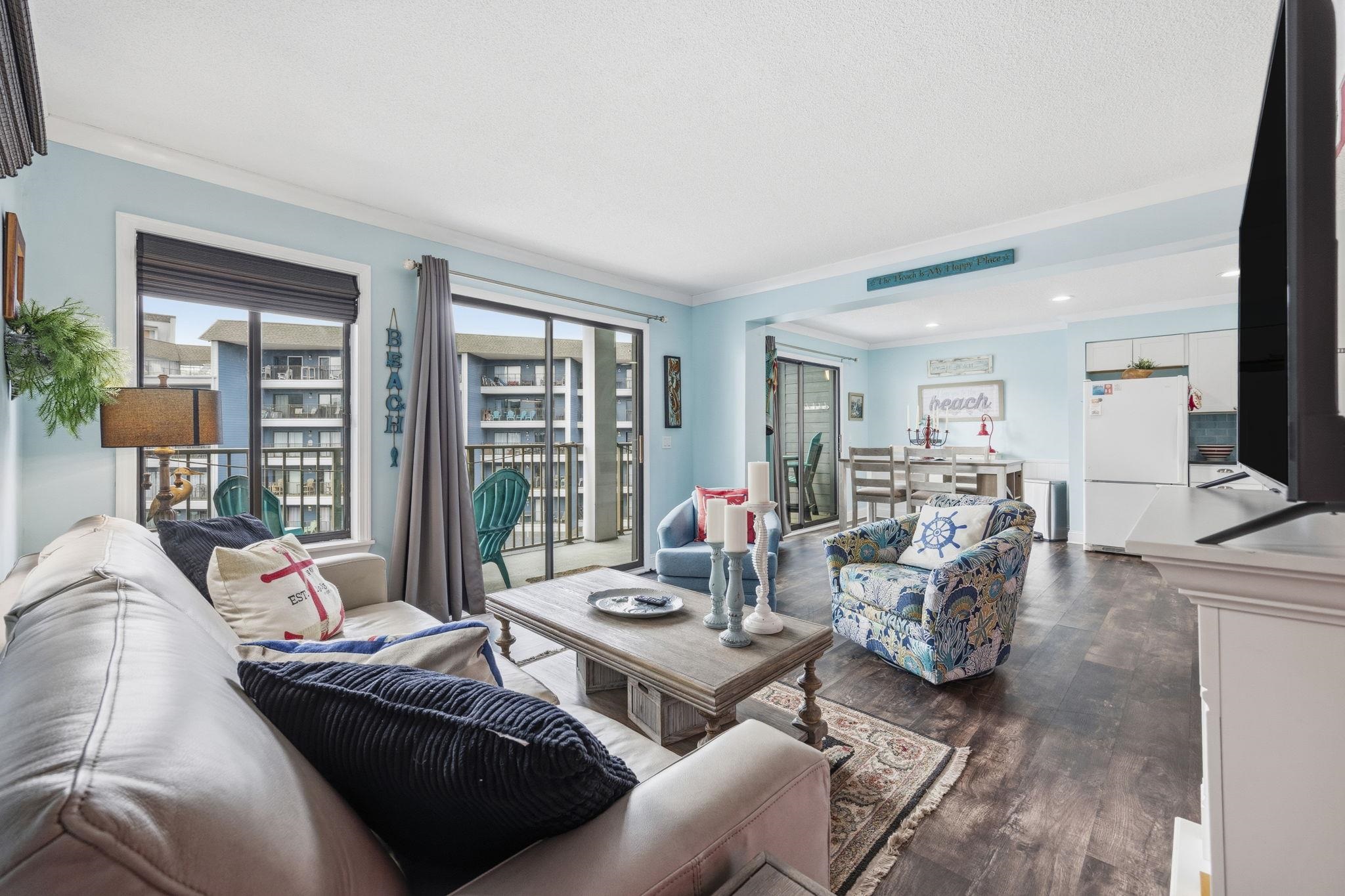 Enjoy beach life in this beautiful ocean view condo located in the popular Myrtle Beach Resort. This is a well maintained 2 bedroom, 2 bath condo that has been recently updated to feature an open concept layout in which. the kitchen, dining room, and living room flow together nicely. The kitchen features modern shaker style cabinets with ample storage, granite countertops, blue glass backsplash and a farmhouse sink. Dining room offers ample seating for you and guests. The living room is appointed with comfortable furnishings including a newer leather sofa, coastal decor, and an electric fireplace for year round enjoyment. This condo is located at a corner so it offers an additional window in the living room., Blinds and curtains adorn the windows and sliding doors for cohesive, tasteful appearance. The Myrtle Beach Resort is a 33 acre oceanfront resort offering numerous amenities, including indoor and outdoor pools, lazy river, hot tubs, gyms, basketball court, tennis courts, horseshoes, cornhole, club house, onsite necessity shop, snack stands, NY Pizza, Stella's Ice Cream, a private owners lounge, and so much more! Enjoy meals, drinks, and entertainment at the onsite bar and grill, the Quarter Deck, voted Best on the Beach! Everything you need for a great beach vacation is right here! The condo may be used as a primary home, second home, or investment property as it allows short term and long term rental. The Myrtle Beach International Airport and area attractions are just a short drive away. Schedule your showing now and let beach life begin!
