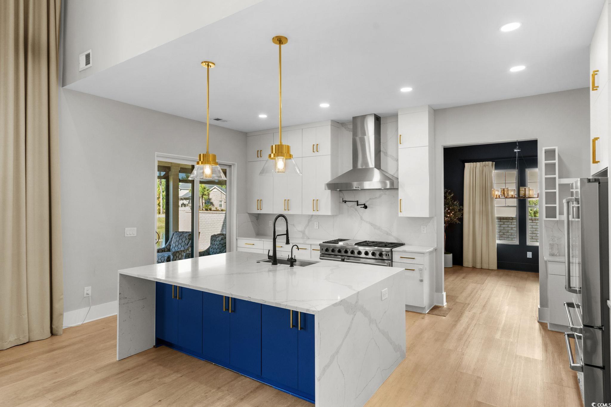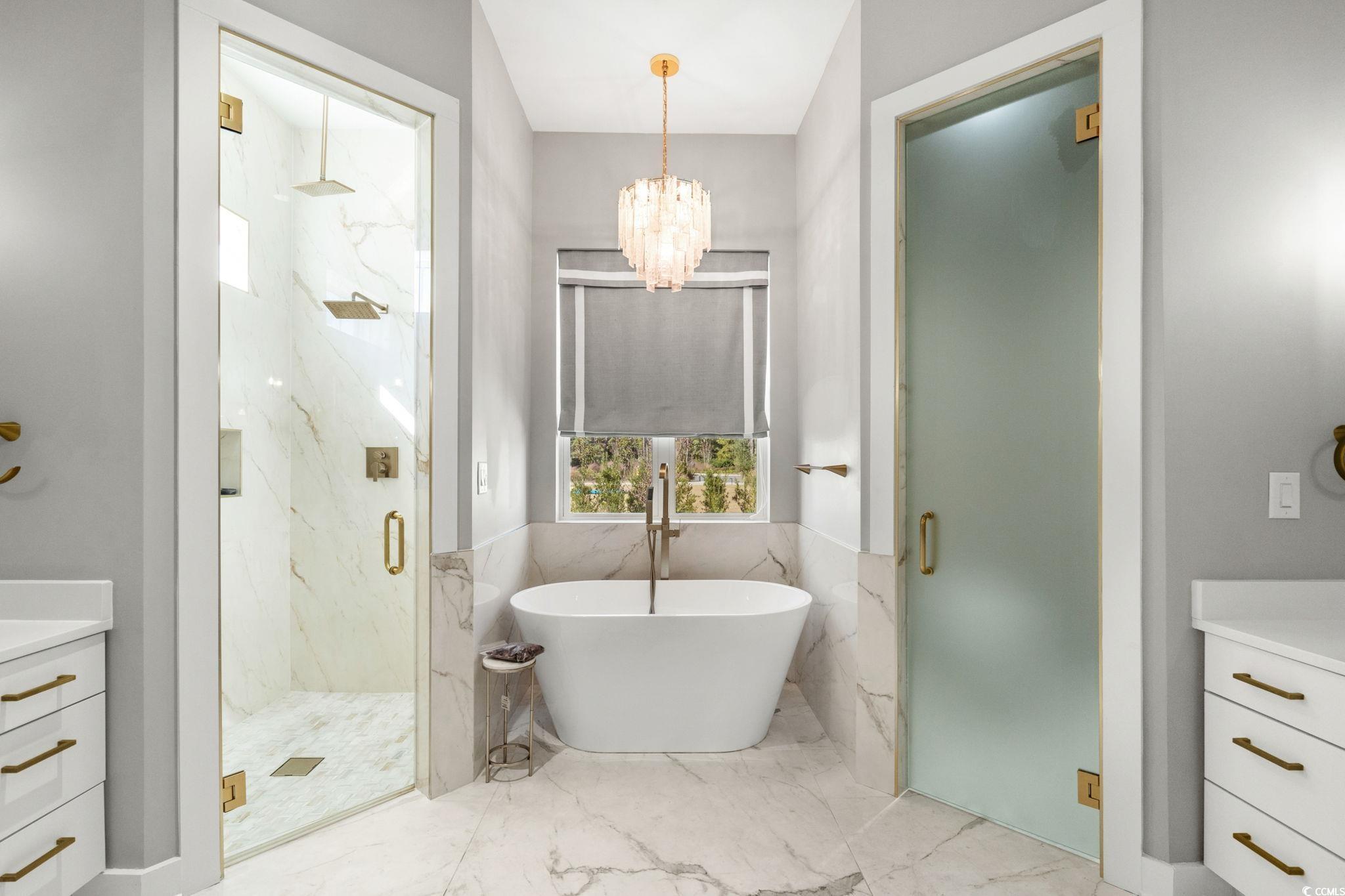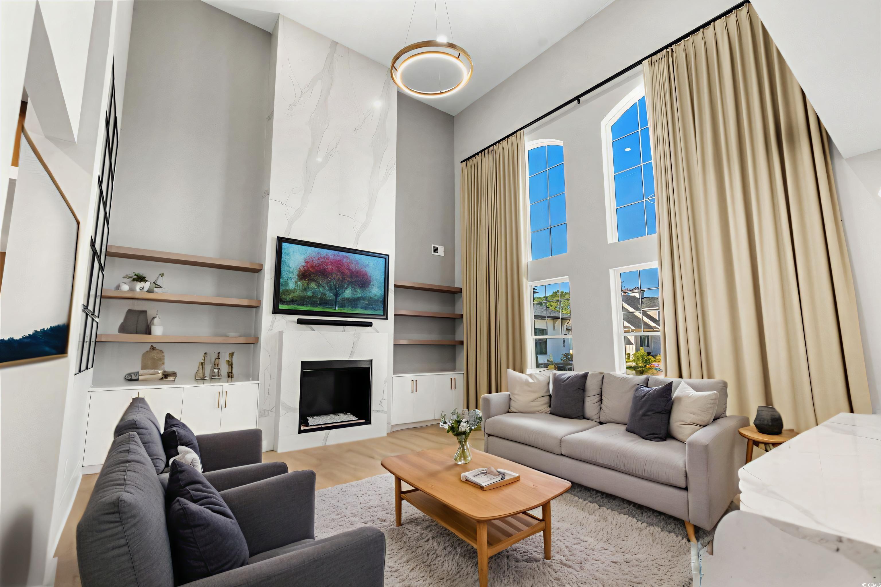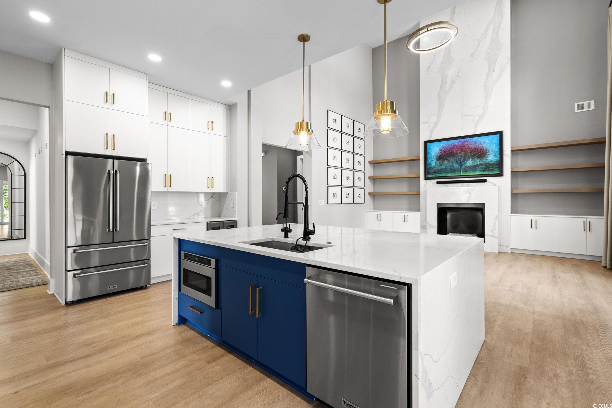 Situated in the prestigious and historic Pine Lakes Country Club, this custom-built residence blends timeless architecture with modern sophistication. Every detail reflects quality craftsmanship, from the soaring ceilings and expansive windows to the marble fireplace that anchors the grand living area. The designer kitchen is both striking and functional, featuring sleek white cabinetry, quartz countertops, and a bold navy island accented with gold hardware. Professional-grade stainless appliances, double ovens, a pot filler, and a walk-in pantry create the perfect balance between elegance and practicality. The primary suite on the main level offers a tranquil retreat with a spa-inspired bath, freestanding tub, spacious shower, and dual vanities. Upstairs, four additional bedrooms and three full baths provide comfort and flexibility. The fifth bedroom is exceptionally large, allowing for a private living area, home theater, fitness space, or multi-use room. The covered patio opens to a beautifully landscaped yard, ideal for relaxing or entertaining. Located minutes from the beach, fine dining, shopping, and entertainment, this home embodies the best of luxury living in one of Myrtle Beach’s most distinguished communities.