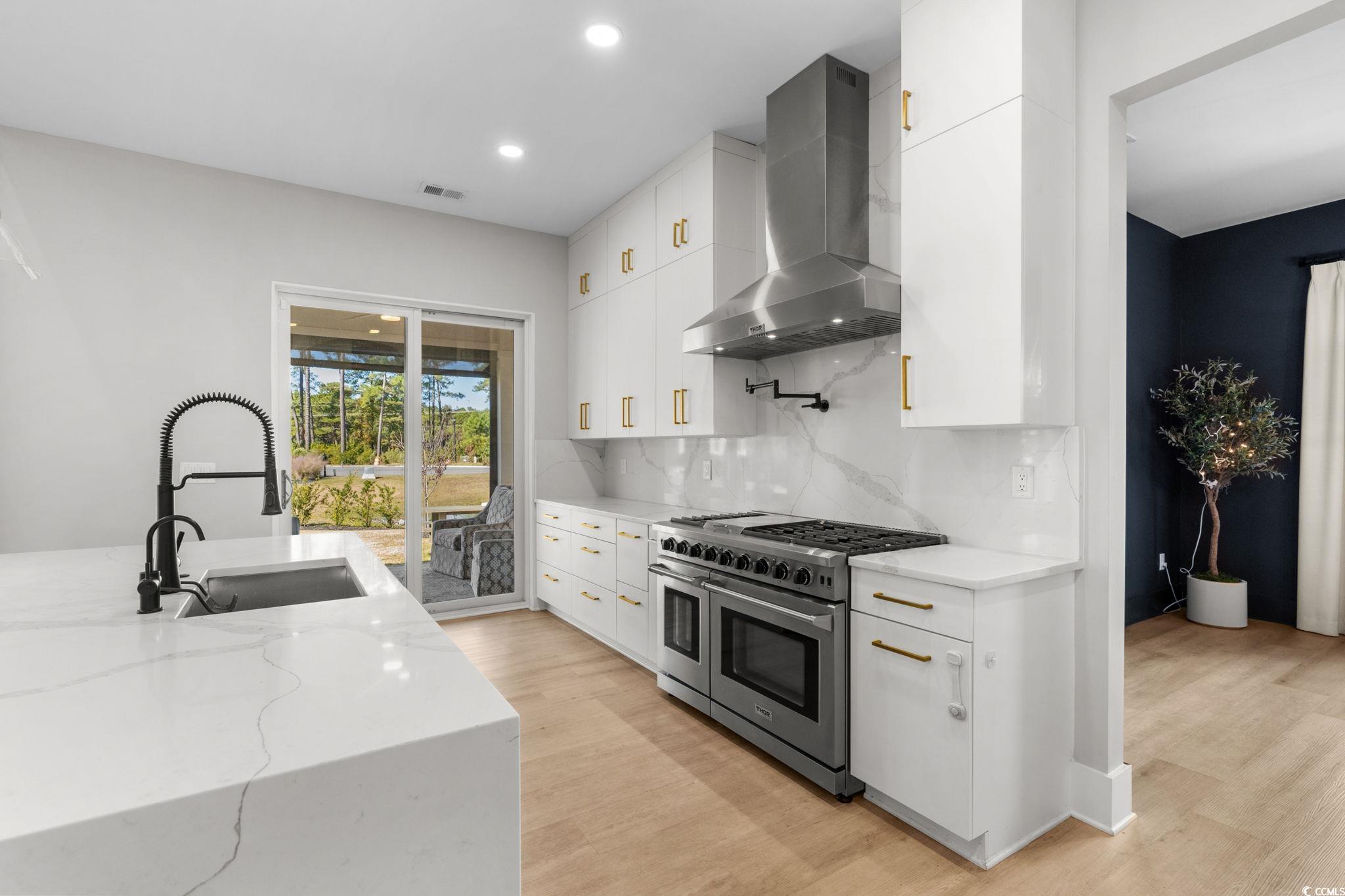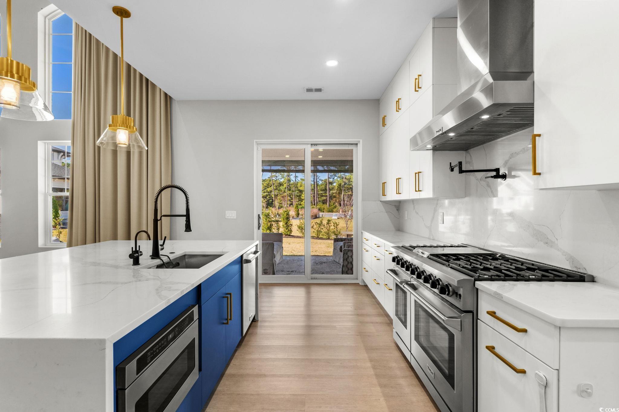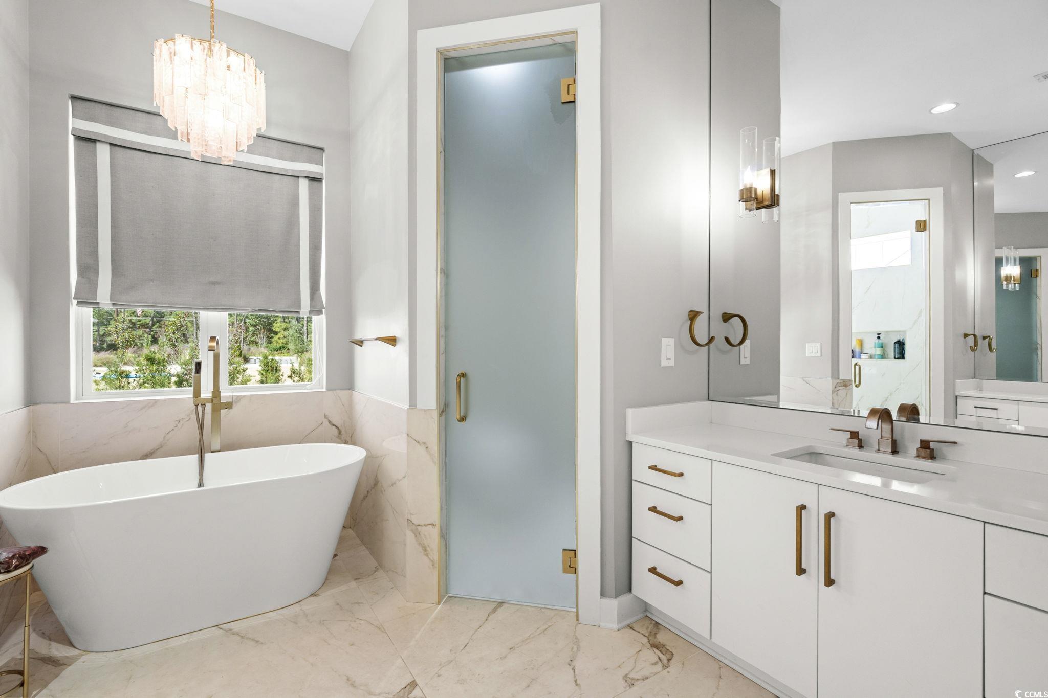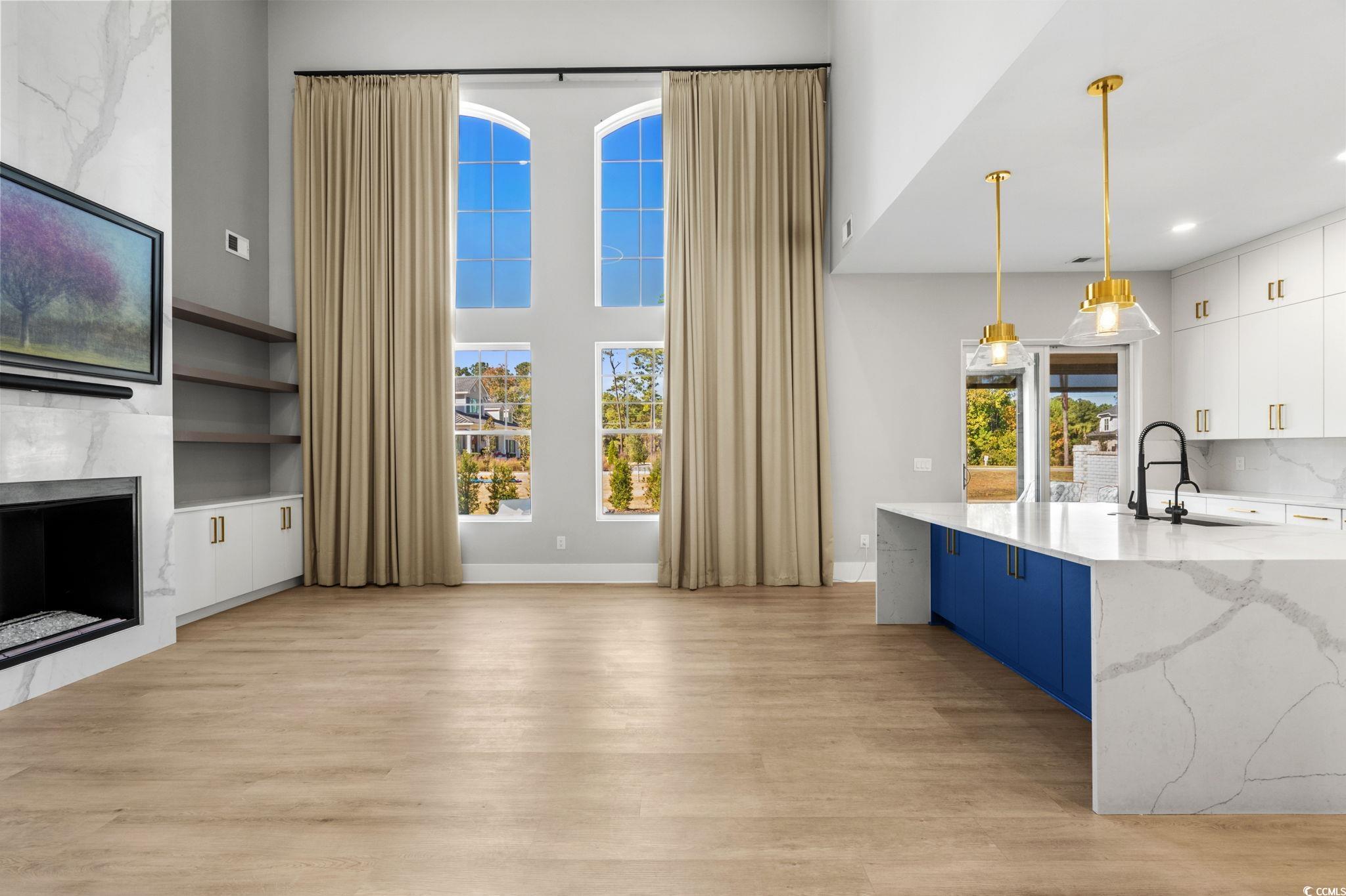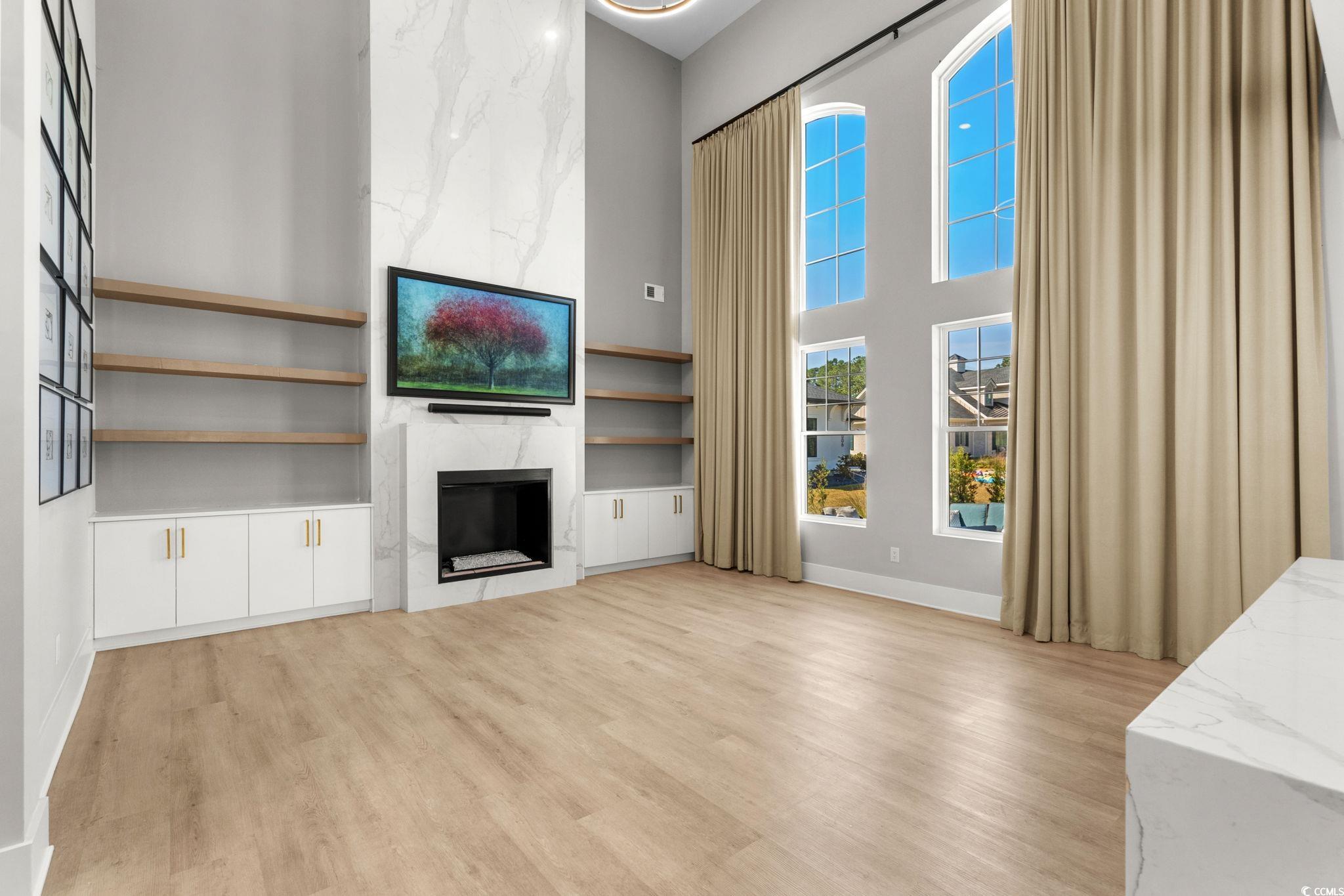 Situated in the prestigious and historic Pine Lakes Country Club, this custom-built residence blends timeless architecture with modern sophistication. Every detail reflects quality craftsmanship, from the soaring ceilings and expansive windows to the marble fireplace that anchors the grand living area. The designer kitchen is both striking and functional, featuring sleek white cabinetry, quartz countertops, and a bold navy island accented with gold hardware. Professional-grade stainless appliances, double ovens, a pot filler, and a walk-in pantry create the perfect balance between elegance and practicality. The primary suite on the main level offers a tranquil retreat with a spa-inspired bath, freestanding tub, spacious shower, and dual vanities. Upstairs, four additional bedrooms and three full baths provide comfort and flexibility. The fifth bedroom is exceptionally large, allowing for a private living area, home theater, fitness space, or multi-use room. The covered patio opens to a beautifully landscaped yard, ideal for relaxing or entertaining. Located minutes from the beach, fine dining, shopping, and entertainment, this home embodies the best of luxury living in one of Myrtle Beach’s most distinguished communities.