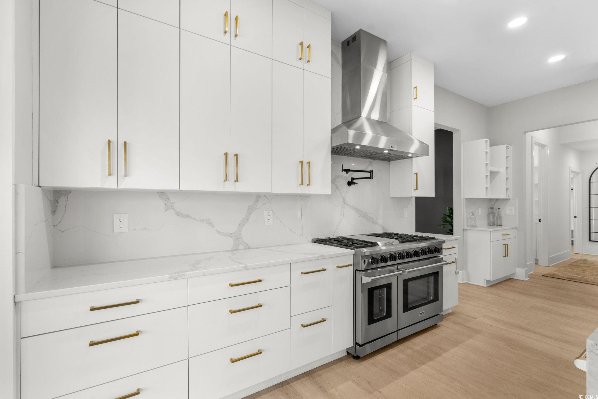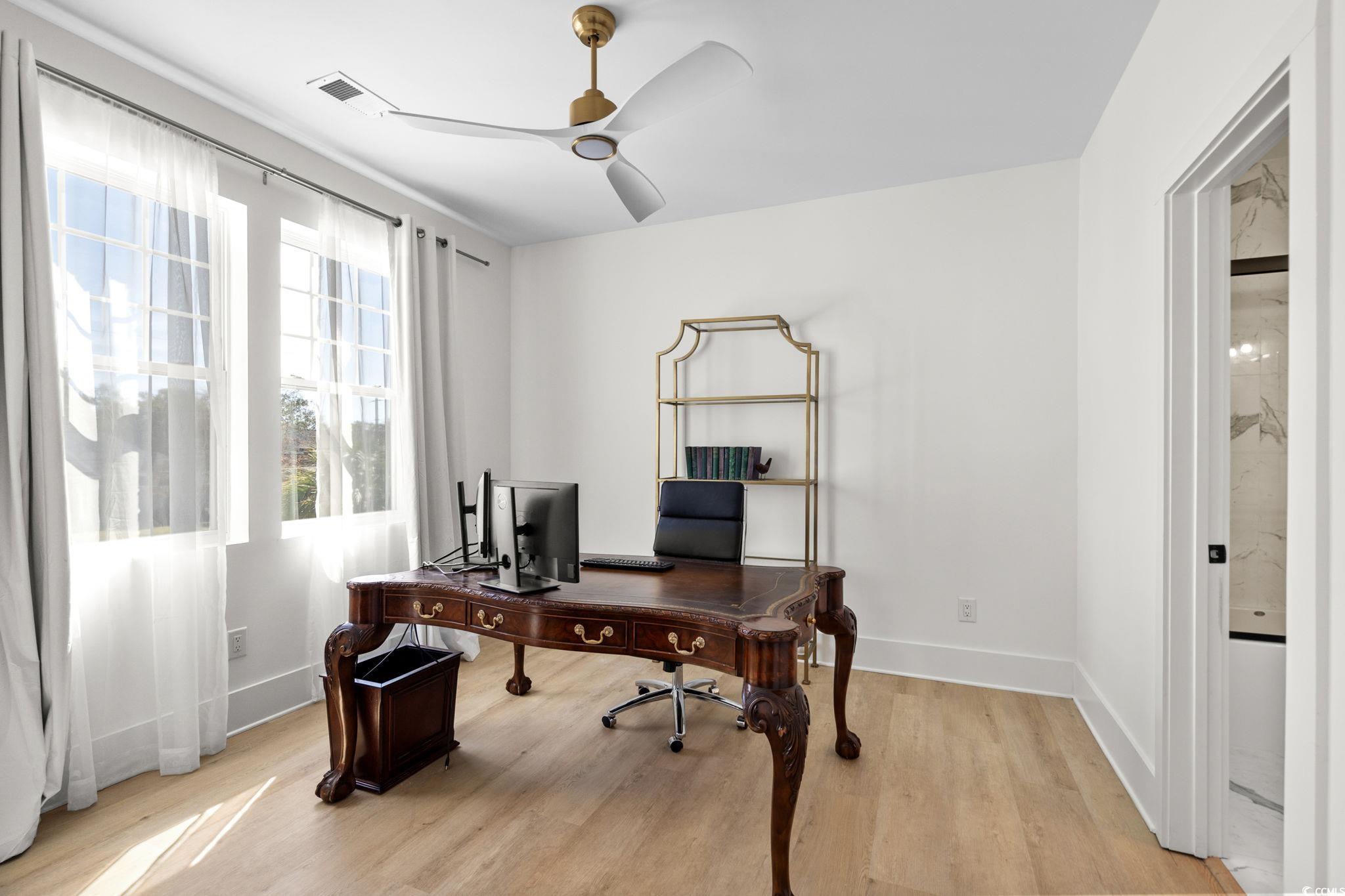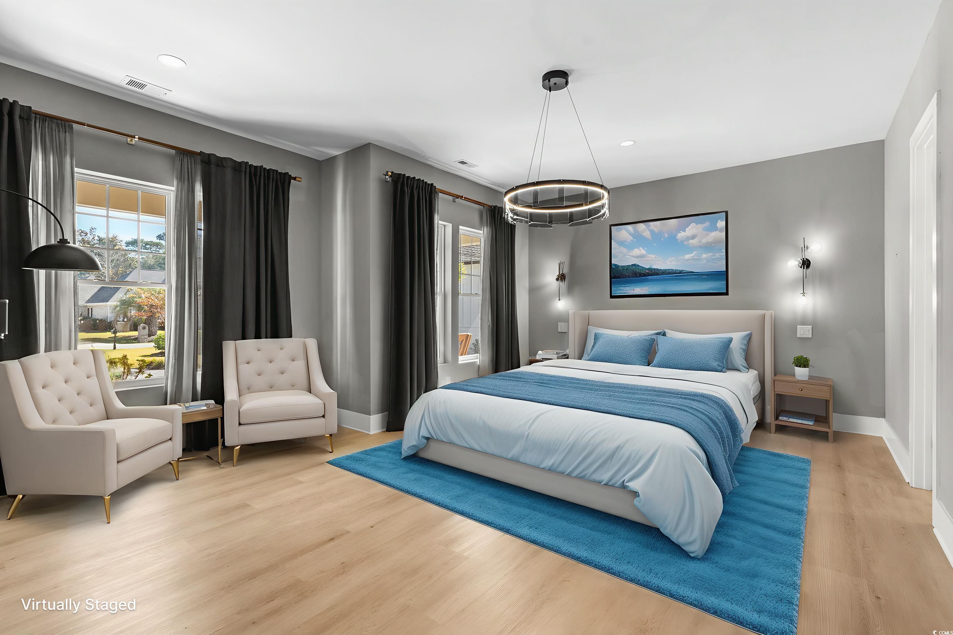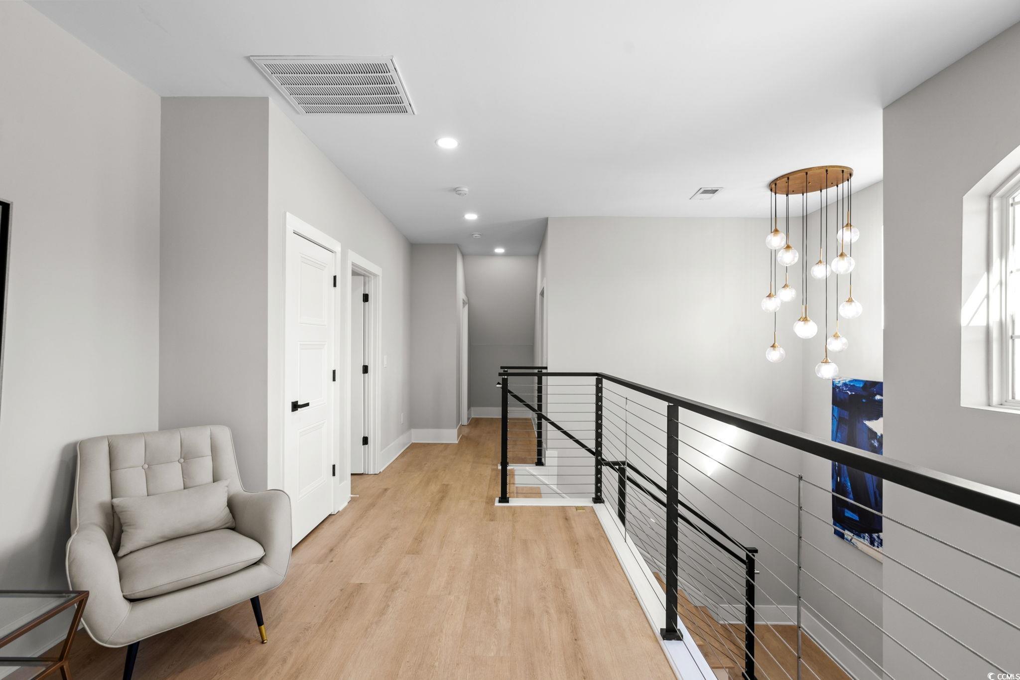 Situated in the prestigious and historic Pine Lakes Country Club, this custom-built residence blends timeless architecture with modern sophistication. Every detail reflects quality craftsmanship, from the soaring ceilings and expansive windows to the marble fireplace that anchors the grand living area. The designer kitchen is both striking and functional, featuring sleek white cabinetry, quartz countertops, and a bold navy island accented with gold hardware. Professional-grade stainless appliances, double ovens, a pot filler, and a walk-in pantry create the perfect balance between elegance and practicality. The primary suite on the main level offers a tranquil retreat with a spa-inspired bath, freestanding tub, spacious shower, and dual vanities. Upstairs, four additional bedrooms and three full baths provide comfort and flexibility. The fifth bedroom is exceptionally large, allowing for a private living area, home theater, fitness space, or multi-use room. The covered patio opens to a beautifully landscaped yard, ideal for relaxing or entertaining. Located minutes from the beach, fine dining, shopping, and entertainment, this home embodies the best of luxury living in one of Myrtle Beach’s most distinguished communities.