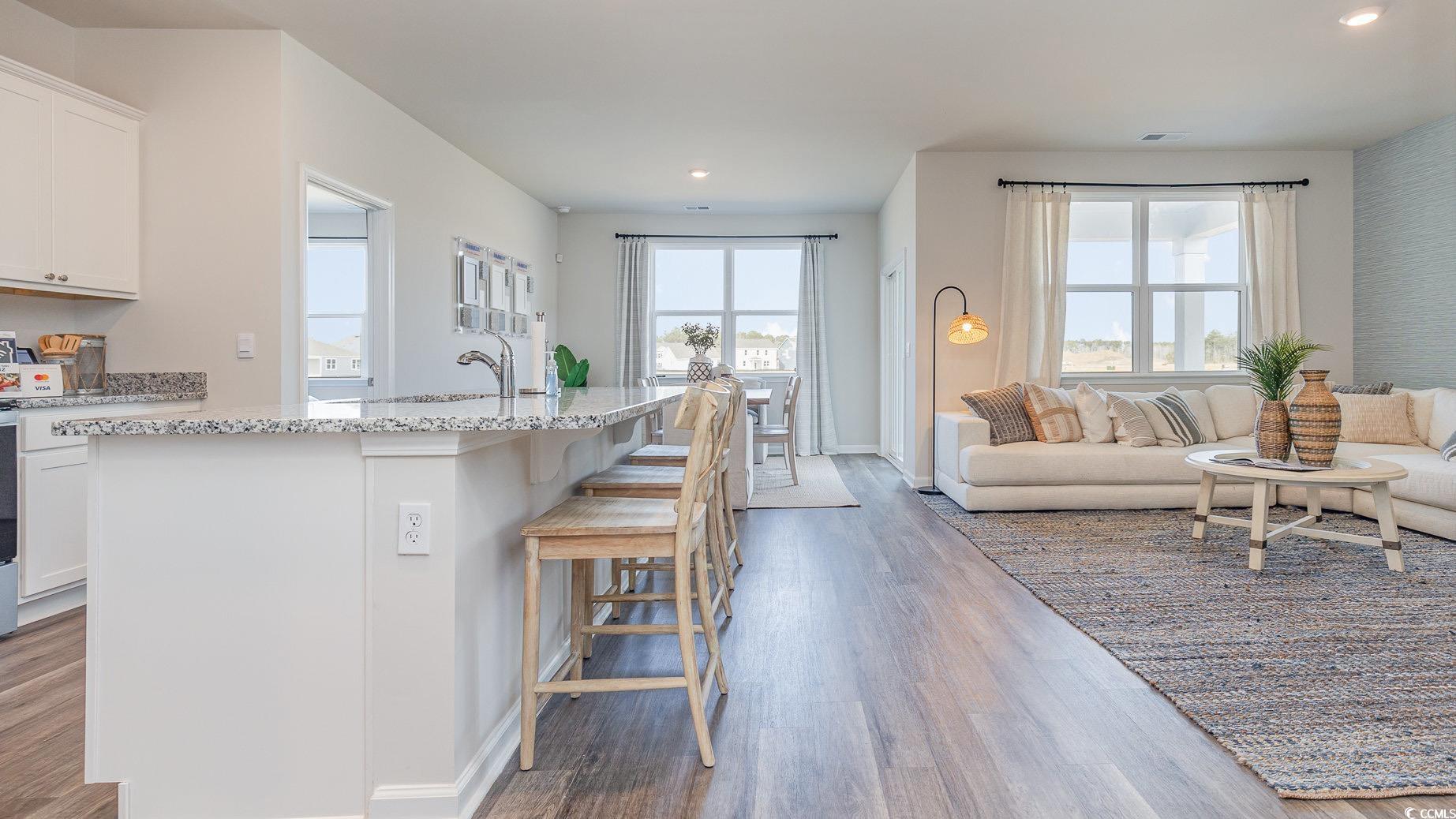 This thoughtfully designed one level home is one of our most popular floor plans! With an open concept living room, dining room and kitchen, this home is bright, spacious, and designed for entertaining guest or comfortably interacting with family. The kitchen features granite countertops, 36" cabinets, a spacious pantry, stainless steel appliances including a refrigerator, and island with breakfast bar! Your primary suite awaits off the back of the home with a spacious walk-in closet and master bath with double sinks, a linen closet and 5' shower. Two secondary bedrooms are at the front of the home providing separation from the primary suite. Enjoy the coastal air from the back porch as you wind down in the evening! 2 car garage with garage door opener. This is America's Smart Home! Each of our homes comes with an industry leading smart home technology package that will allow you to control the thermostat, front door light and lock, and video doorbell from your smartphone. *Photos are of a similar Aria home. Pictures, photographs, colors, features, and sizes are for illustration purposes only and will vary from the homes as built. Home and community information, including pricing, included features, terms, availability and amenities, are subject to change and prior sale at any time without notice or obligation. Square footage dimensions are approximate. Equal housing opportunity builder.