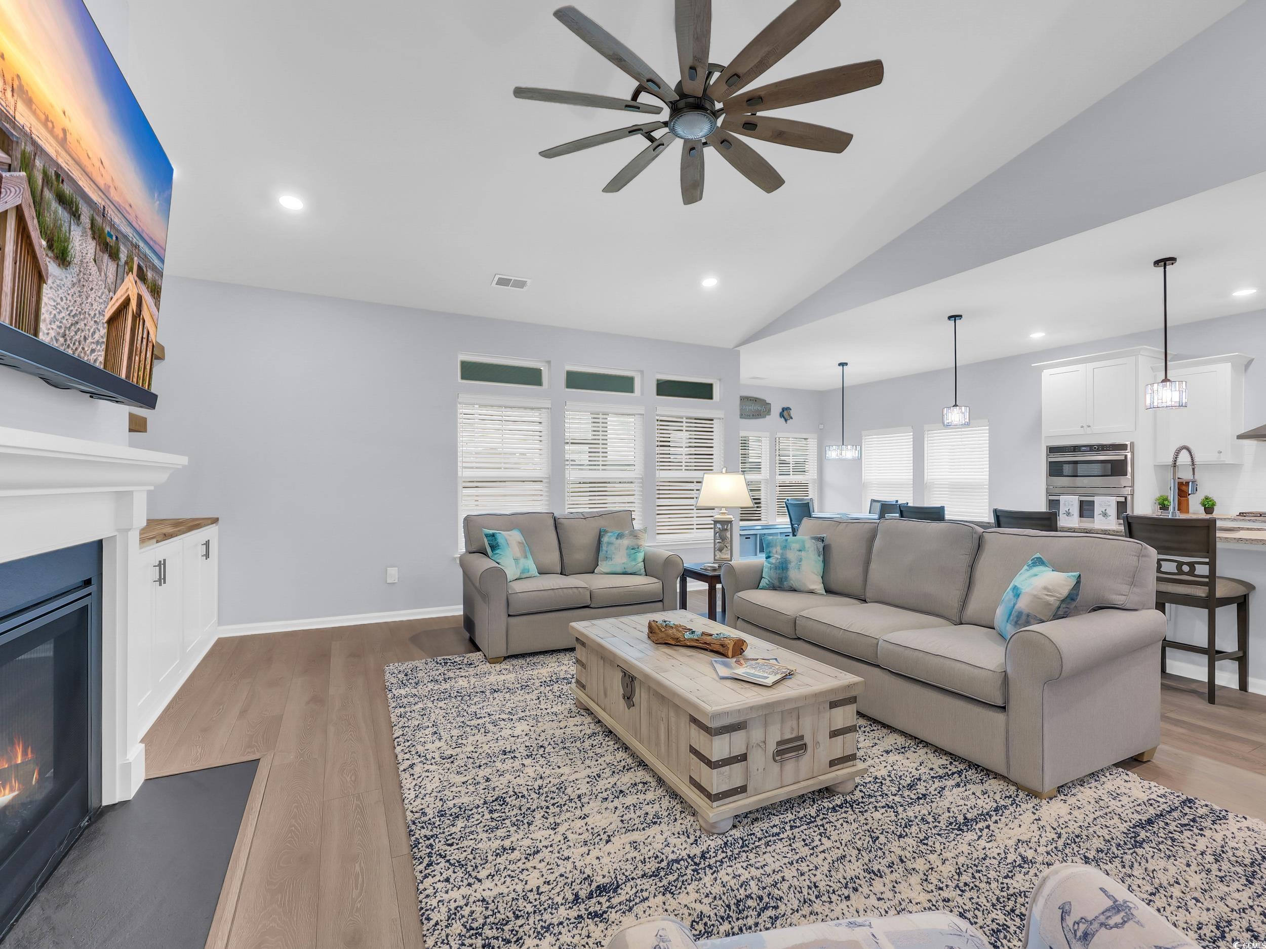 Welcome to this stunning Lexington Model by Lennar, where style meets comfort. The home features a gourmet kitchen with gas range, soft-close cabinetry, and custom lighting, opening to a spacious great room with a fireplace, custom-built entertainment center, and an oversized ceiling fan that keeps the entire space cool and inviting. The primary suite offers a spa-like bath, walk-in closet, and private commode, while the entire home has been freshly painted and outfitted with ceiling fans in every room. A Ring security system is in place for peace of mind, and the Hunter irrigation system allows remote access, perfect for out-of-town owners. Enjoy serene views of the golf course and pond from the covered, fully screened patio. Best of all, you're just a short golf cart ride to the beach with dozens of public access points nearby, making this home the perfect blend of modern living and coastal lifestyle.