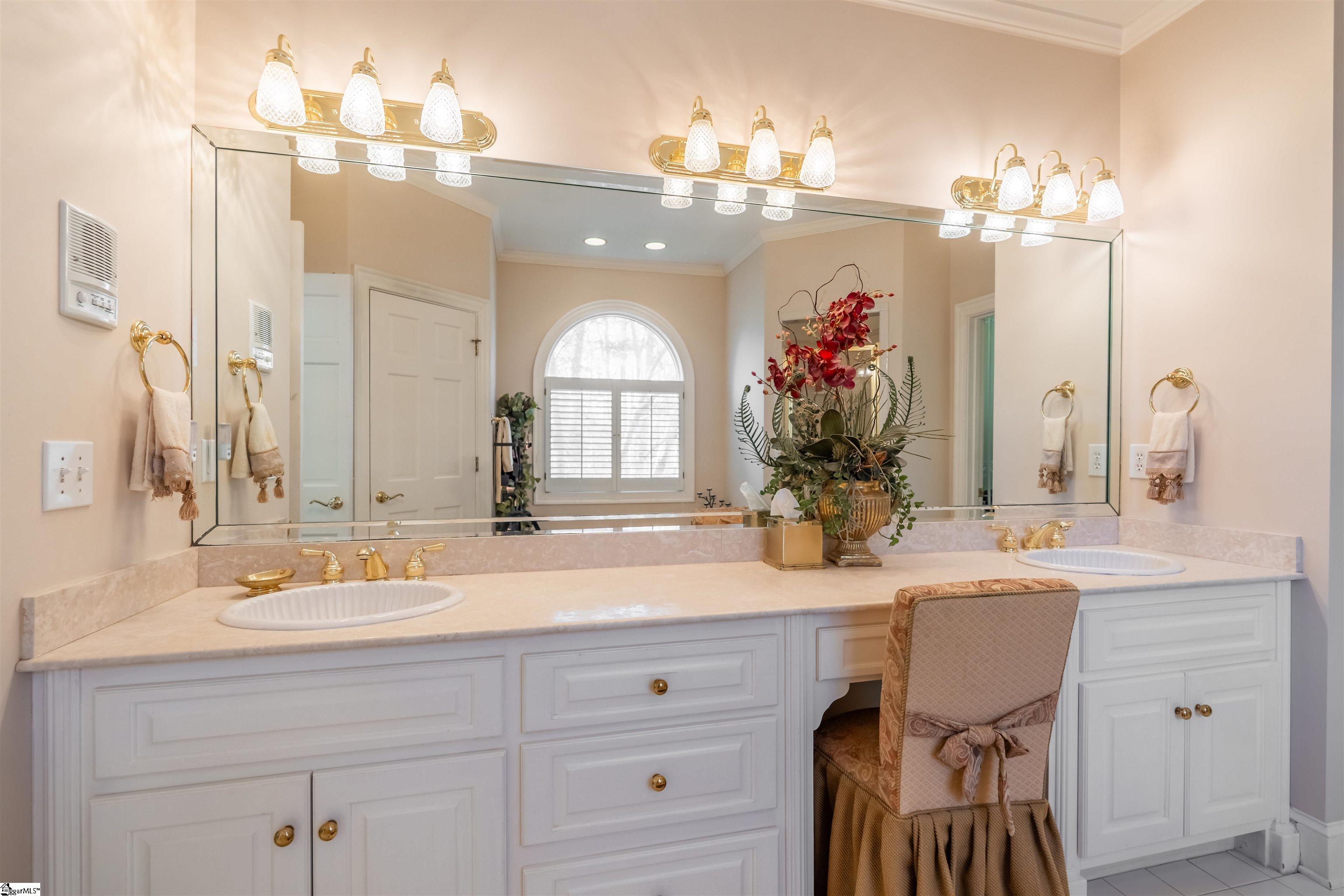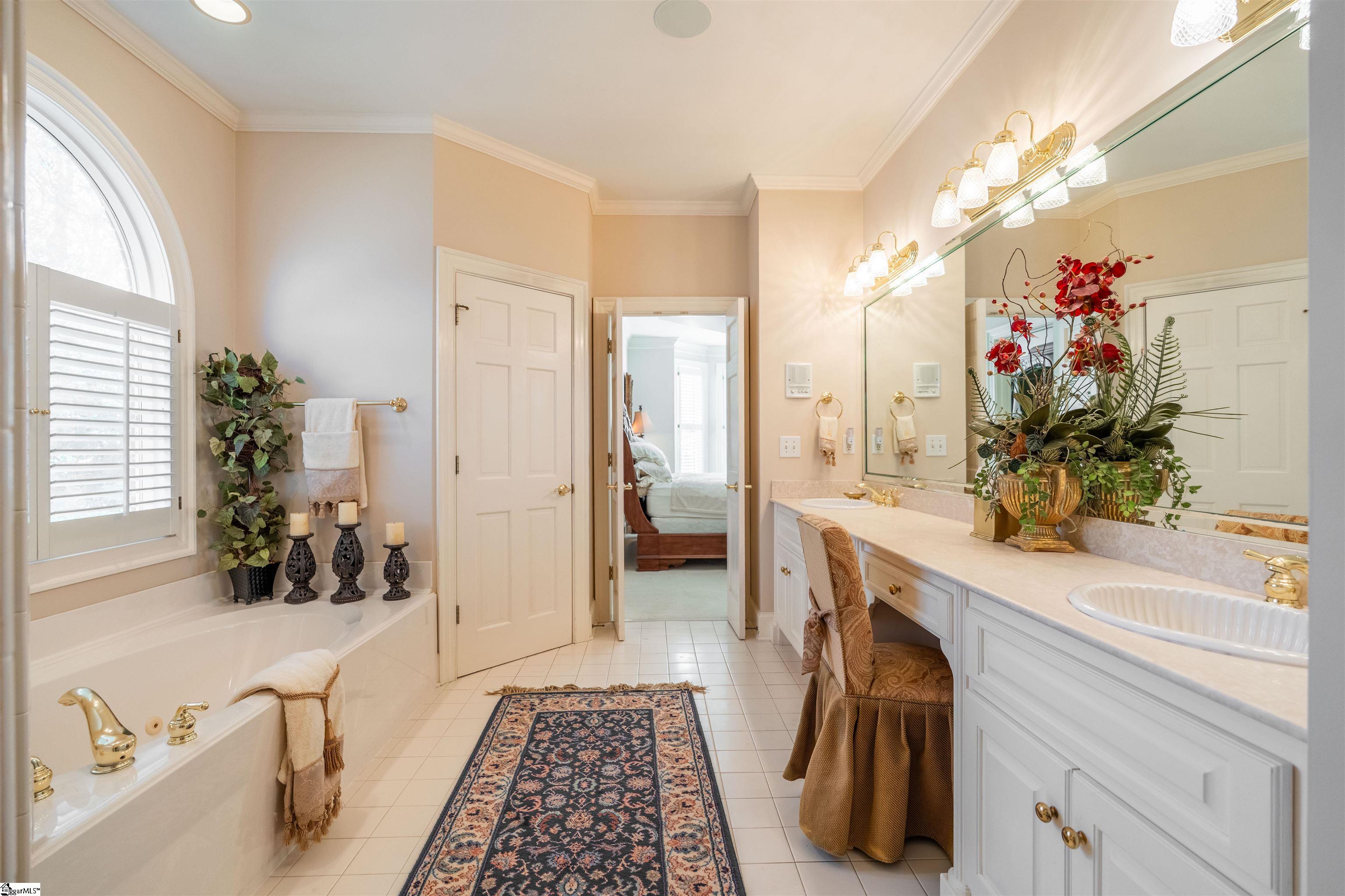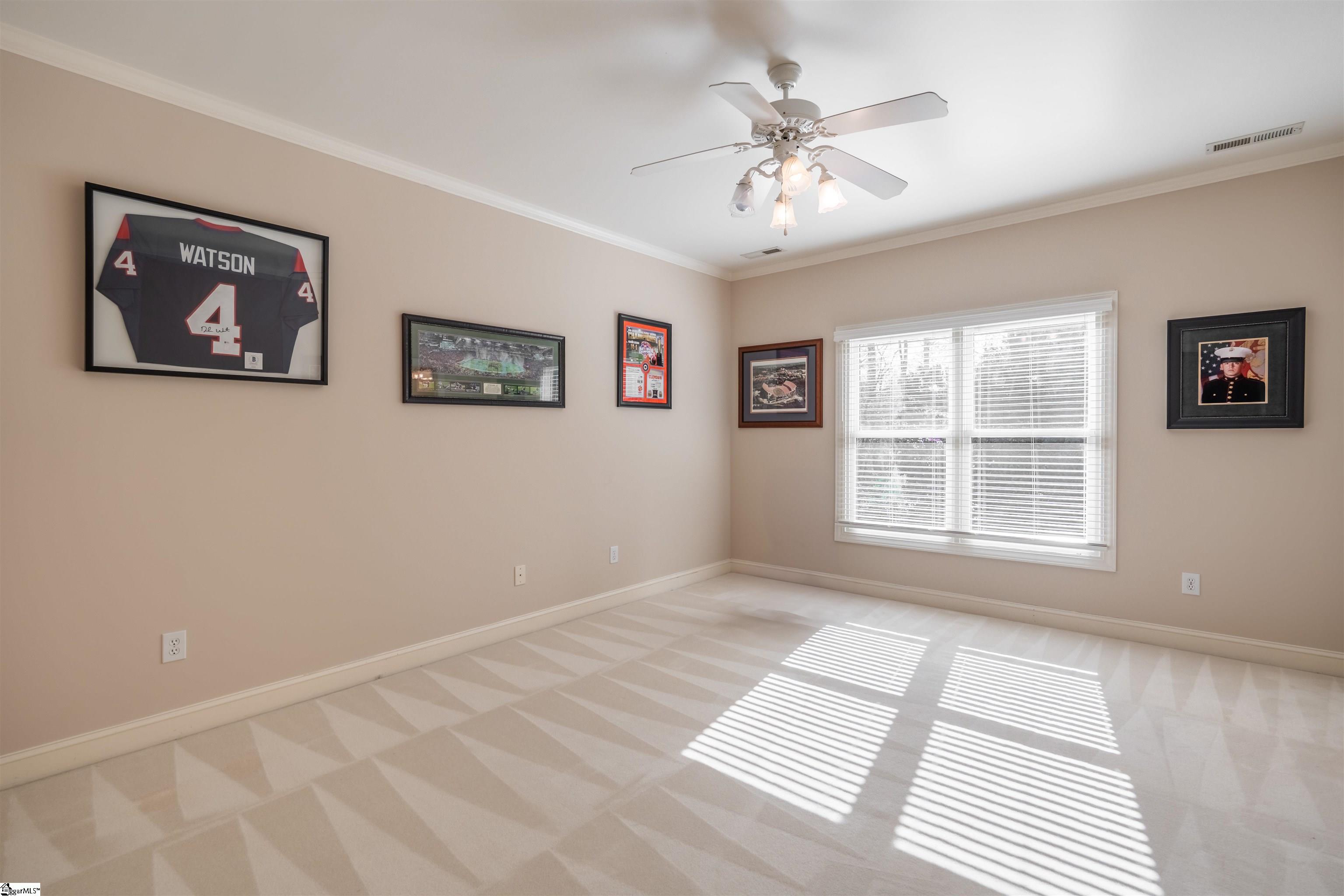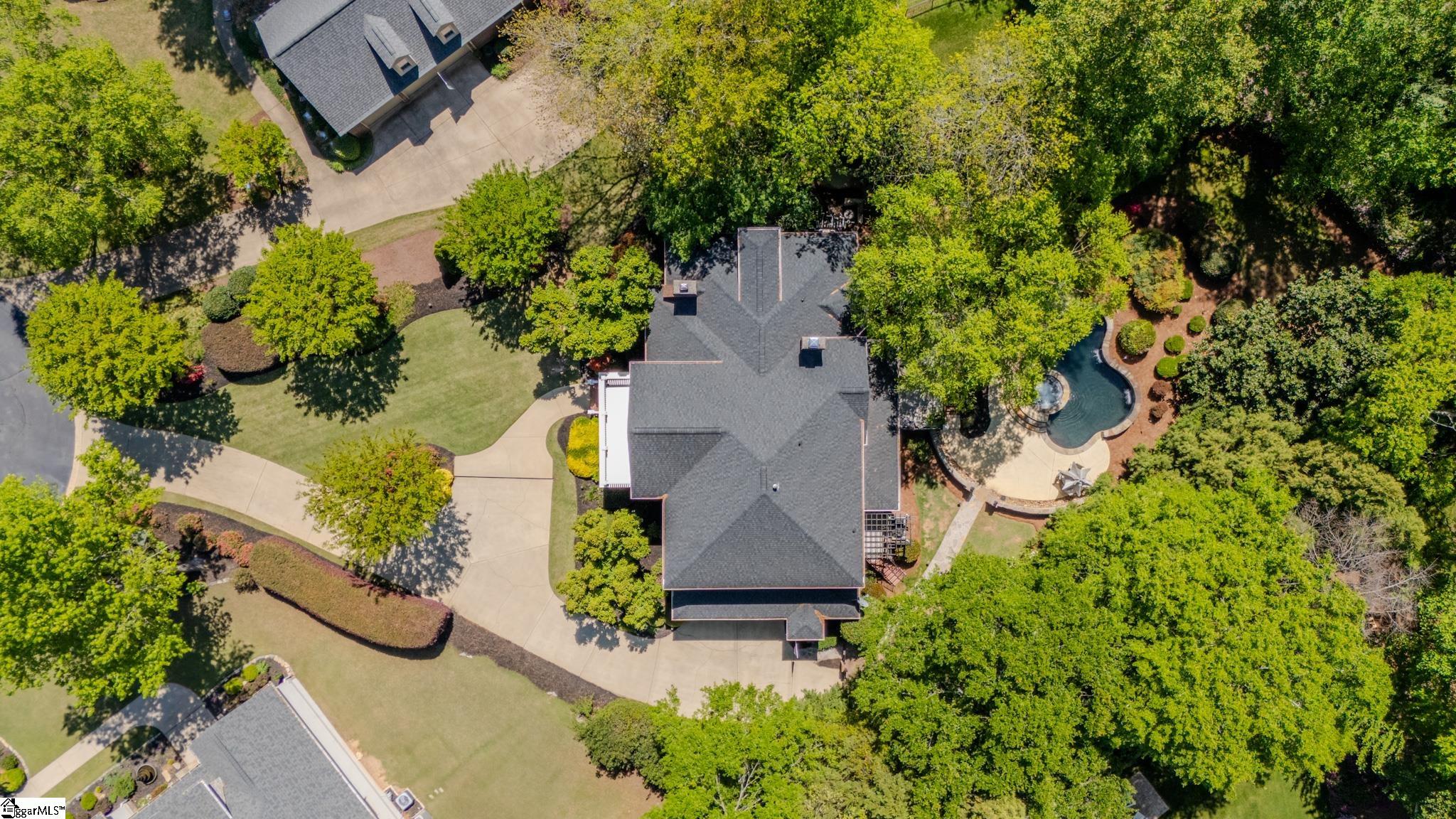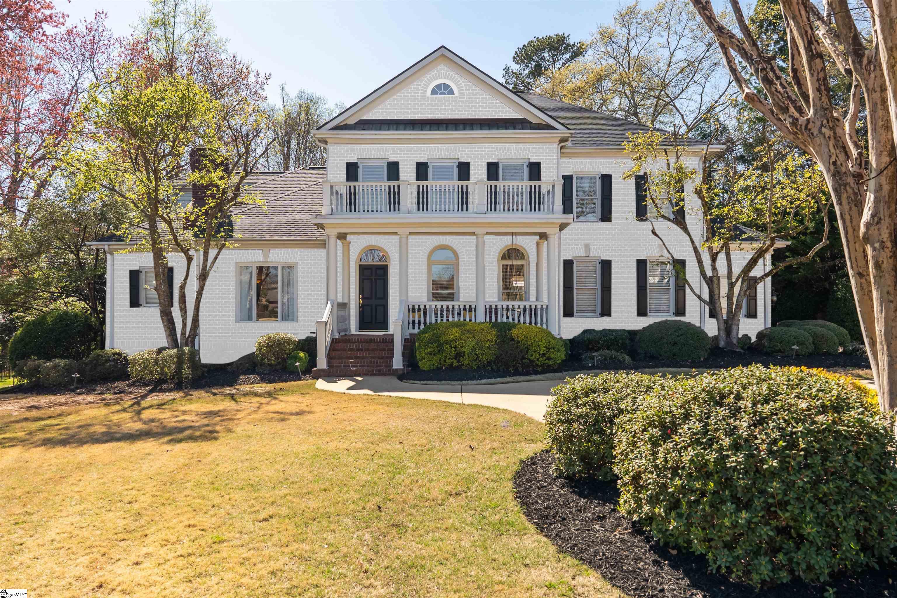 This beautiful Kingsbridge home is tucked away at the end of a small cul-de-sac providing a wonderful private oasis while still having the convenience of a neighborhood and being close to Five Forks. This 4 bedroom, 4 bath brick home is loaded with space and options to make this home live perfect for any stage of life. As you enter the graciously sized foyer you are flanked by the dining room to the right and the living room to the left. The living room has a lovely fireplace and would also make a great music room. The primary en suite bedroom is tucked away in the back left of the main floor allowing for main level living. A spacious two story den is the center of activity on the main level. The kitchen - with a great island, the breakfast area, a powder room, a true office, the laundry room and a wet bar round out the interior of the main level. The second level of the home offers 3 generously sized bedrooms; one bedroom has it's own en suite bath, the other bedrooms share an oversized jack and jill bath. There is also an additional room on the second floor that is currently being used as a second den/office, but is a great flex space that would also work as a game room, home gym, home school room. The exterior of this home is incredible with a built-in pool, hot tub, trees for privacy, extra parking pad, and did we mention privacy? This back yard could be a wonderful place to relax and enjoy time with your family and friends.