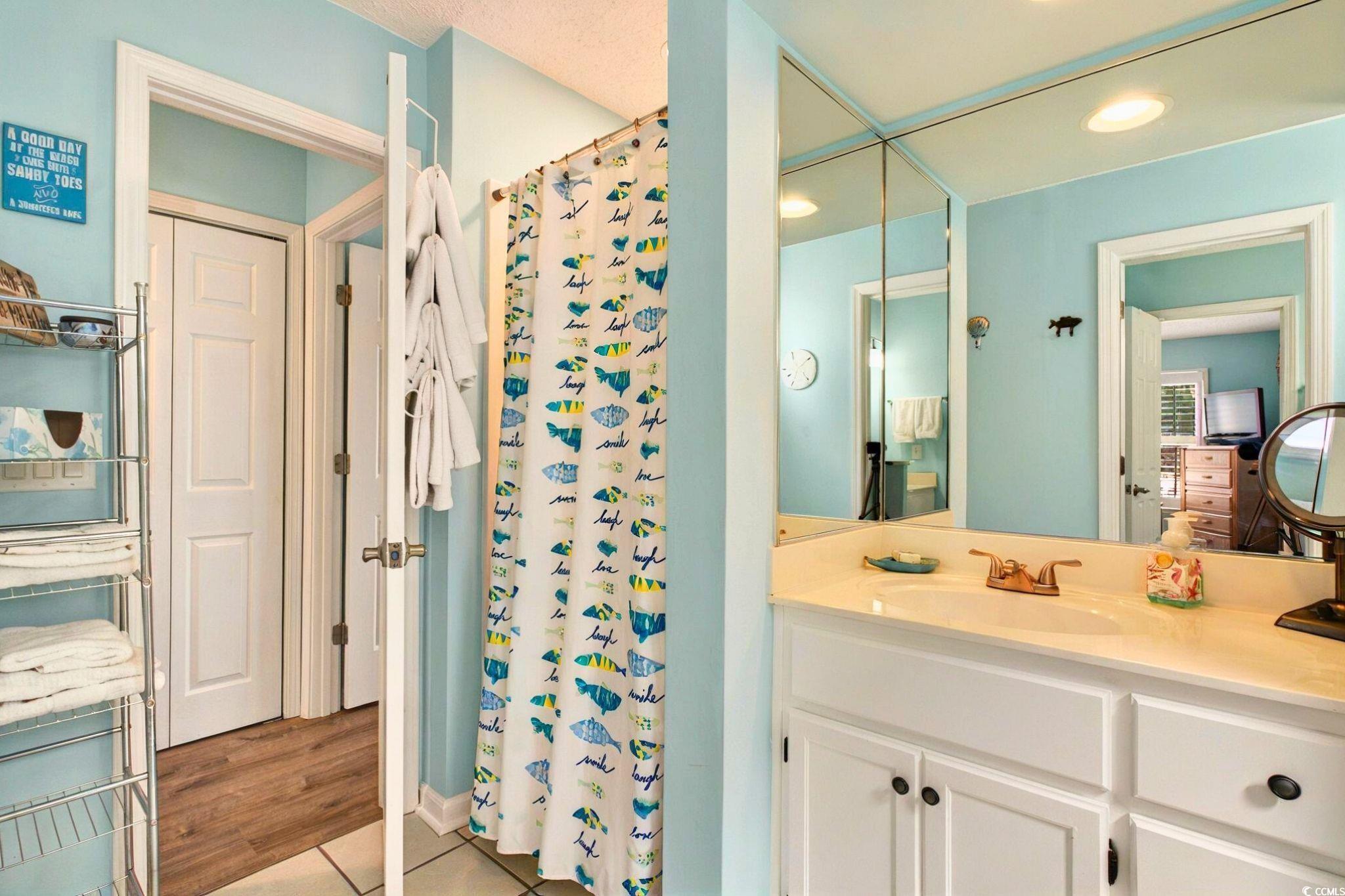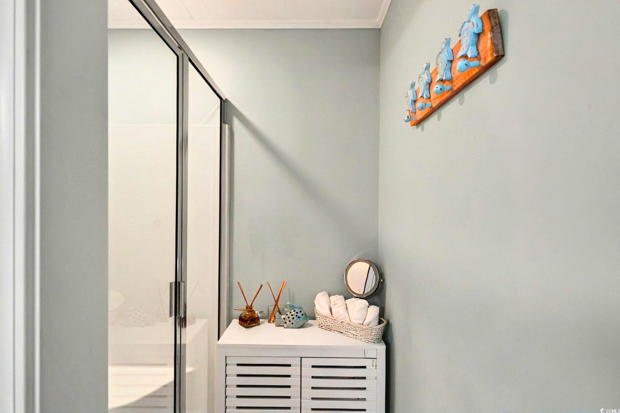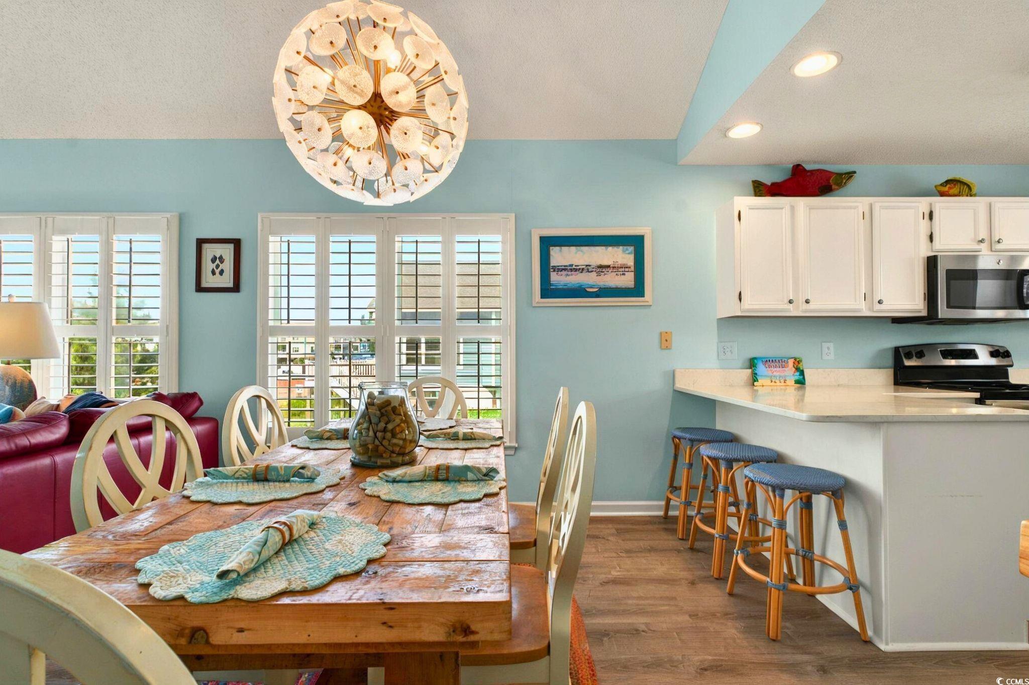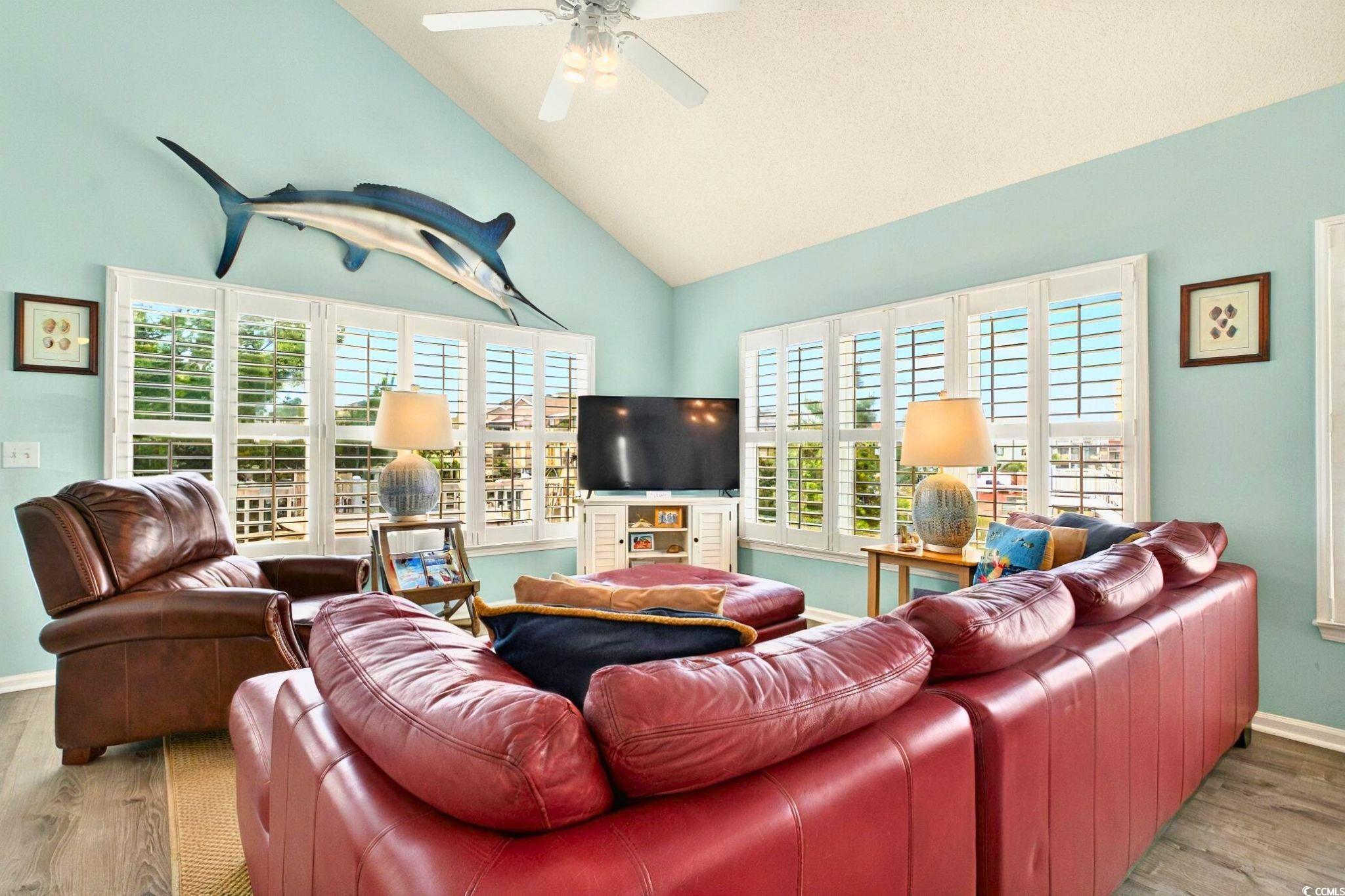 This beautifully appointed 4-bedroom, 3-bath elevated coastal home offers the perfect blend of comfort and convenience in Ocean Isle Beach's desirable Island Park community. Ideally positioned on the west end, the property sits just steps from community beach access across the street while bordering protected green space that ensures both privacy and a sense of tranquility. The main level features an inviting open floor plan with vaulted ceilings that flood the space with natural light. Durable LVP flooring flows throughout the living areas, complemented by ceramic tile in the baths. The well-appointed kitchen boasts stainless steel appliances, elegant quartz countertops, and a convenient breakfast bar that opens to the dining area - perfect for entertaining. The main level includes a primary suite with an attached bath plus a guest bedroom served by a full hall bath. Upstairs, two additional bedrooms share a practical Jack-and-Jill bathroom. Plantation shutters throughout add a touch of coastal sophistication to every room. Outdoor living shines with an expansive deck featuring a retractable awning, ample space for dining and lounging, and delightful peek-a-boo ocean views. The ground level offers a covered gathering area, secure storage for beach gear, and a convenient hot/cold outdoor shower - ideal for rinsing off after sun-filled beach days. Residents enjoy access to Island Park's exceptional amenities including two community pools and two day docks on Jinks Creek perfect for water activities. The home is being sold mostly furnished (see exclusion list) and is ready for immediate enjoyment as a personal retreat or income-producing rental. Recent updates include fresh exterior paint (2023) and roof replacement (2018). With HOA-covered lawn maintenance adding to the carefree lifestyle, plus walking-distance access to a popular oceanfront restaurant and tiki bar, this property delivers the ultimate low-maintenance beach living experience. Don't miss this rare opportunity to own a turnkey coastal home in one of Ocean Isle Beach's most sought-after locations.