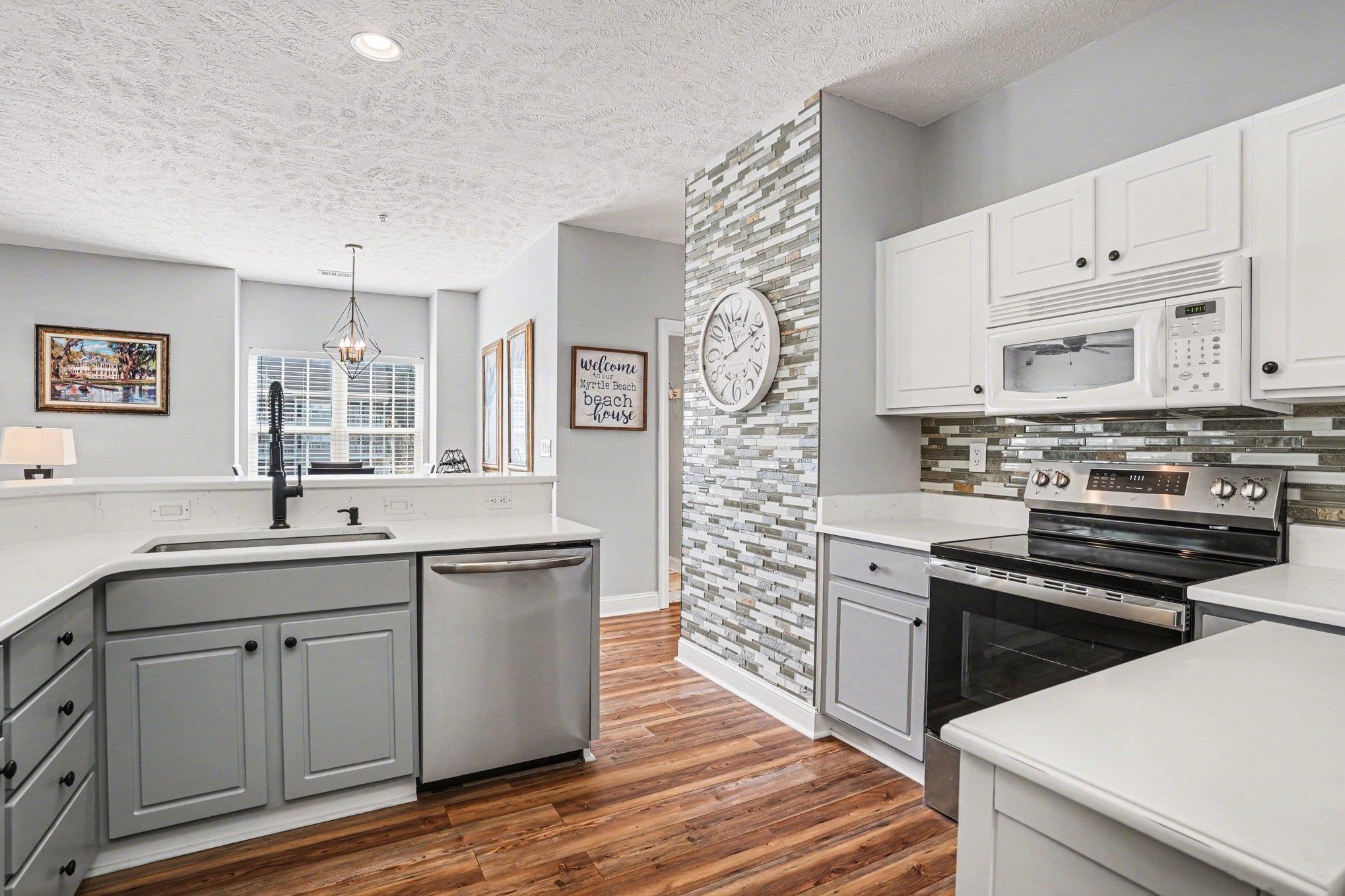 Myrtle Beach Condo Living at its finest! Welcome to Windsor Green. A lovely condo community nestled against a beautiful golf course in the highly sought after Carolina Forest area. You'll feel like you've walked into new construction when you enter this well-kept, updated and recently painted, second floor condo. Sitting quietly on a cul-de-sac at the back of the development, with a pond view from the end-unit windows and golf course view from the screened balcony you are surrounded with nature and calm vibes. This home features beautiful LVP running throughout with tile in the wet areas. Natural light floods in keeping the space open and airy. A perfect flow keeps guest bedrooms at the front of the condo, living space in the center and the primary suite on the back of the unit. The kitchen boasts a beautiful tiled wall, new quartz counters, newer stainless steel appliances, ample cabinets and counter space, and a new single basin sink and faucet. Off the kitchen is a laundry room and pantry area. The dining area is perfectly positioned for functionality and a great pond view. Two guest bedrooms, each spacious, share a bathroom and have generous closet space, as well as ceiling fans. Primary bedroom has a linen closet, large walk-in closet and an ensuite with walk-in shower with new rainfall shower door. All major kitchen appliances and the washer and dryer convey. Unit sold partially furnished (or owner will remove if preferred). Ask to see the conveyance list. Roof 2024. HVAC 2018. HOA includes insurance, water, sewer, trash, pest control, and outdoor pool. Centrally located to golf, shopping, dining and just a short drive to the beach - you can't go wrong with this location. Carolina Forest is home to some favorite local restaurants like Sneaky Beagle, Grumpy Monk, Handley's Pub, River Oaks Pizzeria, SOHO, Oak and Prime and so many more. Tanger Outlets is close by, as well as, highly rated schools and medical services. Owner allowed pets with restrictions. Short term rentals (3mo minimum) allowed. You must see this one to appreciate it!! Book a tour today!