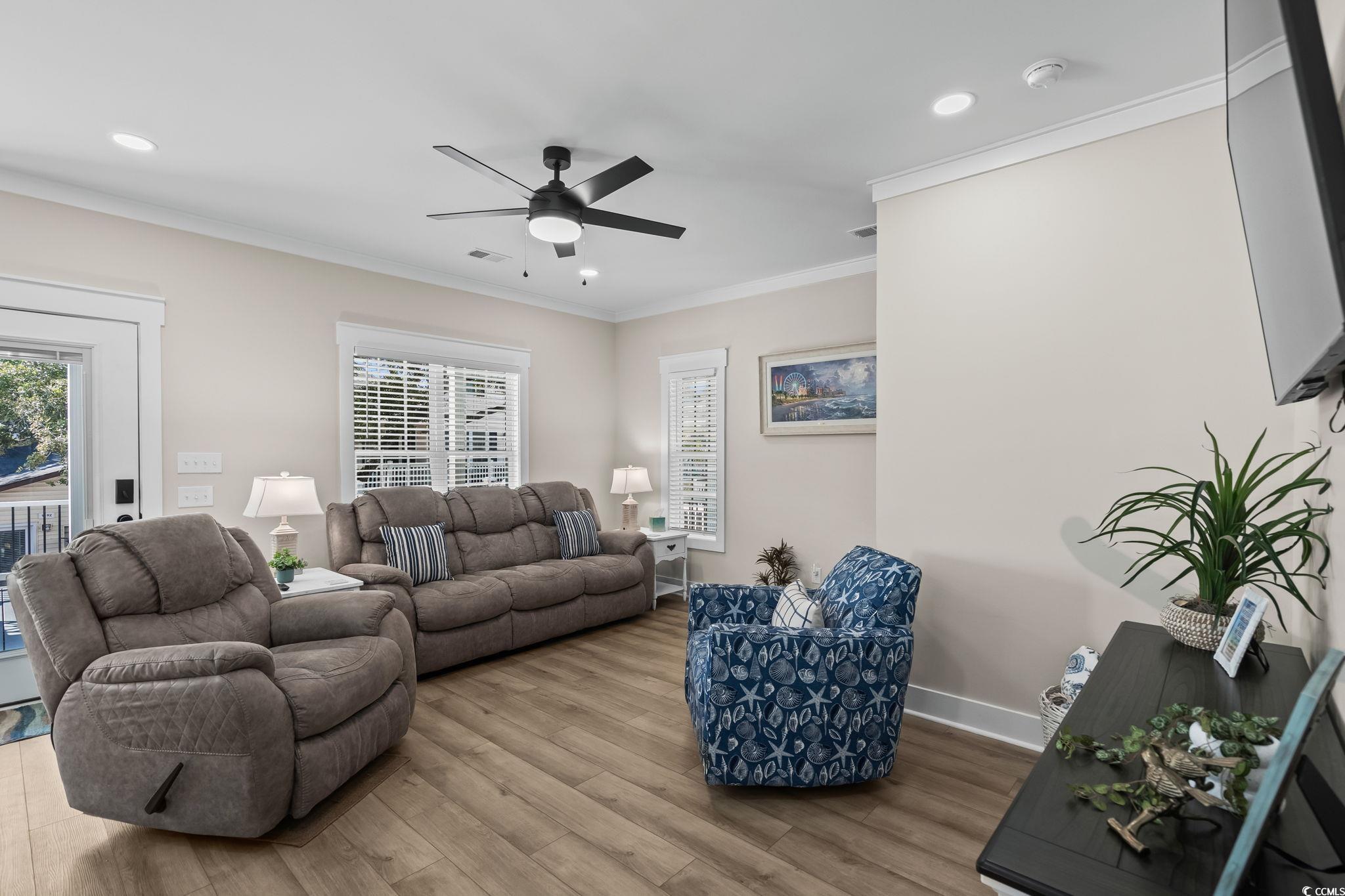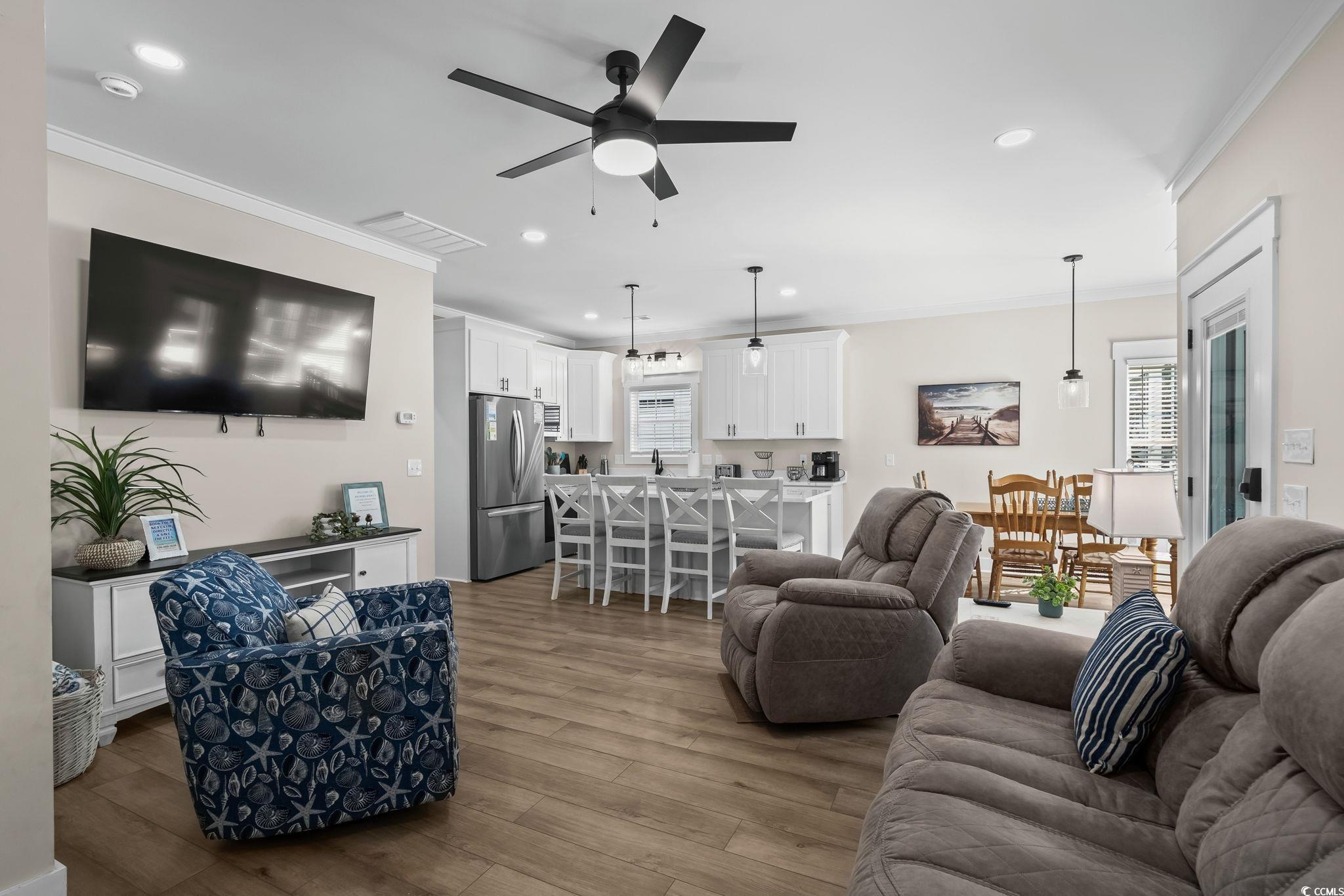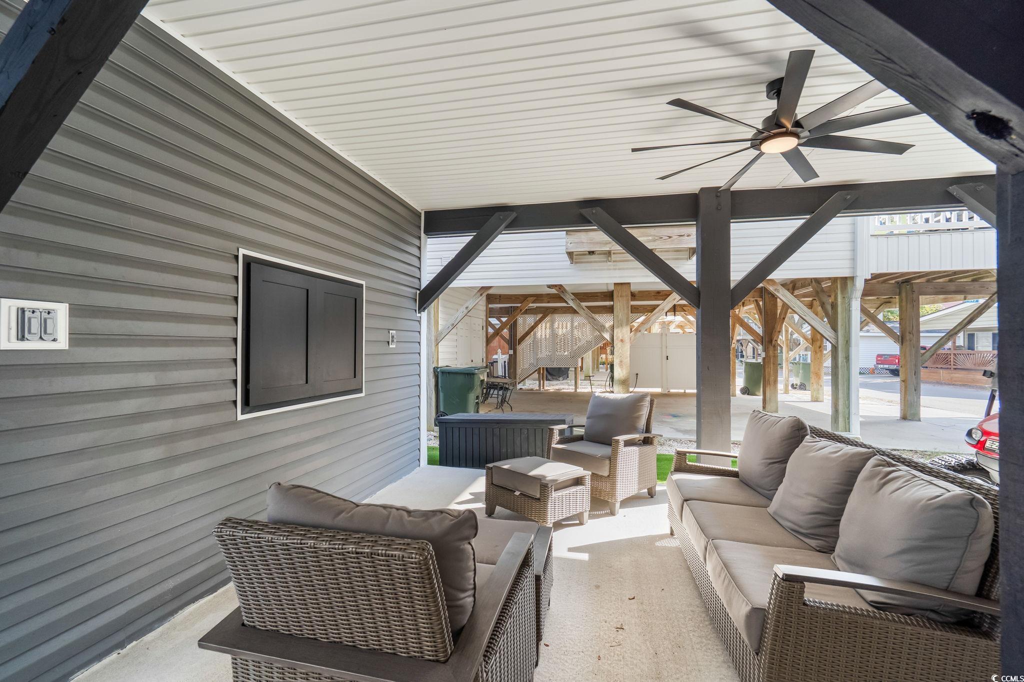 Welcome to 1174, this custom built 5-bedroom 3.5 bath was completed in 2025 and is being sold fully furnished and just 19 houses from the BEACH! This oversized lot has artificial grass on the Eastside of the home and composite steps on the Westside of the home. Under the house you have 2 parking bays with parking for 4+ cars and space to have an outdoor entertainment area with TV cabinet. Extra storage under the steps for beach chairs and outdoor shower with hot and cold water for rinsing off after a beautiful day at the beach. Garage with automatic garage door opener makes it easy for storing your golf cart and personal items when you are away from your beach house (water heater is in the garage). Making your way up the composite COVERED steps brings you to a large covered deck with a partial view of the ocean. Enjoy morning sun on the Southeast facing deck and afternoon shade. Entering inside you have the large living room on the Southwest corner of the home with beautiful crown molding and LVP flooring. Brand new reclining sectional and oversize chair allows plenty of room for family movie nights or watching your favorite shows. Dining area with seating for 6 and kitchen are on the Eastside of the home, allowing plenty of natural light into the custom kitchen with soft close cabinets, crown molding, quartz counters, gorgeous quartz island with seating for 4, and top of the line stainless steel appliances. Half bath is on the left as you make your way into the primary bedroom with king size bed and shiplap accent wall. Primary bathroom features a tiled walk-in shower, full-size stackable washer/dryer, and vanity. On the 2nd floor you have 2 additional full bathrooms with tub/shower combination, and solid surface countertops. Bedroom #2 is located on the Southeast side of the home with private deck access. Bedroom #3 is on the Southwest side of the home with queen size bed, private entrance to upstairs deck, and coastal furniture. Bedrooms #4 & #5 are on the Northeast and Northwest side of the home one having a queen size bed and one having a 2 twin beds and coastal furniture. Set your appointment today to see the beautiful home! The home is a must see! New construction. Home has entire house water filtration system