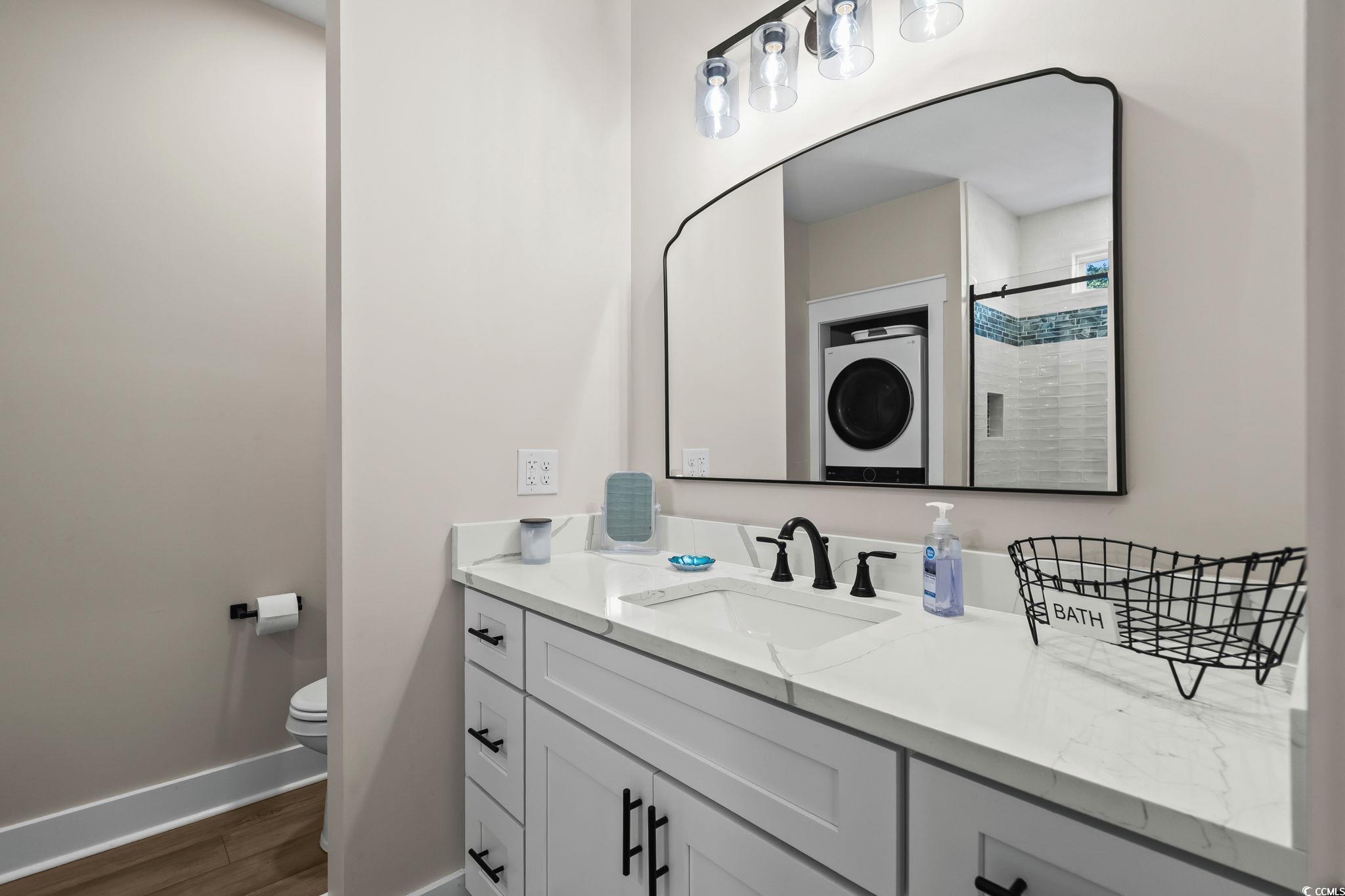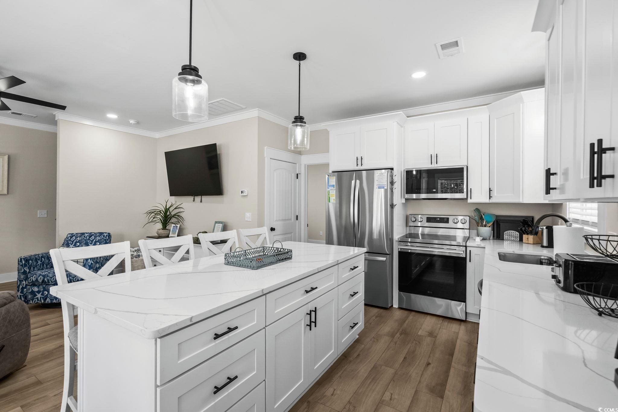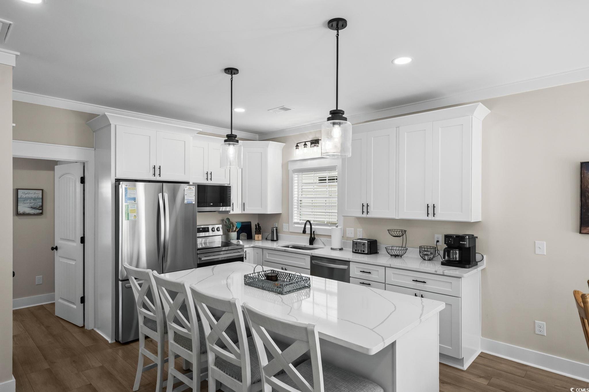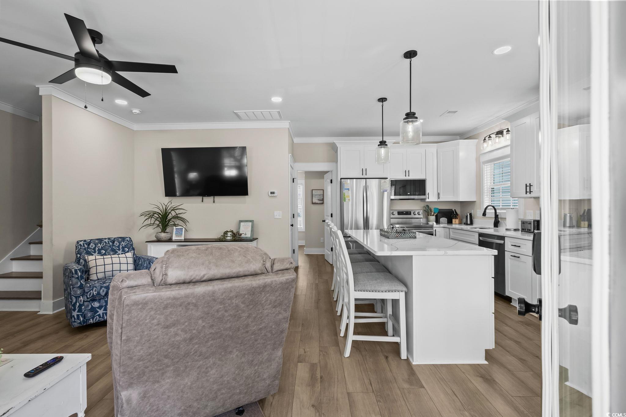 Welcome to 1174, this custom built 5-bedroom 3.5 bath was completed in 2025 and is being sold fully furnished and just 19 houses from the BEACH! This oversized lot has artificial grass on the Eastside of the home and composite steps on the Westside of the home. Under the house you have 2 parking bays with parking for 4+ cars and space to have an outdoor entertainment area with TV cabinet. Extra storage under the steps for beach chairs and outdoor shower with hot and cold water for rinsing off after a beautiful day at the beach. Garage with automatic garage door opener makes it easy for storing your golf cart and personal items when you are away from your beach house (water heater is in the garage). Making your way up the composite COVERED steps brings you to a large covered deck with a partial view of the ocean. Enjoy morning sun on the Southeast facing deck and afternoon shade. Entering inside you have the large living room on the Southwest corner of the home with beautiful crown molding and LVP flooring. Brand new reclining sectional and oversize chair allows plenty of room for family movie nights or watching your favorite shows. Dining area with seating for 6 and kitchen are on the Eastside of the home, allowing plenty of natural light into the custom kitchen with soft close cabinets, crown molding, quartz counters, gorgeous quartz island with seating for 4, and top of the line stainless steel appliances. Half bath is on the left as you make your way into the primary bedroom with king size bed and shiplap accent wall. Primary bathroom features a tiled walk-in shower, full-size stackable washer/dryer, and vanity. On the 2nd floor you have 2 additional full bathrooms with tub/shower combination, and solid surface countertops. Bedroom #2 is located on the Southeast side of the home with private deck access. Bedroom #3 is on the Southwest side of the home with queen size bed, private entrance to upstairs deck, and coastal furniture. Bedrooms #4 & #5 are on the Northeast and Northwest side of the home one having a queen size bed and one having a 2 twin beds and coastal furniture. Set your appointment today to see the beautiful home! The home is a must see! New construction. Home has entire house water filtration system