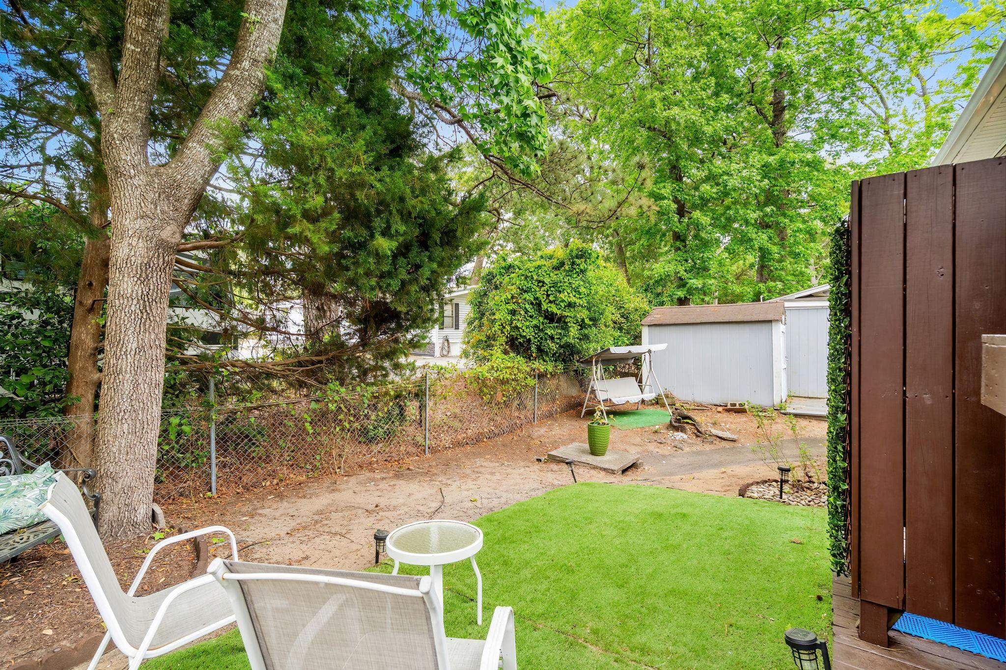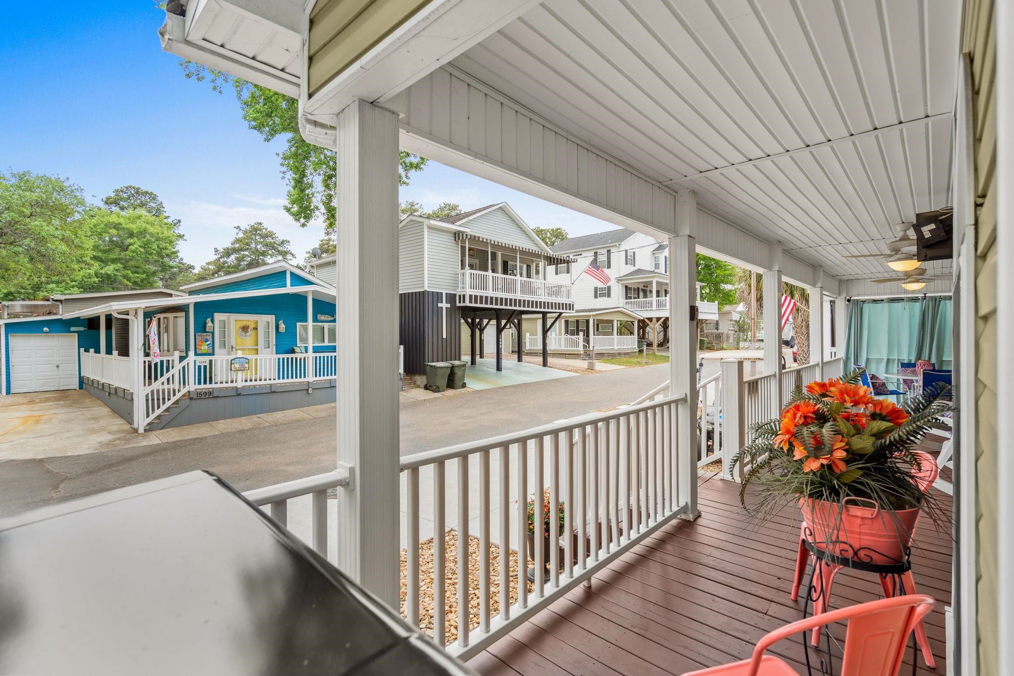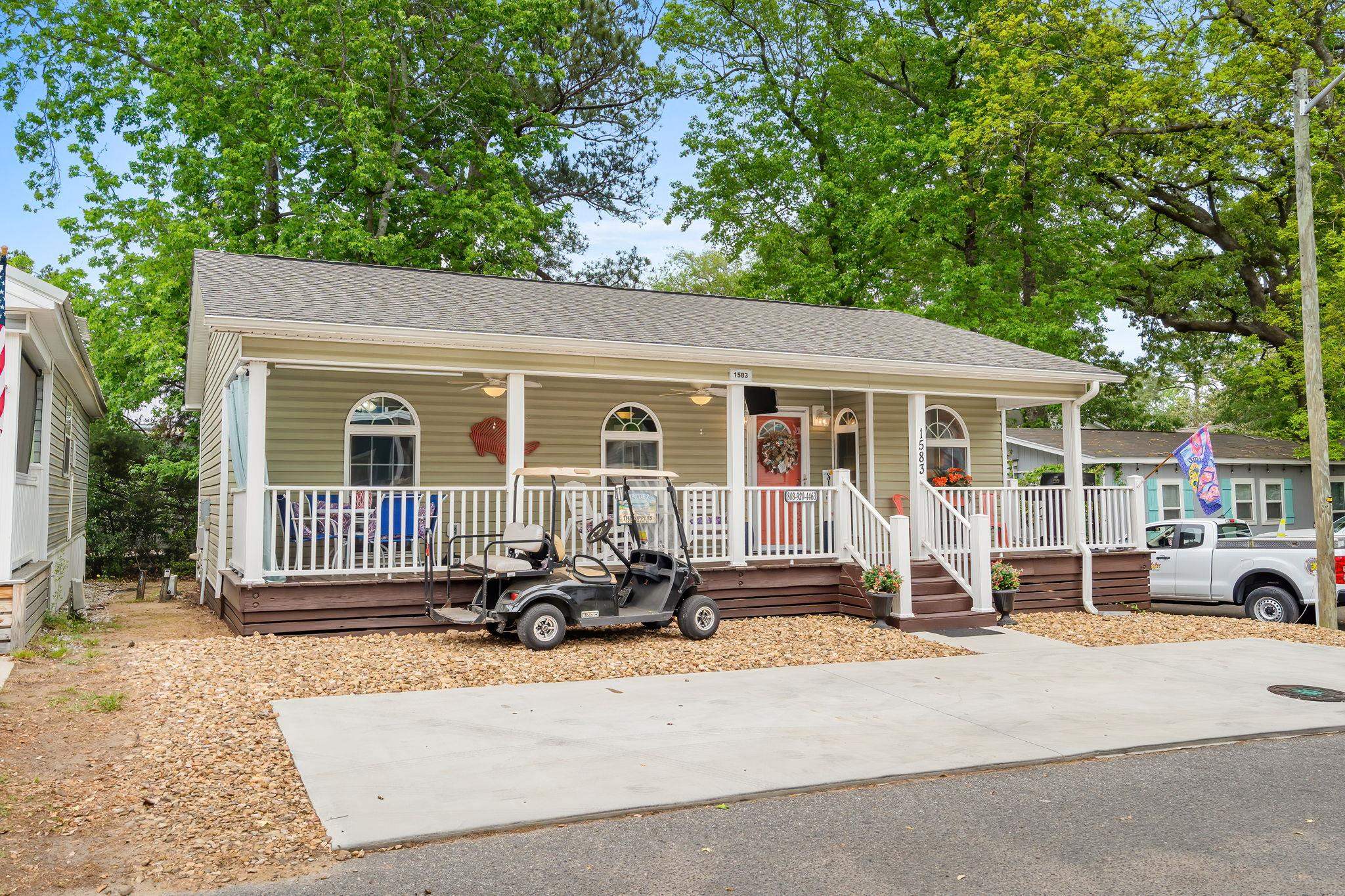 Welcome to 1583 Sharks Tooth Trail in Ocean Lakes! This is a spacious stick-built 3 bedroom 1.5 bathroom home on a corner lot with a private BACKYARD!! Enjoy relaxing on the large covered porch equipped with 2 ceiling fans, propane BBQ grill, plenty of seating and outdoor TV. The new concrete parking pad offers plenty of parking for 2 cars and golf cart. Inside you have a large living room with ceiling fan, couch with full size sofa sleeper, and tons of natural light. Open concept kitchen with dining area, kitchen island with kitchen sink, seating for 4 and high-top dining table with 4 seats. Side door off the dining area goes to the backyard. 2 of the bedrooms have queen beds and bedroom #3 has two twin beds. Primary bath has a tub/shower combo, additional 1/2 bath with toilet and sink. Stackable washer/dryer is located inside the home for added convivence! A home with a back year is RARE in Ocean Lakes, don't let this one get away. Being sold furnished. Golf cart is included. Great rental!