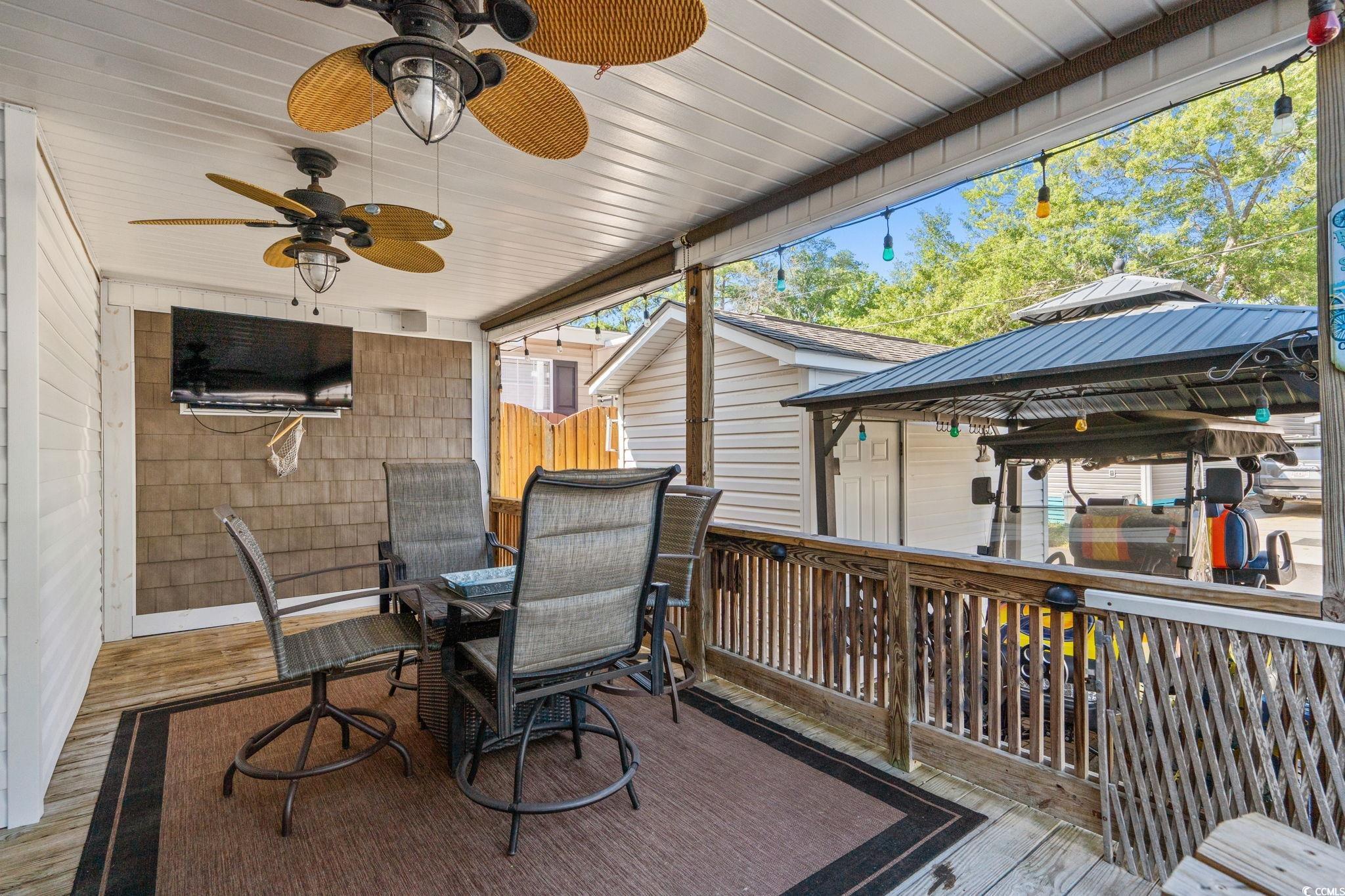 Welcome to 1614 Snapper Lane in Ocean Lakes. This 2 bedroom 2 bath home is being sold fully furnished (golf cart NOT included). Great outdoor entertaining space with the 2 gazebos, and covered large porch, 2 ceiling fans, fire pit, TV, and storage building. Going inside you have a large living room, to the left is bedroom #1 and full bath #1 with tub/shower condo. To the right is the kitchen with stainless steel appliances, breakfast bar, updated cabinets, full bath #2 with walk-in shower, washer/dryer, and bedroom #2 with bunkbeds. Home is not used as a rental, however Ocean Lakes is s short term rental community so new owner can use it as a short-term rental, primary home, or 2nd home.