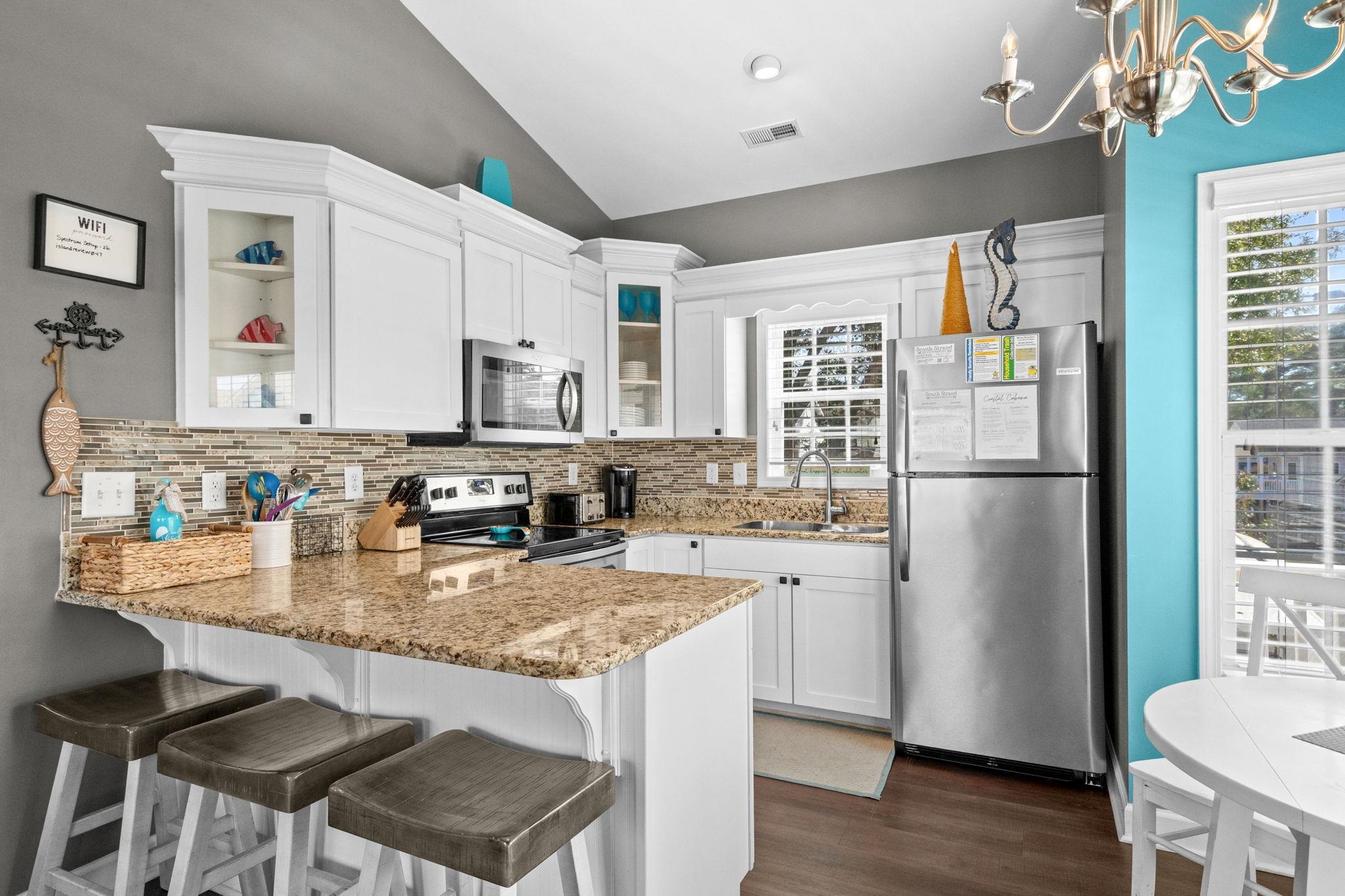 JUST LISTED! WELL UPDATED AND MAINTAINED 3 BED/2 BATH RAISED BEACH HOUSE WITH EXCELLENT OUTDOOR SPACE AND LOW LOT LEASE. Beautiful home inside and out with Tall Cathedral Ceiling, Granite Countertops, Updated Baths, LVP flooring, Breakfast Bar, Stainless Steel Appliances, Fresh Paint and a Spacious Open Concept Floor Plan. This turnkey home checks all the boxes and is ready for Spring. Sold fully furnished excluding outdoor poly furniture. Excellent rental history. Must honor 2026 rentals. Now Showing! All measurements are approximate and are not guaranteed. Buyers and their agent are responsible for verification. There is no HOA in Ocean Lakes however, the house is located on leased land, which is payed in two semiannual payments due in January and July. If you've never visited Ocean Lakes you must check this park out. Amenities abound in this gated, oceanfront community and include one mile of privately accessed pristine white sand beach, 24 hour security, free trash pick-up, free cable TV, indoor/outdoor swimming pools, large water park/slides, lazy river, kid's splash zone, new dog park, new beachside coffee house and ice cream bar, playgrounds, full size basketball courts, miniature golf, fire pit, corn hole, shuffle board, horseshoes, ping-pong, Sandy's Down-under skatepark, recreation building, arcade, general store, golf cart rentals, Sandy's Meet & Eat restaurant and more!
