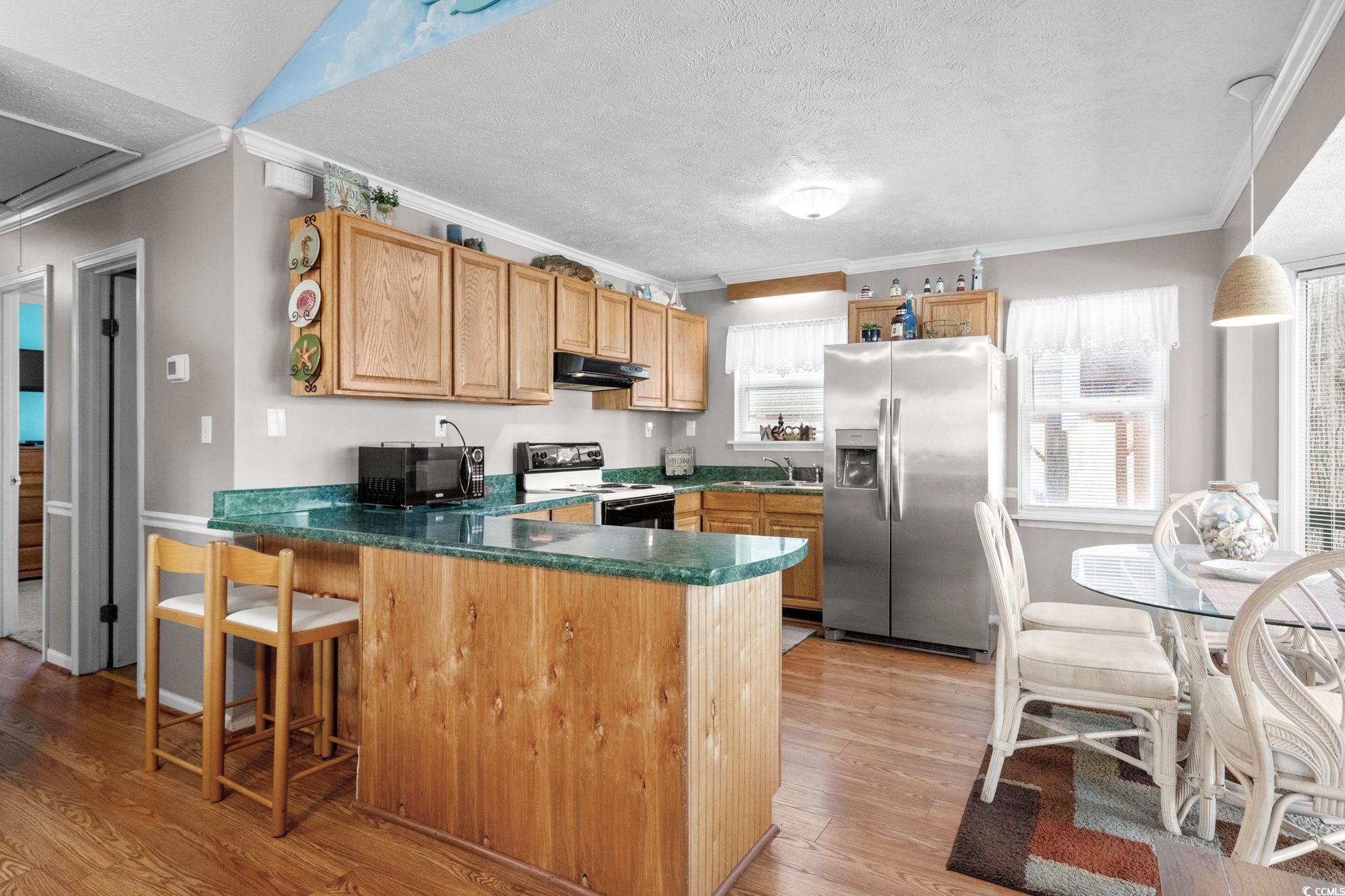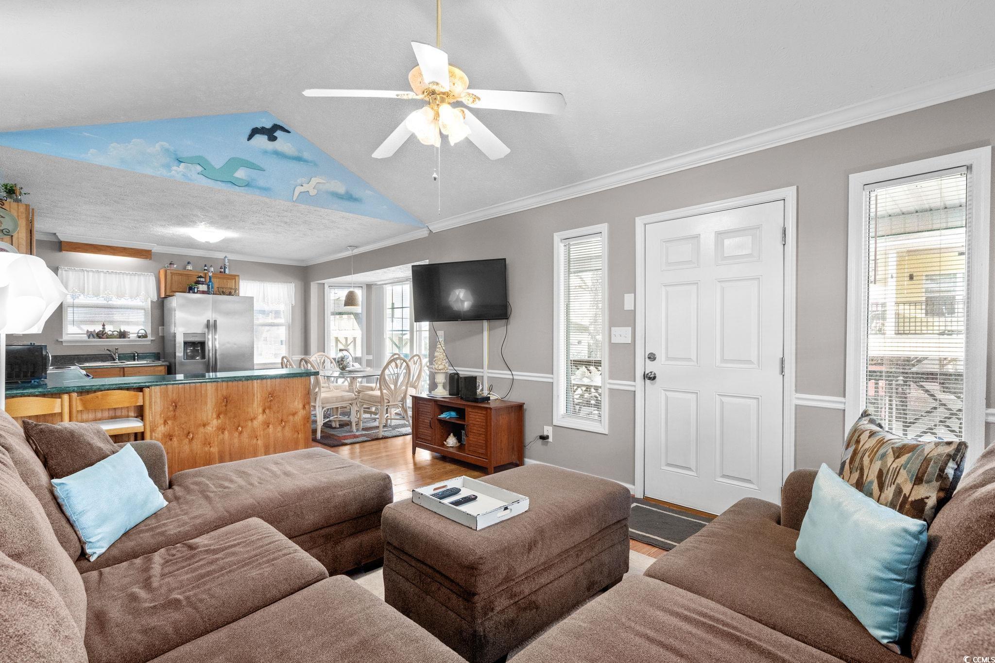 Clean and inviting 2BR/2BA beach home located in the highly desirable Ocean Lakes Family Campground. This home comes fully furnished and features a spacious porch with ceiling fans and a detached storage shed. The open living area offers a vaulted ceiling, large sectional seating, flat-screen TV, and a hand-painted wall mural that adds a coastal touch. The kitchen features oak cabinetry, refrigerator, stove, microwave, and a large island with breakfast seating. Wide-plank laminate flooring runs throughout the living room and kitchen, with carpet in the bedrooms and ceramic tile in both bathrooms. Crown molding is featured throughout the home. Both bedrooms are nicely sized, with the primary bedroom offering a queen bed and the guest bedroom a full-size bed. Flat-screen TVs are located in both bedrooms. Additional features include a whole-house attic fan and pull-down attic stairs for convenient storage. Ocean Lakes is a 310-acre gated oceanfront community with nearly one mile of pristine beachfront and 24-hour security. Amenities include multiple outdoor swimming pools, Sandy Harbor Water Park, basketball courts, shuffleboard, cornhole, horseshoes arcade, putt-putt, an recreation center and allows short-term rentals, offering great rental potential for investors or vacation homeowners. Enjoy easy golf cart access to the beach, as well as nearby shopping, dining, entertainment, and all that Myrtle Beach has to offer.
