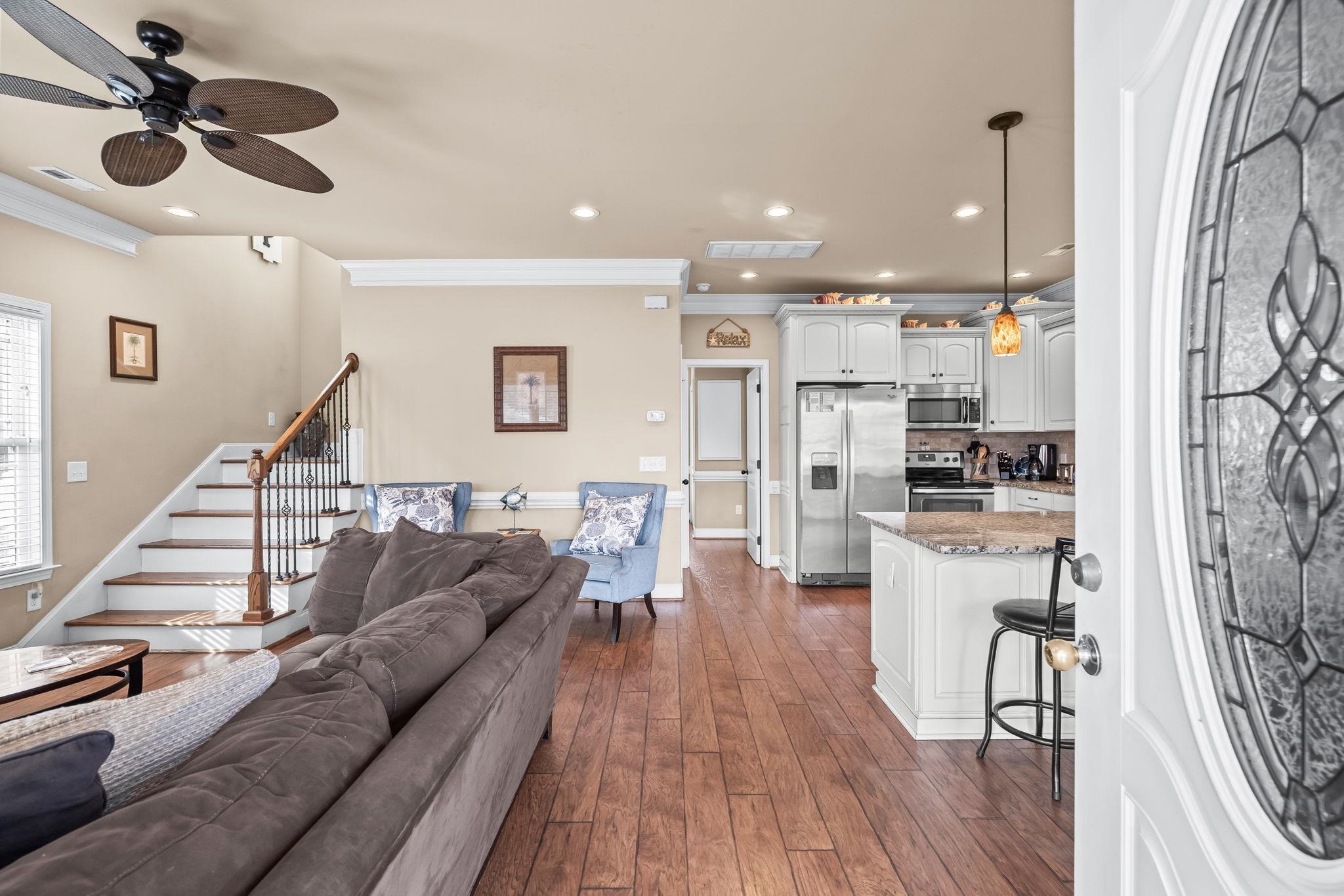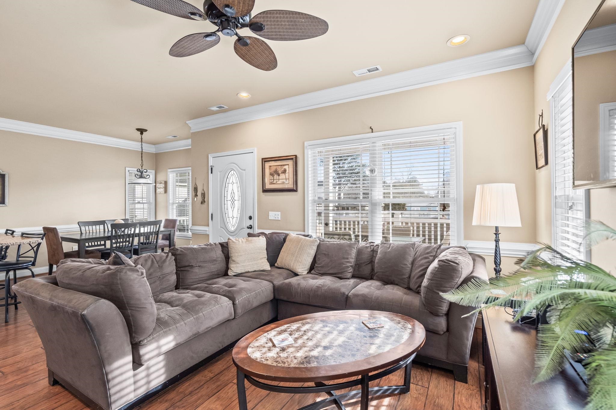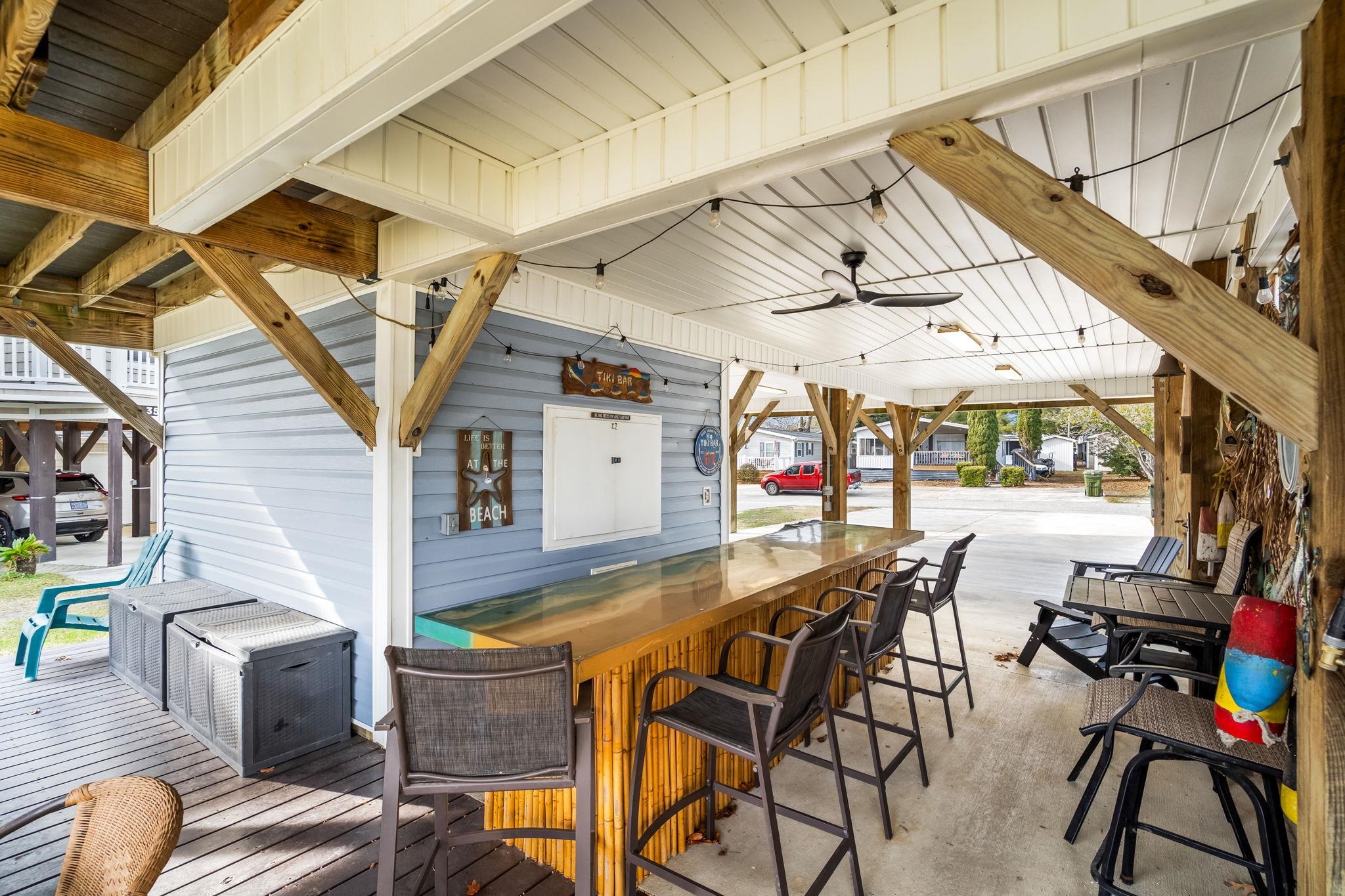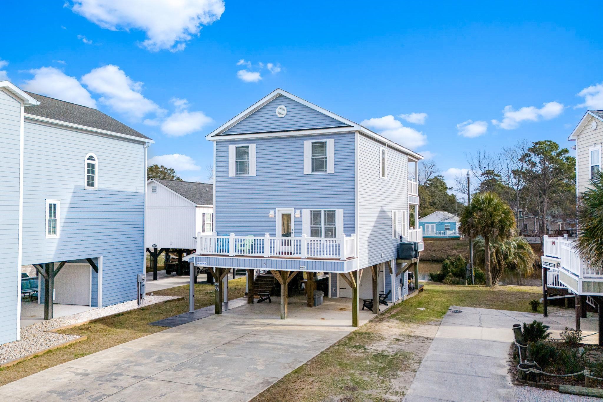 This beautiful 5-bedroom, 3.5-bath two-story raised beach home is truly one of a kind in Ocean Lakes. Sitting on a rare double lot along Magnolia Lake, it offers tons of parking, a real backyard, a brand-new seawall, composite decking, a private tiki bar, and yes — a golf cart is included. Built in 2018 and being sold fully furnished, this home is completely move-in ready and finished with thoughtful details like crown molding and stainless steel appliances. The home has only been rented through referrals and has grossed approximately 50,000 annually, highlighting its strong rental appeal. With its size, layout, lakefront setting, and rare features, this property offers excellent short-term rental potential. Located inside Ocean Lakes Family Campground, owners and guests enjoy access to pools, a water park, lazy river, arcade, and direct beach access. Homes with this much space, outdoor living, and parking are extremely hard to find.