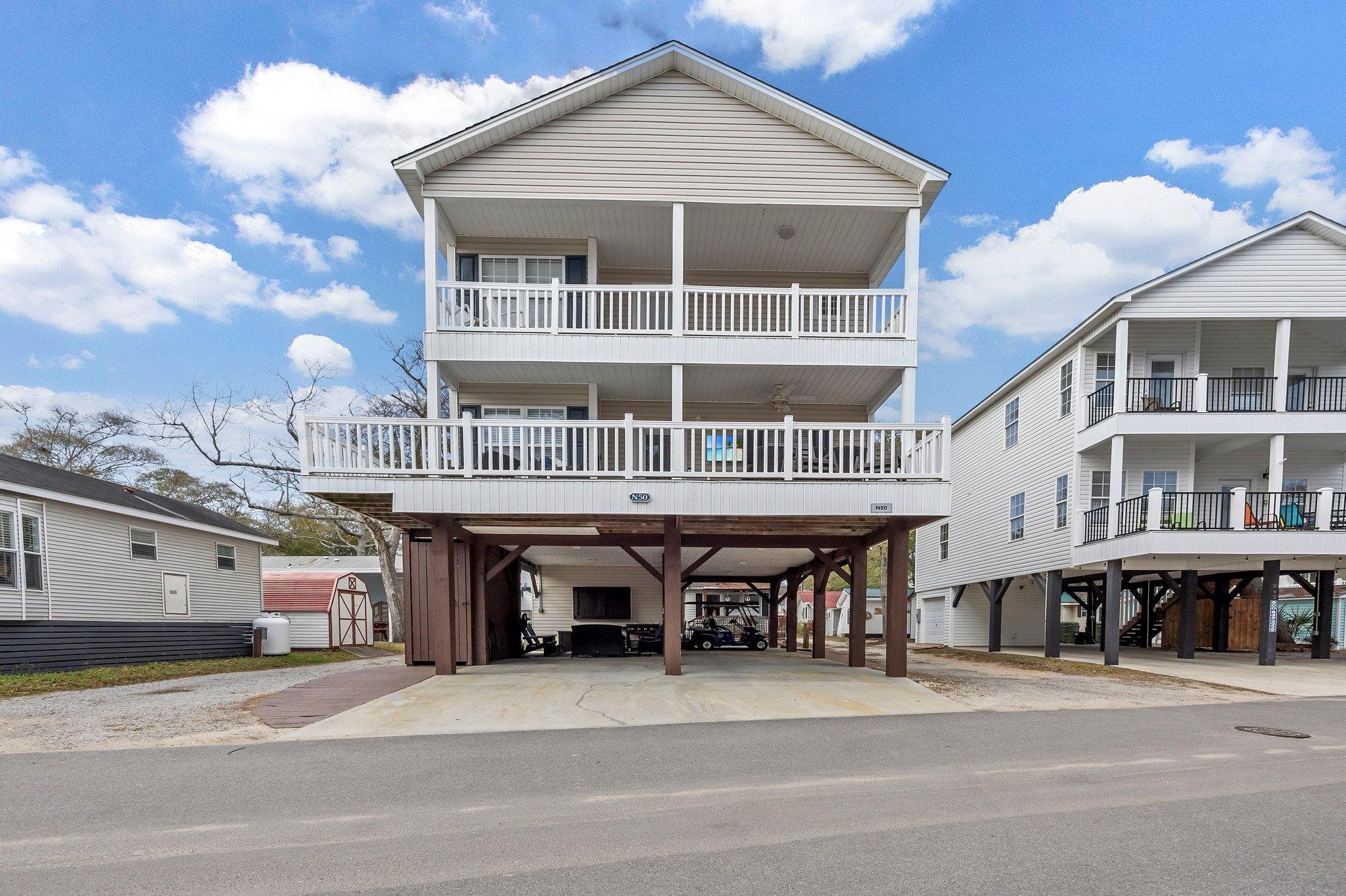LOCATION! LOCATION! LOCATION! N-50 is calling your name! Come indulge in all the amenities of Ocean Lakes along the Grand Strand with this beautiful beach home. This spacious 4-bedroom, 3.5-bath residence is designed to create lasting memories year-round for all ages. The home features generously sized bedrooms, including a large primary bedroom on both floors. Additionally, there are four decks surrounding the property, providing ample space for sunbathing, socializing, and enjoying the shade and breeze throughout the year. This home is ideal for full-time living or as a second home and rental property. The open layout of the main floor is perfect for game nights and social gatherings with friends and family. The fully equipped kitchen is perfect for hosting meals and entertaining guests. N-50 boasts several recent upgrades, including new furniture, new kitchen countertops and appliances, upgraded laminate vinyl plank flooring, a newly constructed main deck, and fresh interior paint. The property also offers convenient parking beneath the home, a recently added entertainment area with seating and a television, and a storage garage for beach toys and other essentials. Located centrally in Ocean Lakes, the home provides easy access to park attractions such as the campground store, snack shacks, arcade, dog park, nature center, lazy river, water slides, indoor pool, a miniature golf course, and a recreation center with daily events and so much more. The ocean is directly accessible from either end of the street, and guests can explore the area on golf carts, bicycles or beautiful walks. N-50 has great rental income history due to its well-maintained condition and wonderful repeat guest. While Ocean Lakes does not have an HOA, there is a yearly lot lease; split into 2 payments. With your lease, Ocean Lakes offers 24-hour security, gated entry, a mile of beachfront access, year-round activities for all ages, trash and recycling service, enhanced cable television service and a wide range of amenities all included. Experience the allure of Ocean Lakes and admire this meticulously designed home. Schedule your showing today!