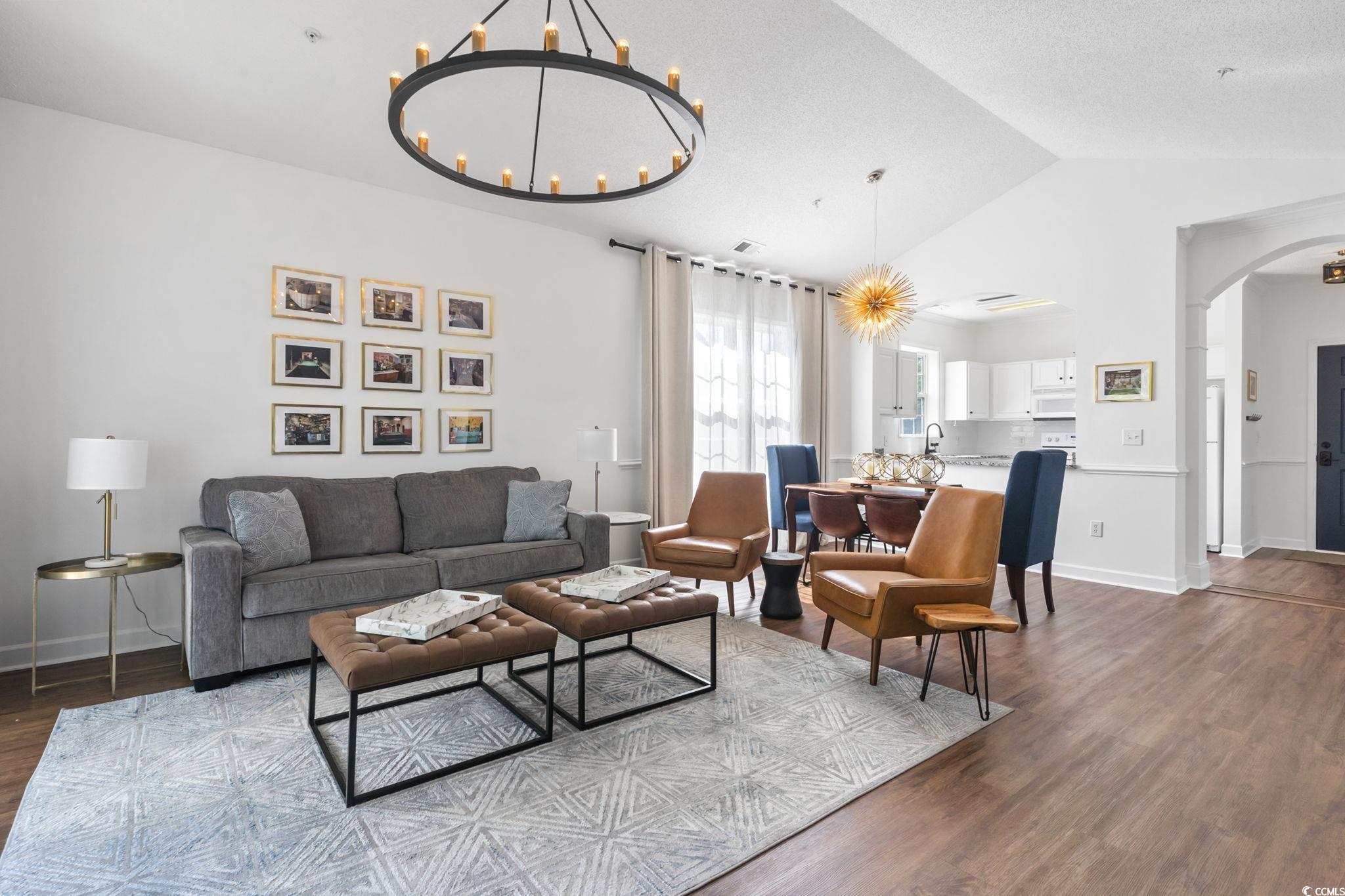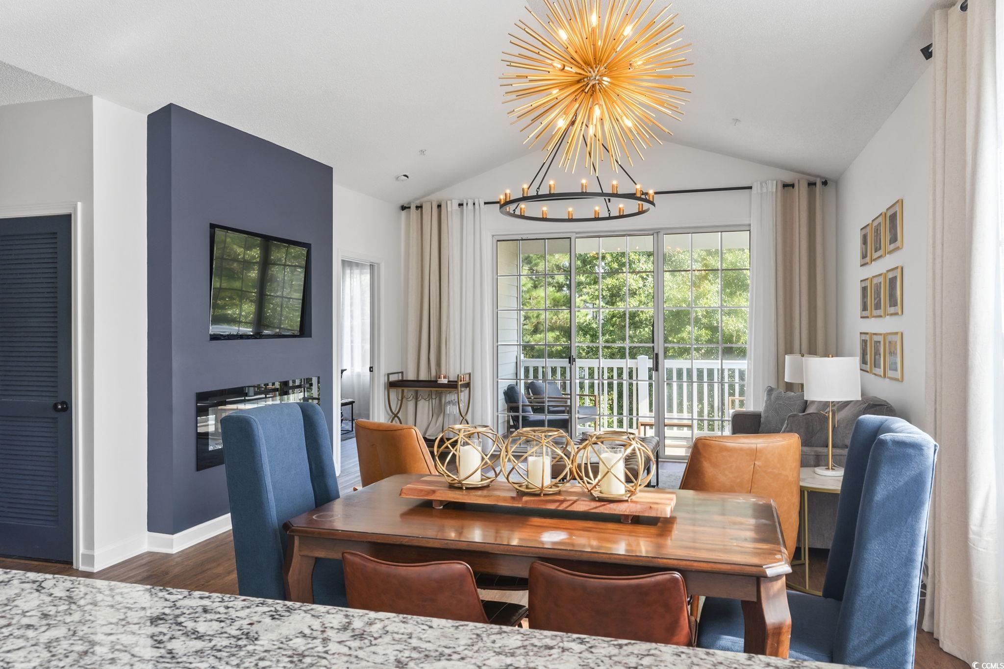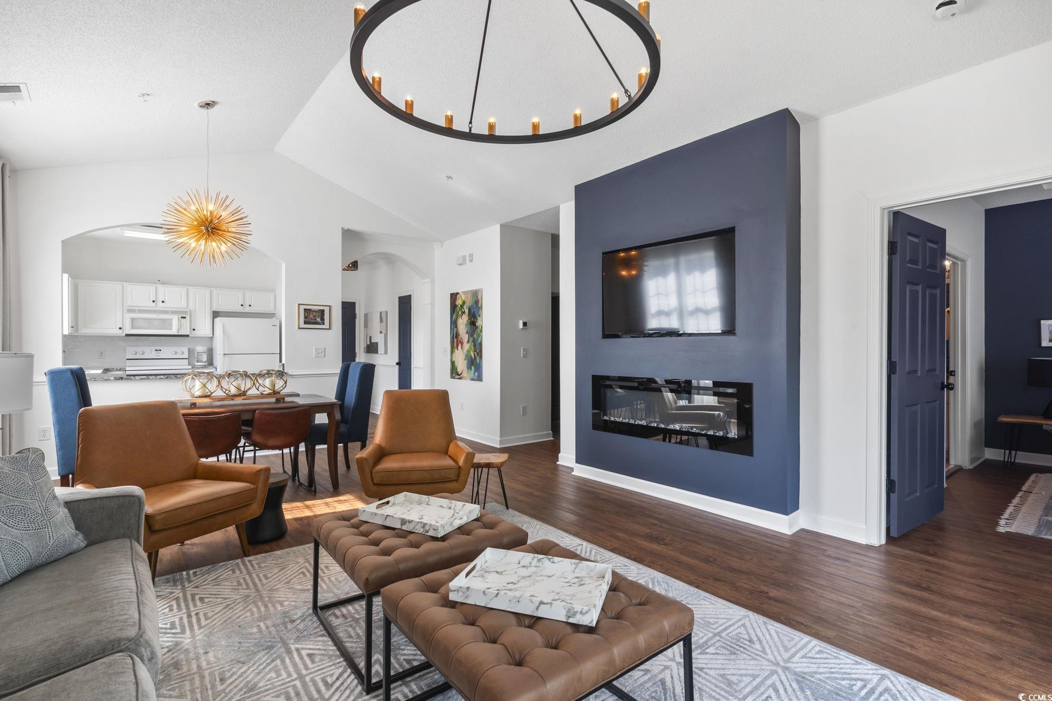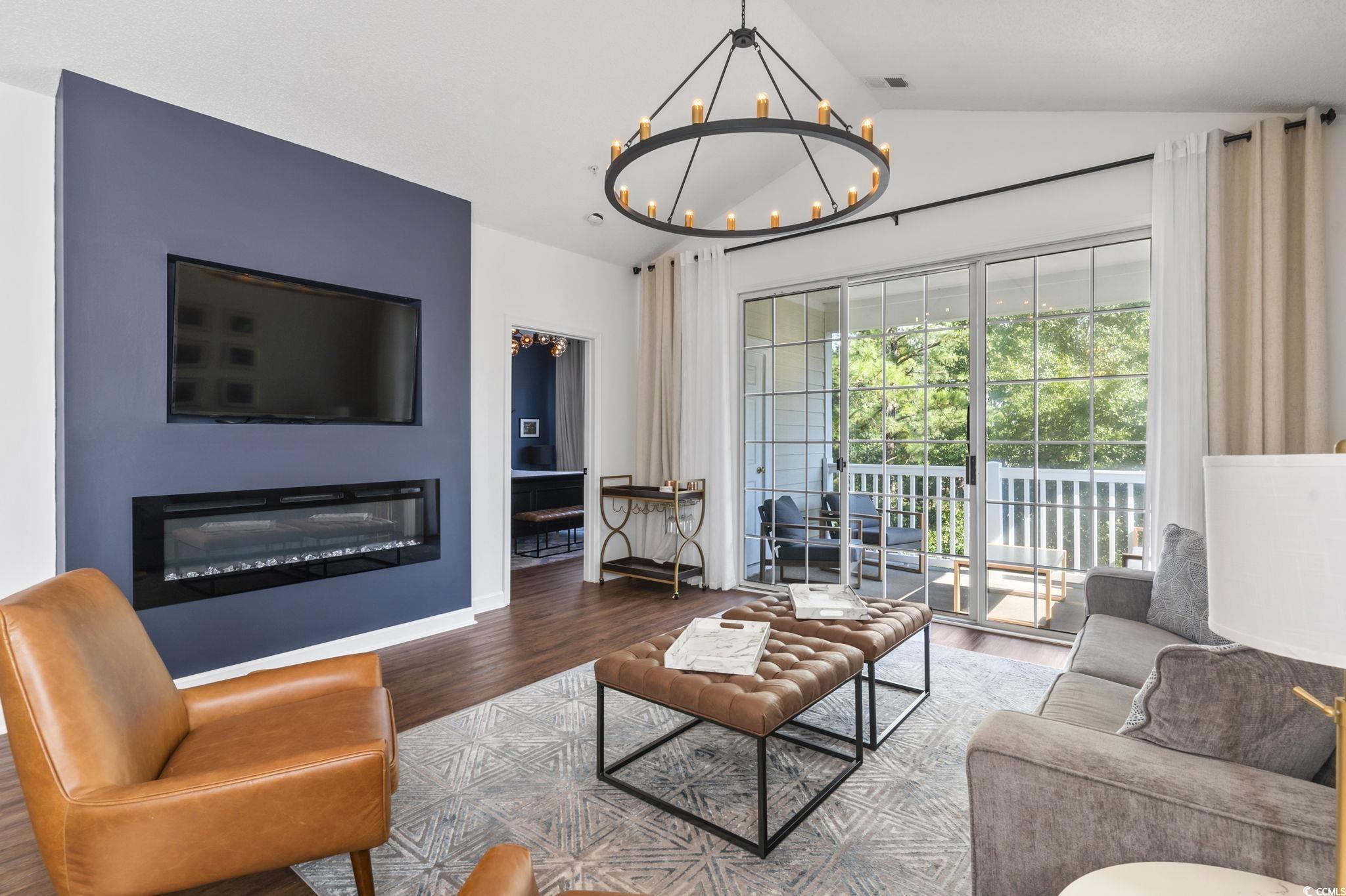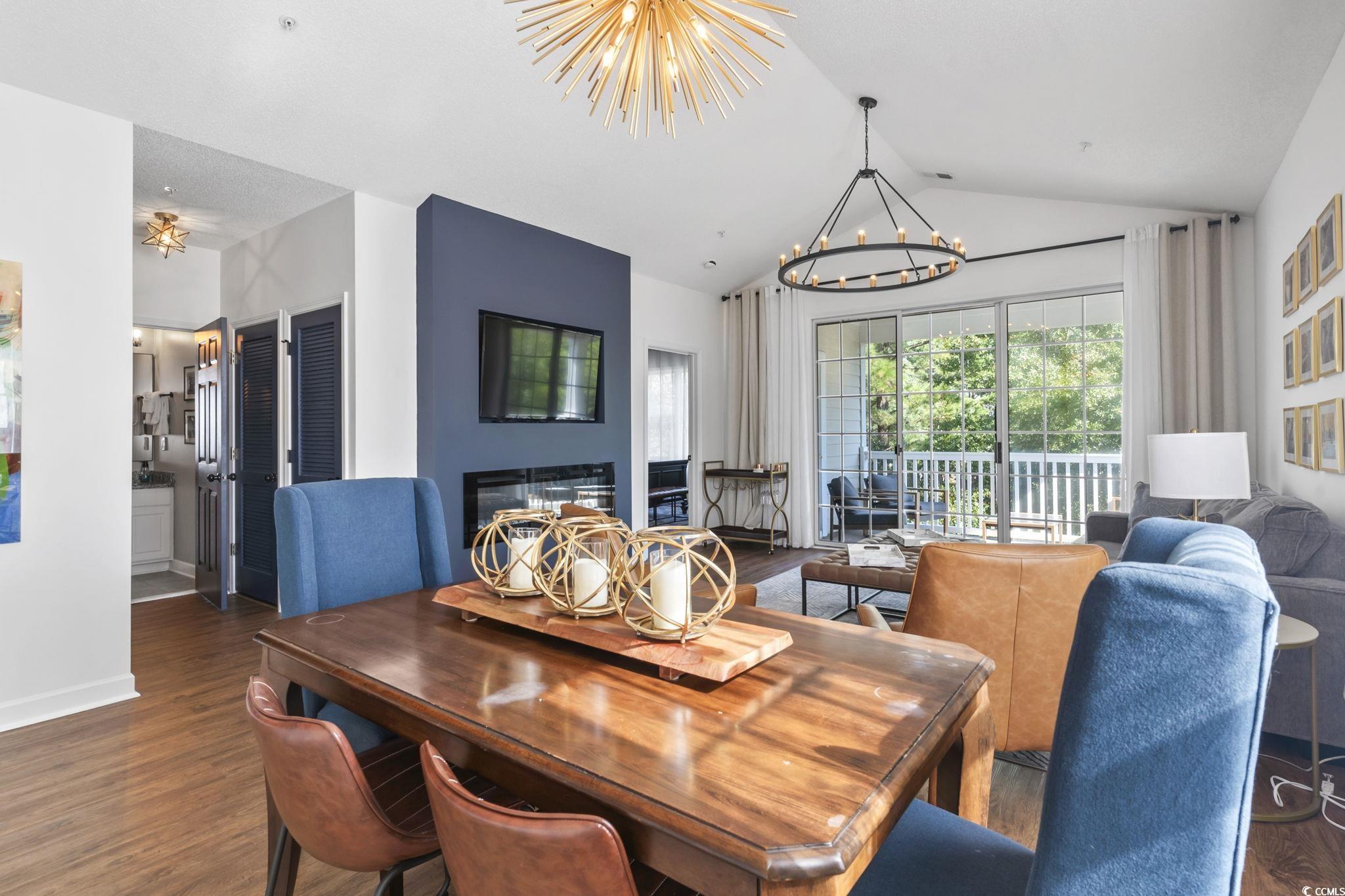 Don't miss this stunning top-floor end unit—truly one of a kind! This beautifully updated condo features two bedrooms, including a spacious primary suite with an ensuite bath. Soaring vaulted ceilings and abundant natural light create a bright, airy atmosphere throughout. Relax on your private porch overlooking the golf course or cozy up in front of the built-in electric fireplace. The kitchen boasts solid surface countertops and a breakfast bar—perfect for casual dining or entertaining. Luxury vinyl plank flooring adds warmth and durability in the main living areas and bedrooms, while tile accents the bathrooms for a clean, modern touch. Tastefully updated and available fully furnished, this unit is move-in ready. A transferable golf membership is available for a fee. Located in the highly sought-after Barefoot Resort, residents enjoy access to four championship golf courses, two on-site restaurants, a marina, convenience store, and liquor store. Relax at the private community pool, or enjoy the expansive North Tower Pool overlooking the Intracoastal Waterway. Owners also have exclusive access to the oceanfront Cabana, with seasonal shuttle service to the beach. With entertainment, shopping, and dining just minutes away, this is your chance to live the Beach Life in style!
