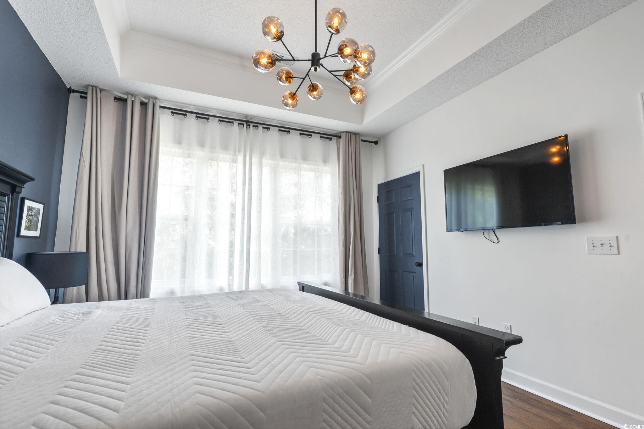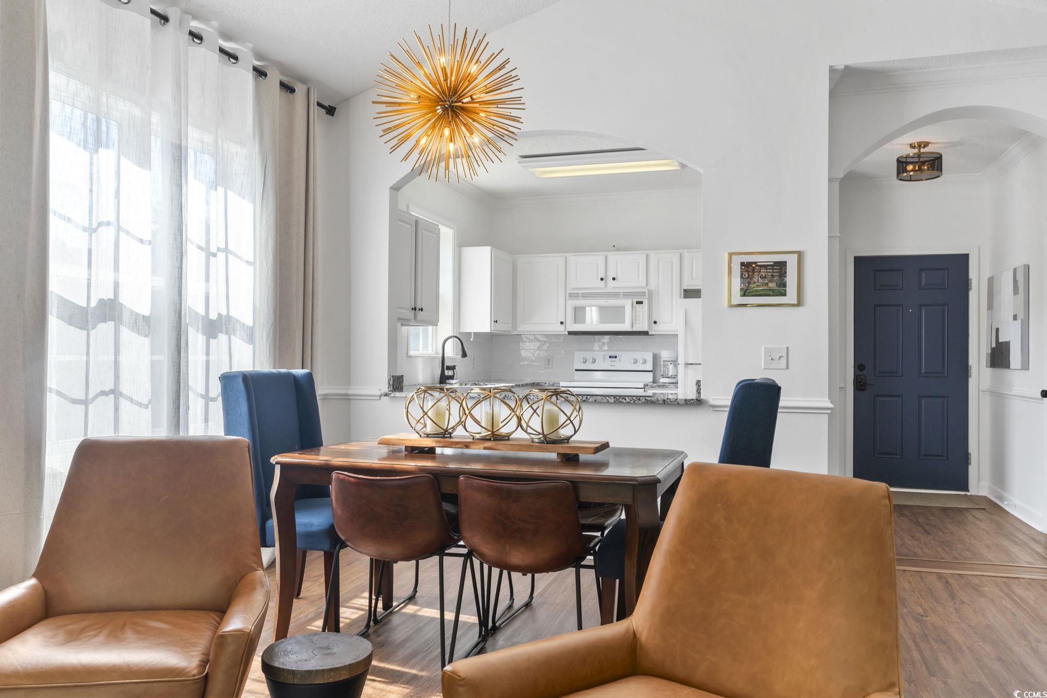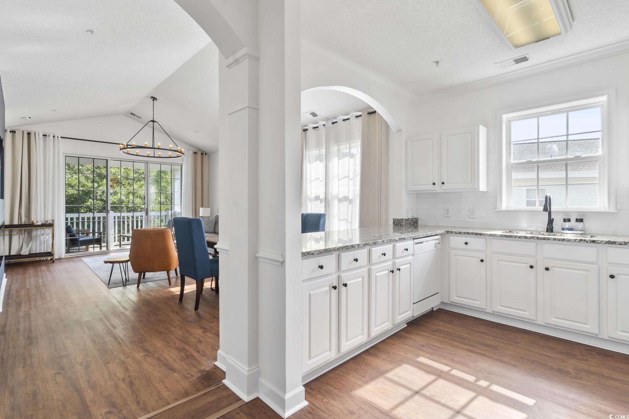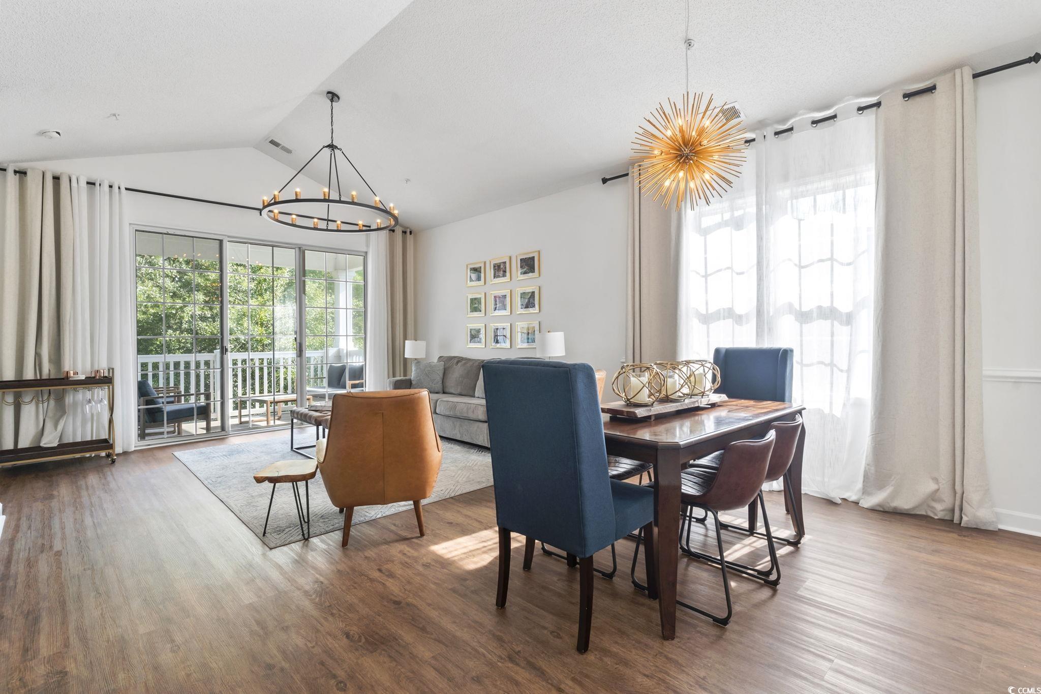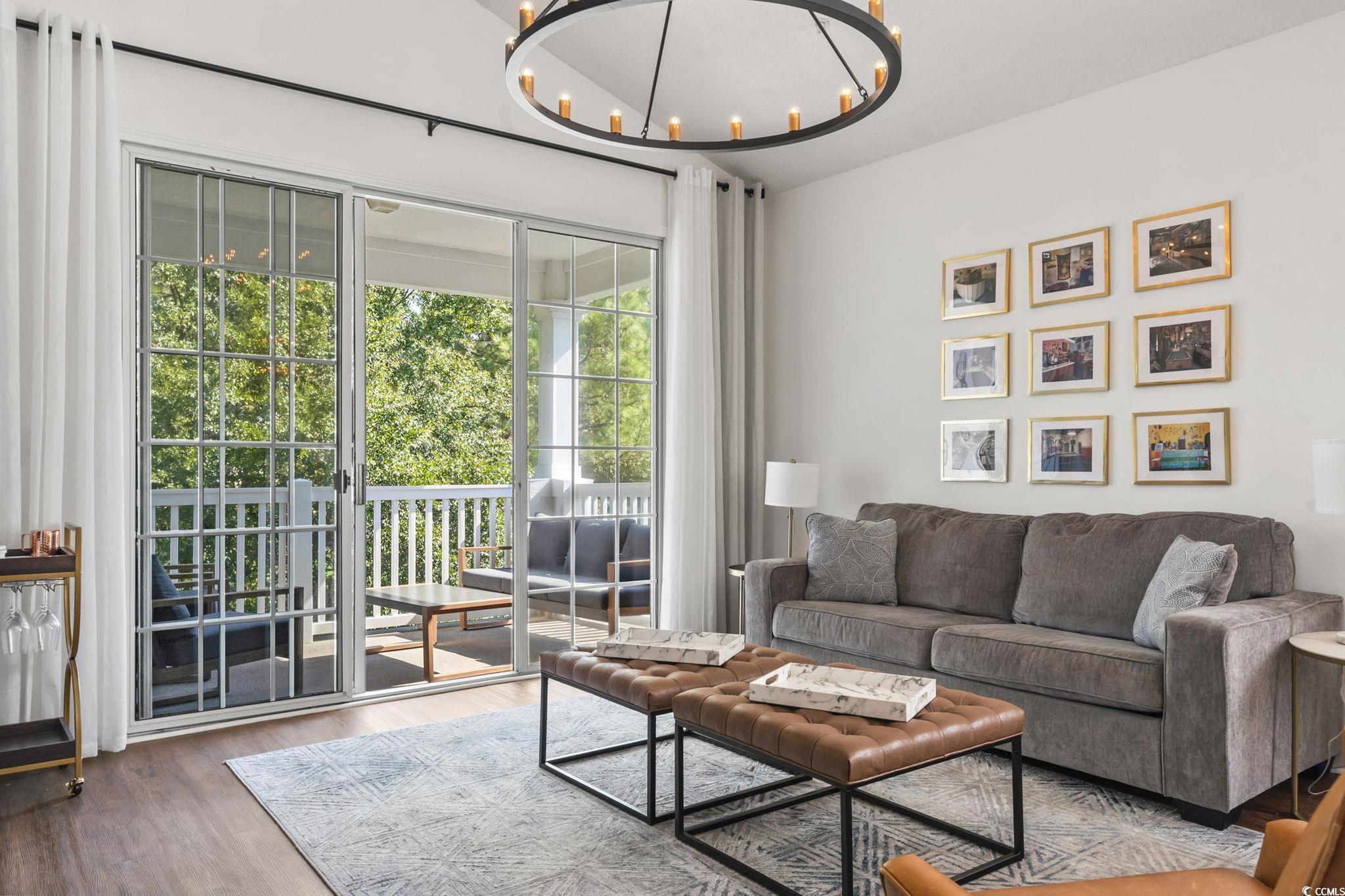 Don't miss this stunning top-floor end unit—truly one of a kind! This beautifully updated condo features two bedrooms, including a spacious primary suite with an ensuite bath. Soaring vaulted ceilings and abundant natural light create a bright, airy atmosphere throughout. Relax on your private porch overlooking the golf course or cozy up in front of the built-in electric fireplace. The kitchen boasts solid surface countertops and a breakfast bar—perfect for casual dining or entertaining. Luxury vinyl plank flooring adds warmth and durability in the main living areas and bedrooms, while tile accents the bathrooms for a clean, modern touch. Tastefully updated and available fully furnished, this unit is move-in ready. A transferable golf membership is available for a fee. Located in the highly sought-after Barefoot Resort, residents enjoy access to four championship golf courses, two on-site restaurants, a marina, convenience store, and liquor store. Relax at the private community pool, or enjoy the expansive North Tower Pool overlooking the Intracoastal Waterway. Owners also have exclusive access to the oceanfront Cabana, with seasonal shuttle service to the beach. With entertainment, shopping, and dining just minutes away, this is your chance to live the Beach Life in style!