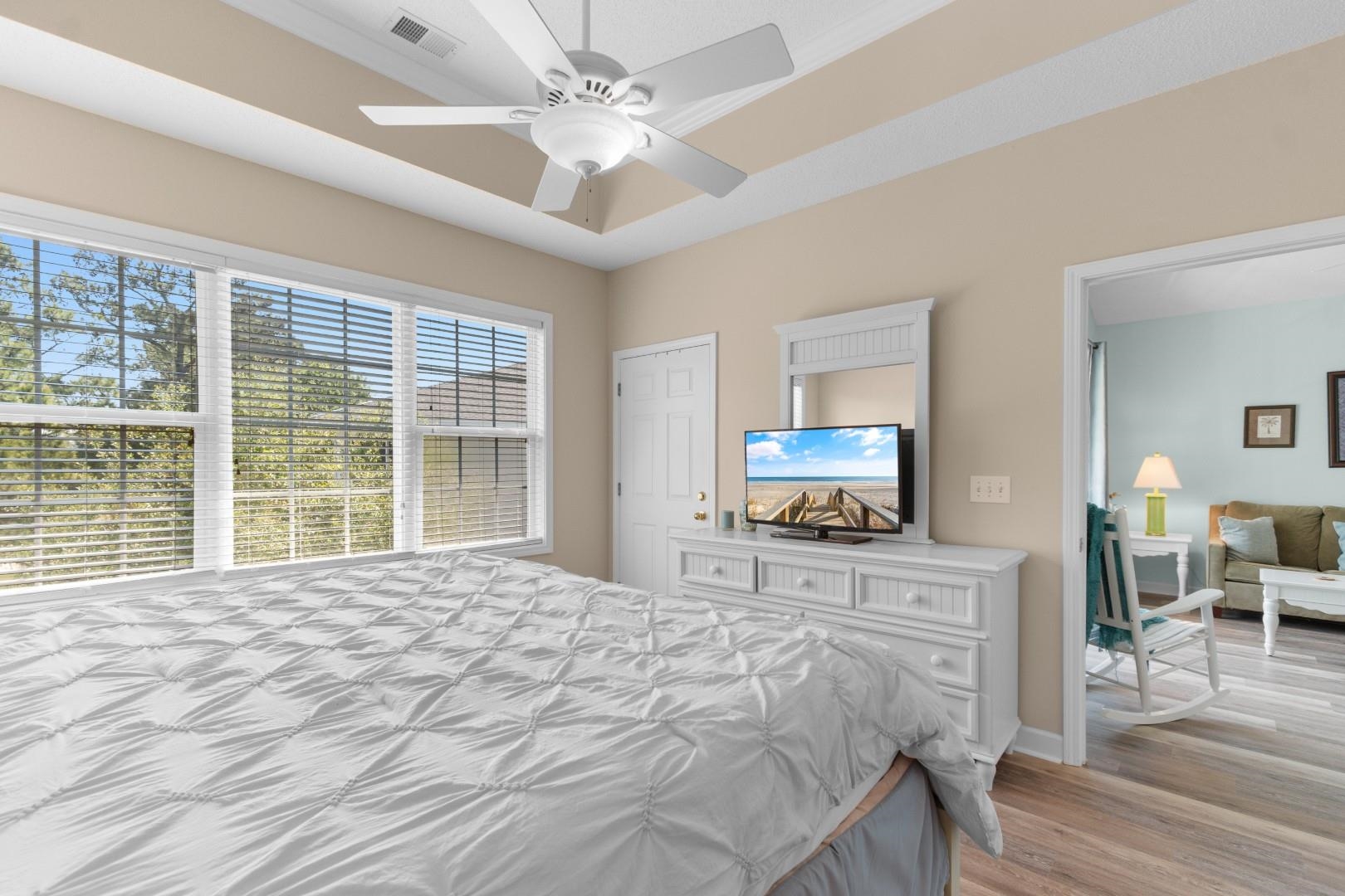 Perched on the top floor as a desirable end unit, this beautifully maintained 2-bedroom, 2-bath condo in the Arbor Trace community of Barefoot Resort offers the perfect blend of comfort, privacy, and coastal charm. Fully furnished and move-in ready, it invites you to step right into the relaxed lifestyle you've been dreaming of. From the moment you enter, you'll notice how natural light fills the open living and dining area, enhanced by soaring vaulted ceilings that create an airy, welcoming atmosphere. Brand-new luxury vinyl plank flooring installed in 2026 flows throughout the home--excluding the kitchen and bathrooms--adding a fresh, modern touch while ensuring durability and easy maintenance. Whether you're enjoying a quiet evening or entertaining guests, the space feels effortlessly inviting. Step outside onto your private balcony and take in peaceful views of the lush golf course---the perfect backdrop for morning coffee or a relaxing sunset. It's the kind of setting that makes every day feel like a getaway. Designed for both everyday living and unforgettable escapes, this turnkey residence offers the ease of ownership in one of the Grand Strand's most sought-after resort communities. Barefoot Resort is renowned for its four championship golf courses, two multi-million clubhouses, and four on-site restaurants. Residents also enjoy exclusive access to a private beach cabana with seasonal shuttle service, along with the spectacular 15,000-square-foot saltwater pool overlooking the scenic Barefoot Marina. Whether you're searching for a primary residence, a vacation retreat, or a smart investment opportunity, this top-floor gem delivers the very best of resort-style living in North Myrtle Beach. Come experience why life at Barefoot Resort feels like a permanent vacation.